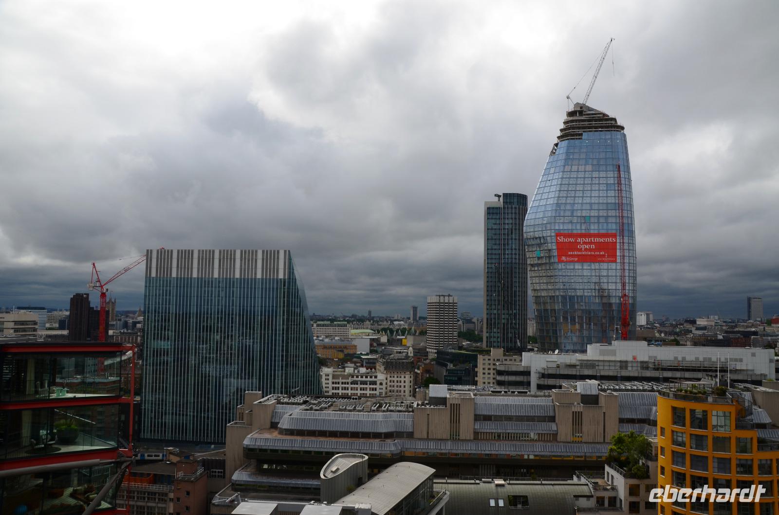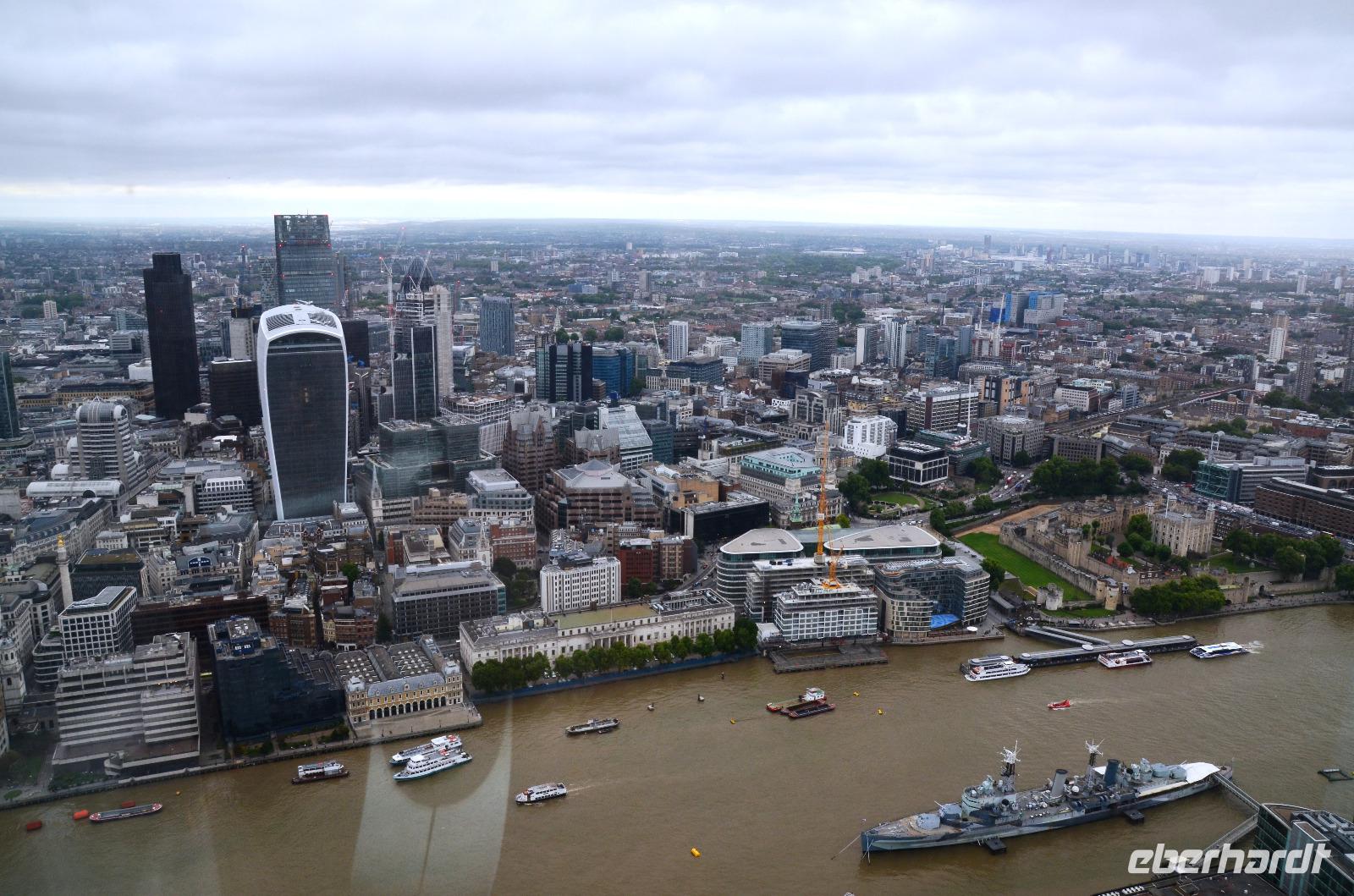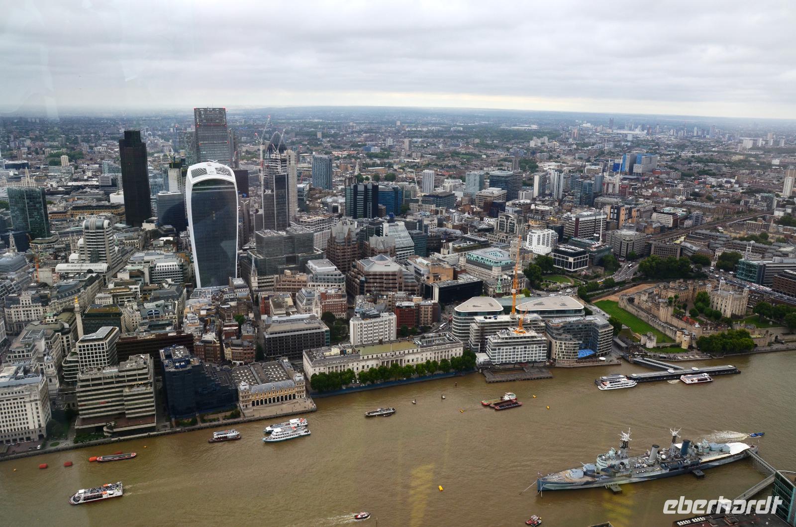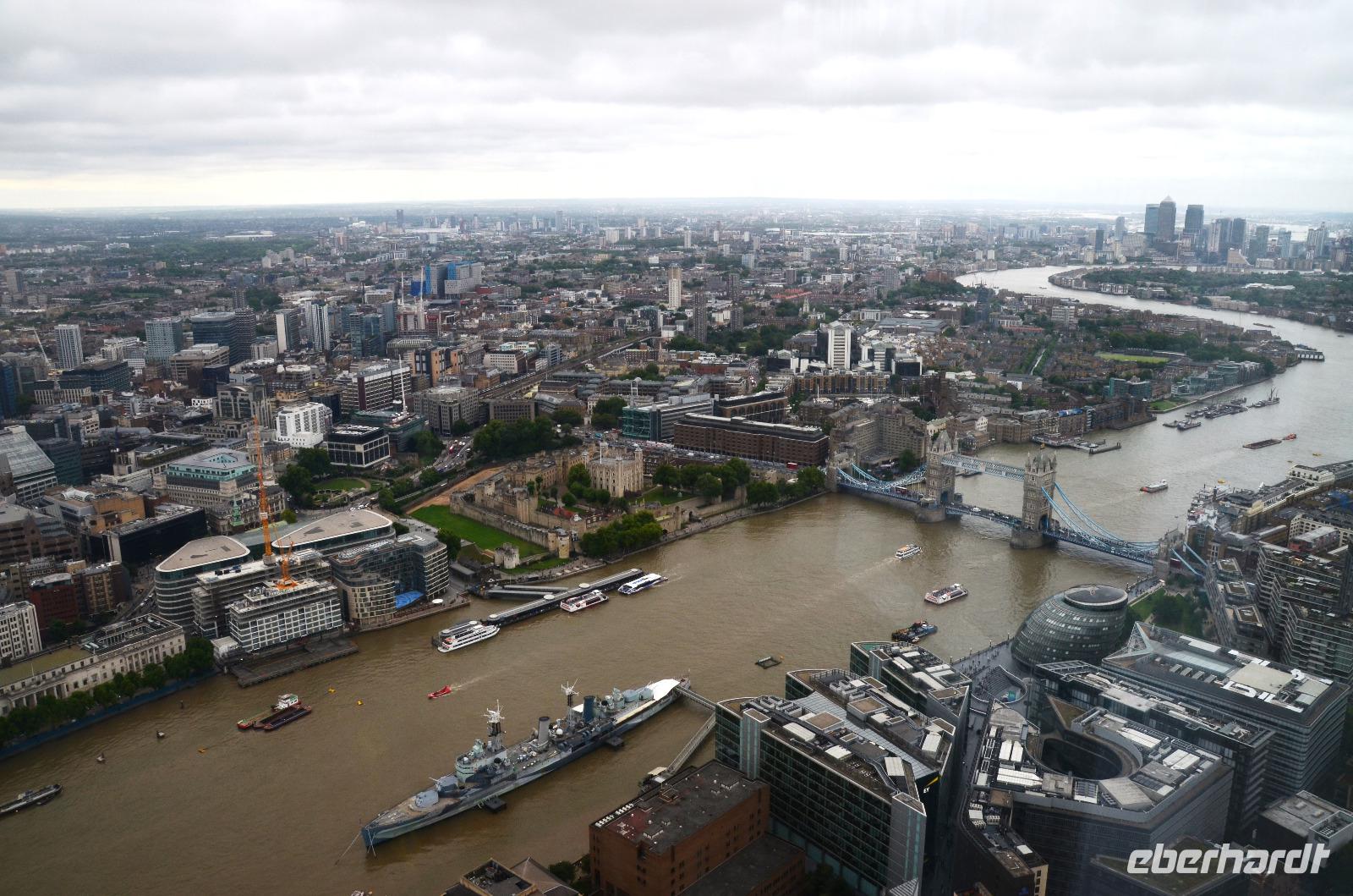 Mit dem Bus 24 fahren wir zurück zur Westminster Station und von hier mit der Jubilee Line nach London Bridge. Durch die Shard-Galeria gelangen wir schnell zum „Shard"-Hochhaus - machen die gemeinsame Auffahrt und genießen die tolle, einfach überwältigende Aussicht mit einem Glas Sekt. Im Fischrestaurant am Borough Market klingt der schöne Tag bei einem gemeinsamen Umtrunk und der herzlichen Verabschiedung von Ulla aus.