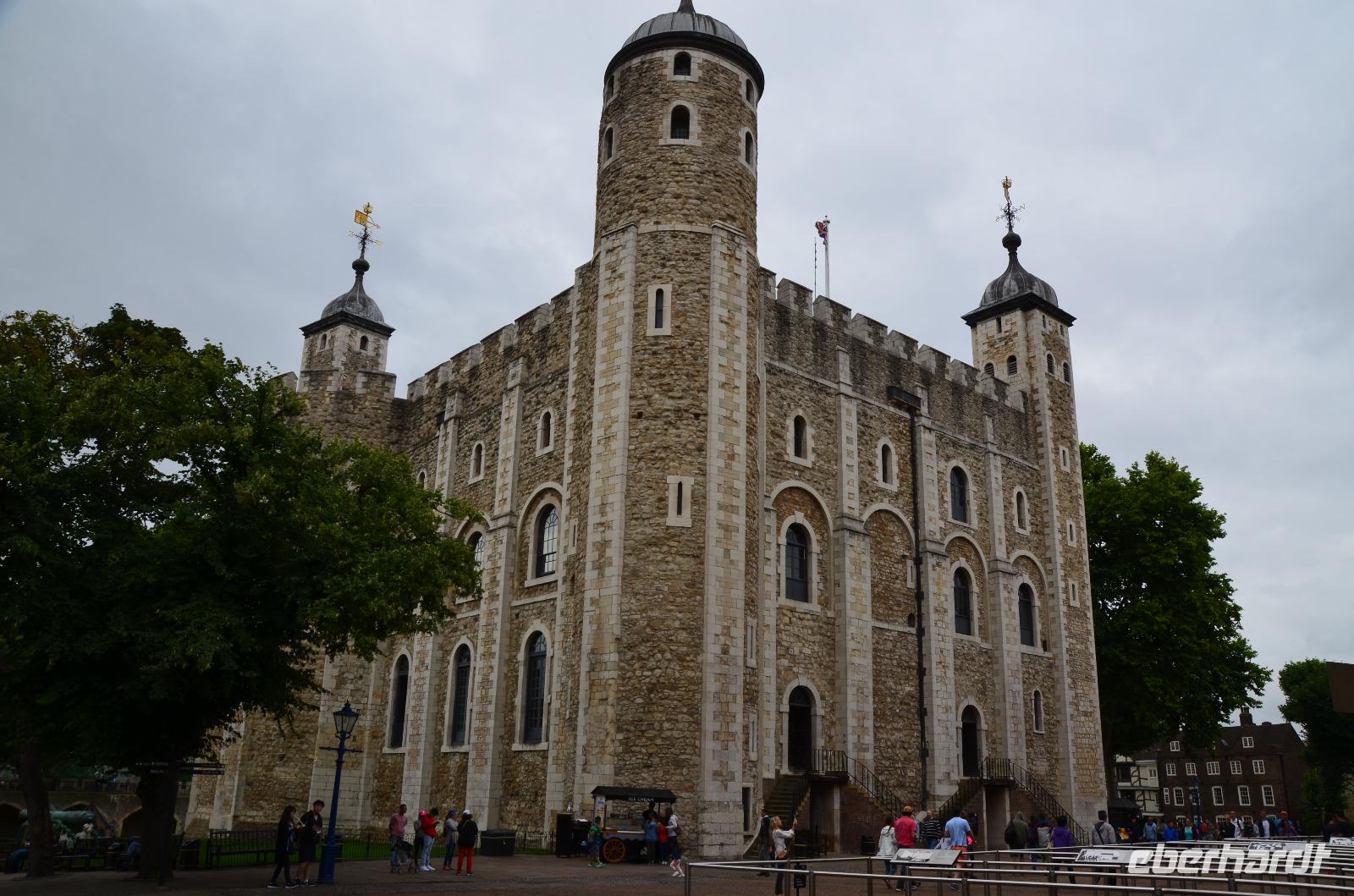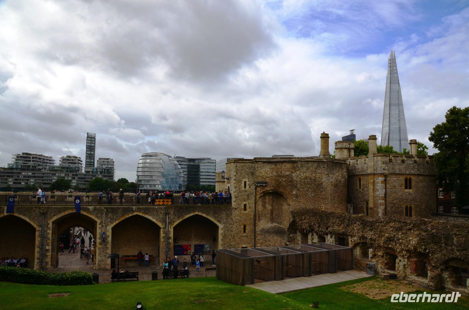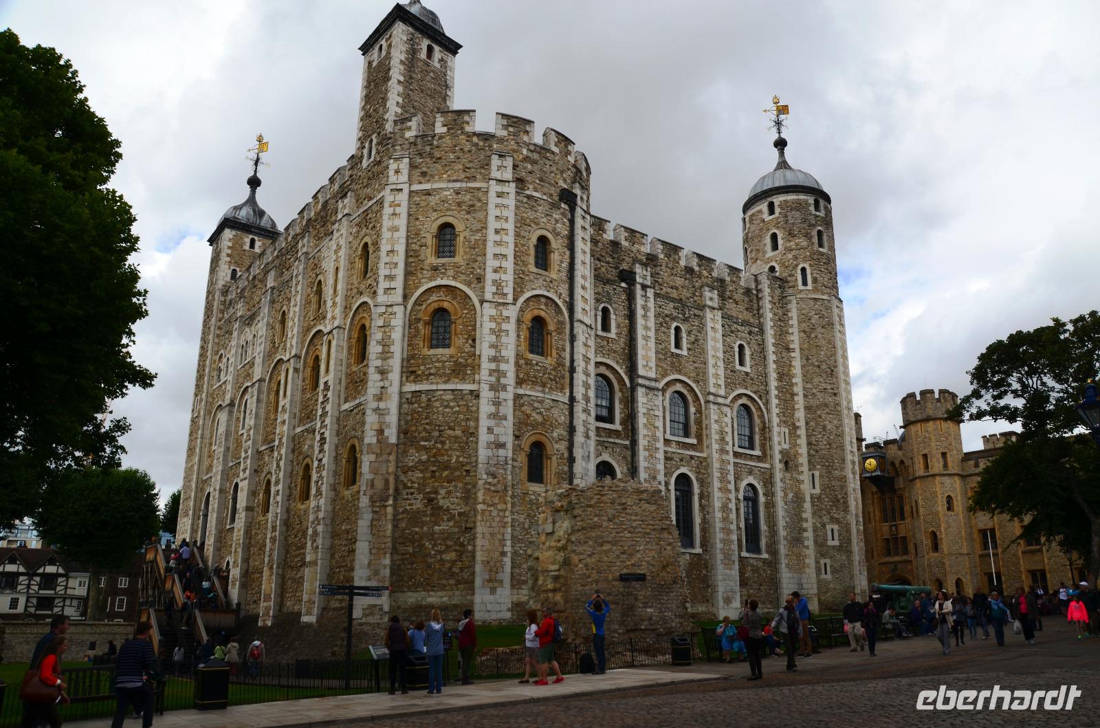Die gemeinsame Tube-Fahrt bringt uns heute zum Tower of London. Dazu spazieren wir bis zur nahen Station Bayswater und nehmen ab hier die Circle Line bis Tower Hill. Die Tickets sind mit dem Voucher schnell geholt, Übersichtsplänen ausgeteilt und dann geht es durch die stark befestigten Tore hinein in eines der ältesten Bauwerke Londons. Das heißt, eigentlich ist es der Weiße Turm, heute mit der Rüstkammer versehen, ist der Keep aus der Zeit Wilhelm des Eroberers.