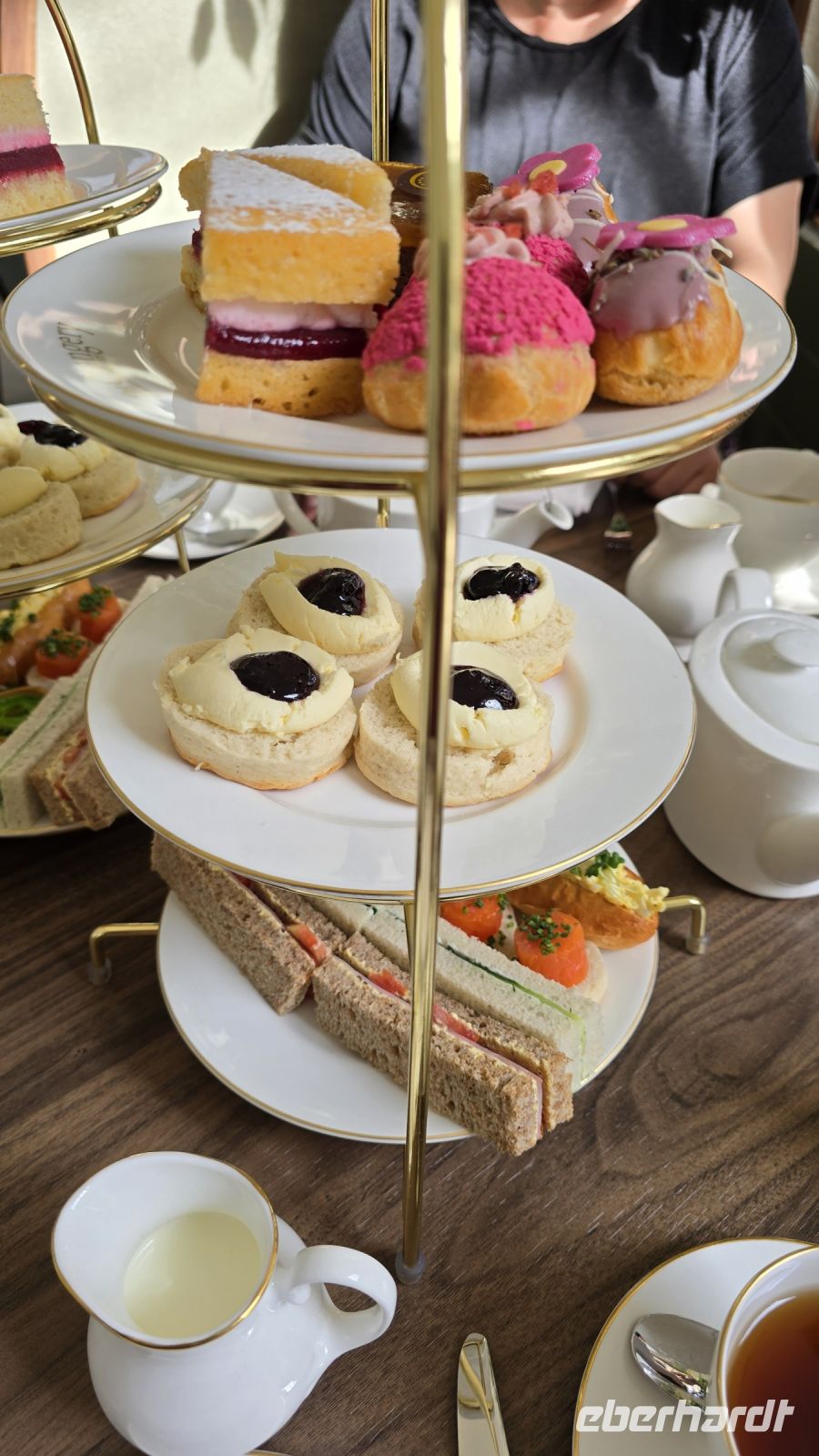 Wir starten wieder nach einem sehr guten Frühstück um 9.00 Uhr. Mit dem Bus geht es Richtung Norden, es ist Wochenende, der Berufsverkehr fällt aus und wir sehen mehr von der Stadt als in der Metro. Unser Ziel heißt: Camden Town. In den 70 er Jahren des letzten Jahrhunderts ein Szenetreff der Punks und Gothics. Heute hippes Pflaster mit Märkten und Märkten und Märkten... Wir sind sehr zeitig, die meisten bauen erst ihre Stände auf, wir können aber in Ruhe bummeln, in ca. einer Stunde ist hier alles voll und ein pures Gedränge. Natürlich statten wir der Statue von Amy Winehouse einen Besuch ab, sie lebte hier in Camden. Früher waren hier die Pferdeställe unter der Brücke, die Pferde treidelten die Boote den Kanal hinauf und hinunter, heute sind in allen Bögen Läden und Garküchen. Ein Hinweis von mir zum Anleger unseres Bootes nach Little Venice und dann war Zeit für individuelle Erkundungen. Es gibt nichts, was es nicht gibt hier, also lassen wir uns von der Atmosphäre (und den Gerüchen) verzaubern und genießen die Zeit. Am Anleger bekommen alle ihre Tickets und per Boot geht es weiter auf dem Regents Canal. Am London Zoo vorbei und vielen Villen der Stars und Reichen (Madonna) und Hausbooten der unkonventionellen Stars (die Liegeplätze sind extrem teuer und es gibt lange Wartelisten) erreichen wir schließlich Little Venice. Hier überrasche ich unsere Gäste mit einem Abstecher zu den Abbey Road Studios, das war von einem Gast so gewünscht worden, und alle freuten sich darüber. Einmal wie die Beatles über den berühmten Zebrastreifen laufen- das konnten wir jetzt. Ein Besuch des Shops der Abbey Road Studios durfte nicht fehlen und dann ging es weiter zur Paddington Station. Ein perfekter Platz für eine Lunch-Pause. Die sollte allerdings klein ausfallen, denn im nächsten Ziel, dem Kensington Palace, erwartete uns außerdem ein Afternoon Tea. Wir sagen Hallo zum Bären und spazieren gemeinsam durch den Kensington Garden zum Palast. Es ist Samstag Nachmittag und wir sind baff, wie selbstverständlich die Londoner den Park mit Picknick-Decken und Spielen bevölkern. Am See, Jubilee genannt, blühen tausende Gänseblümchen und am liebsten würden wir uns hier ausruhen. Aber für uns geht es weiter zum Kensington Palast. Hier wuchsen Queen Victoria auf und auch die Kinder von Charles und Diana. Mit Audio Guides können wir den Palast kennenlernen, die diamantenen Schätze ebenso wie die Fotogalerien der Familien. An der Orangerie treffen wir uns und freuen uns auf einen traditionellen Afternoon Tea. Servietten mit Krönchen weisen auf unseren illustren Platz hin und dann kommen die Etageren: Sandwiches (natürlich auch mit Gurke), Scone mit Clotted Cream und Jam und äußerst leckere Pralines verführen uns. Dazu einen traditionellen Tea, was wollten wir mehr. An alles war gedacht, vegetarische Varianten ebenso wie spezielle Arrangements bei Allergien. Wir lassen uns verwöhnen und schließlich brechen wir auf gen Hotel. Durch den Park zu schlendern war so entspannend, mit der Tube geht es zum Hotel. Viele erkunden Covent Garden gleich am Hotel und verbringen einen tollen Abend in der Stadt.