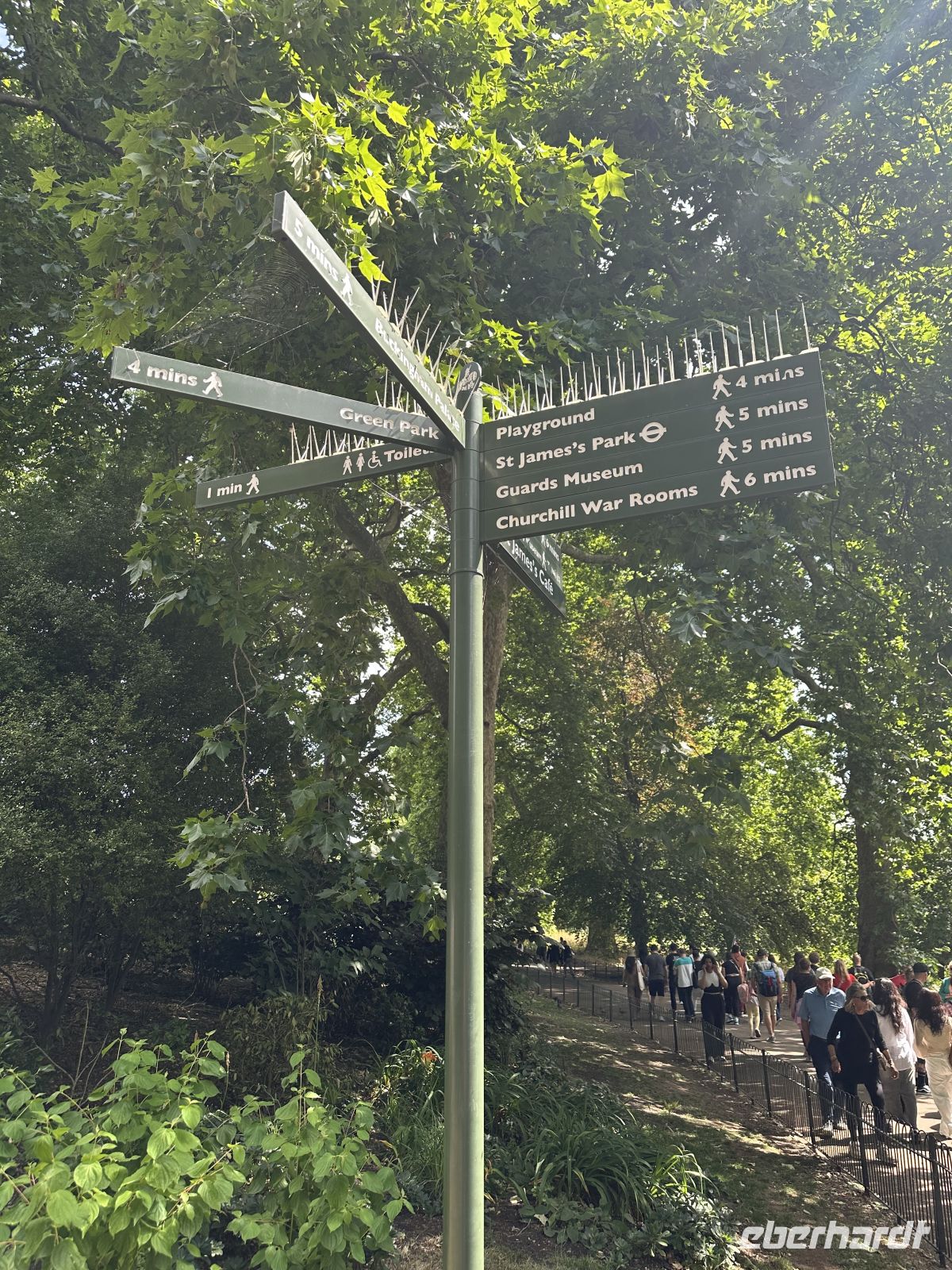 Wir fahren zum ersten Mal U-Bahn. Nach einer kurzen Erklärung – gewürzt mit ein paar witzigen Kommentaren – geht es weiter zum St. James’s Park. Von dort spazieren wir durch den malerischen Park. Immer wieder eröffneten sich beeindruckende Sichtachsen – auf das London Eye, die Horse Guards oder den Buckingham Palace. Und wie immer wichtig: zu wissen, wo Toiletten sind.
