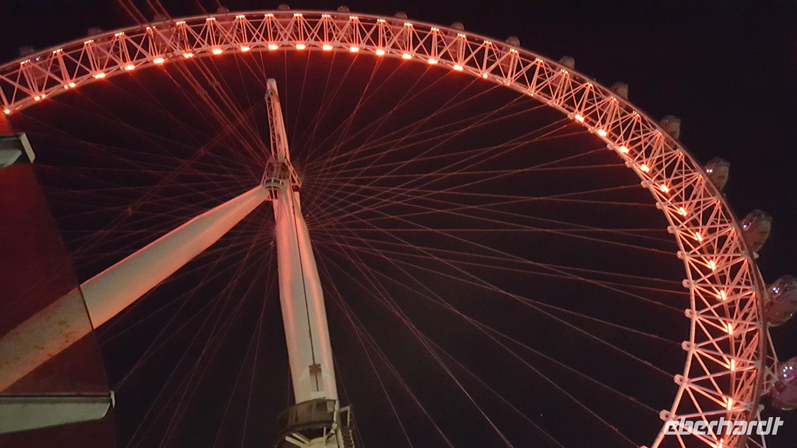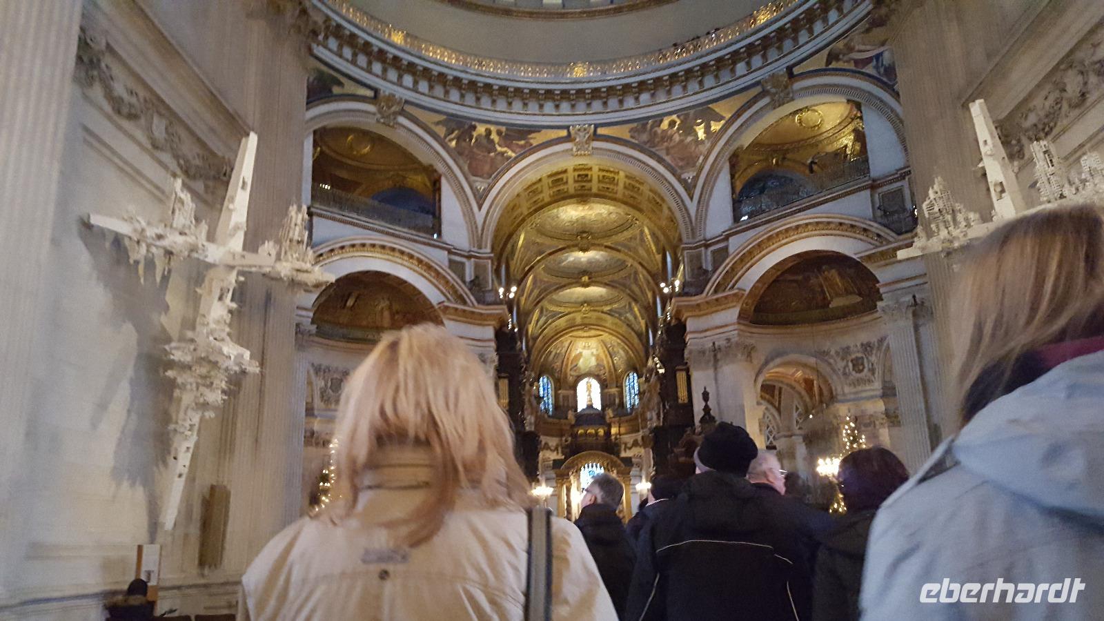 Am Nachmittag fahren wir dann mit unserem Bus in die City, überqueren die Themse auf der Lambeth Bridge, werfen einen ersten Blick auf das London Eye, das Riesenrad, auf Westminster und Big Ben. Am Imperial War Museum treffen wir Marc, unseren Stadtführer. Er erzählt viel Wissenswertes über diese Stadt und wir fahren über die Westminster Bridge, an der Westminster Abbey vorbei, streifen kurz den Buckingham Palace. Es fängt etwas an zu regnen, aber wir sitzen ja im Bus, als wir aussteigen hat es längst wieder aufgehört, und so passieren wir Picadilly Circus, Trafalgar Square und kommen zum ersten Stopp, dem Express Building. Hier können wir auf das Dach hinauffahren und haben einen tollen Blick auf die St. Pauls Cathedrale. Diese besichtigen wir dann auch innen, Marc erläutert uns interessante Details aus der Geschichte dieses Bauwerks und seines Baumeisters Christopher Wren. Einige von uns nutzen die Gelegenheit und steigen hinauf zur Kuppel, probieren das sogenannte "Flüstergewölbe" aus, Andere genießen einfach die gerade stattfindende Chorprobe mit Orgelmusik. Dann folgen wir unserem Guide Marc (was gar nicht so einfach ist bei seinem Tempo) über die Millenium Bridge. Sie heißt bei den Londonern "The Wobbly Bridge"- die Wackelbrücke, weil sie bereits 2 Monate nach ihrer Eröffnung am 10. Juni 2000 wegen heftigen Schwankens für den Publikumsverkehr geschlossen werden mußte. Wir merken nichts davon und bestaunen die Gebäude des Shakespear Globe, den Nachbau des elisabethanischen Theaters Shakespears und die jetzigen modernen Aufführungsstätten. Draußen wartet unser Busfahrer Roberto, er bringt uns zum Highlight des Tages: dem London Eye. Während wir auf unsere Fahrt mit dem Riesenrad warten wird es dunkel, wir genießen den Lichterglanz der Londoner City. Unsere Fahrt dann ist spektakulär: Bei klarer Sicht können wir die ganze Stadt überblicken- überwältigend. Voller toller Eindrücke fahren wir zurück zum Hotel, beziehen unsere Zimmer und treffen uns zum Abendessen. Extra für uns öffnet das Restaurant und ein leckeres Dinner- Buffet rundet diesen Tag ab.