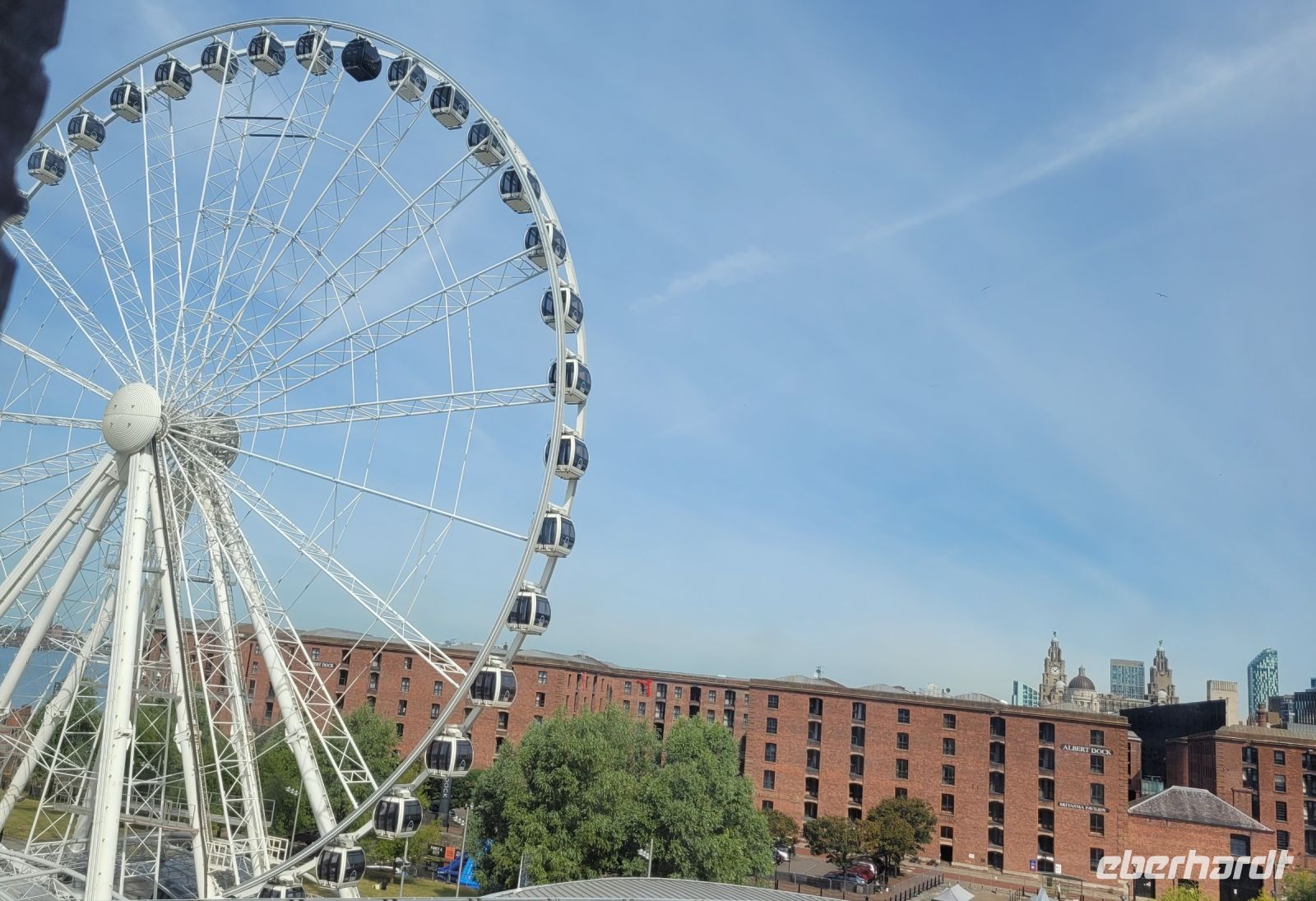 Nach einer entspannten Nacht bei ruhiger See legen wir am Morgen in Kingston upon Hull an. Wir folgen mit unserem Reisebus dem mächtigen Humber River gegen seine Strömungsrichtung, unterqueren die riesige Humber Bridge und fahren, vorbei am Großraum Leeds, in die Pennines. Wir queren dieses „Rückgrat Englands“ am höchsten Autobahnpunkt der britischen Hauptinsel. Knapp unter vierhundert Höhenmetern gelegen, vermittelt dieser den Eindruck einer um viele hundert Höhenmeter höher gelegenen Landschaft auf dem Kontinent. Am zeitigen Nachmittag sind wir dann schon in Liverpool angekommen. Unser Hotel liegt phantastisch; direkt an der Waterfront. Dieser neu gestaltete Bereich des alten Hafenareals rings um die Albert Docks ist einfach perfekt für Rollstuhlfahrer. Barrierefrei gestaltet, durchsetzt mit zahlreichen Museen, Galerien, Cafés und geprägt von der Geschichte des alten Liverpools – hier fühlen wir uns auf Anhieb „zu Hause“. Zunächst brechen wir zu einer ersten gemeinsamen Erkundung des Areals auf, bevor wir dann noch die Zeit nutzen, um heute schon die „Beatles Story“, das ohne Frage beste Beatles Museum überhaupt, zu besichtigen. Nach diesen ersten erlebnisreichen Stunden beziehen wir dann die rollstuhlgerechten Zimmer im Hotel – super Blick zu den alten Docks bzw. auf das Wheel of Liverpool.