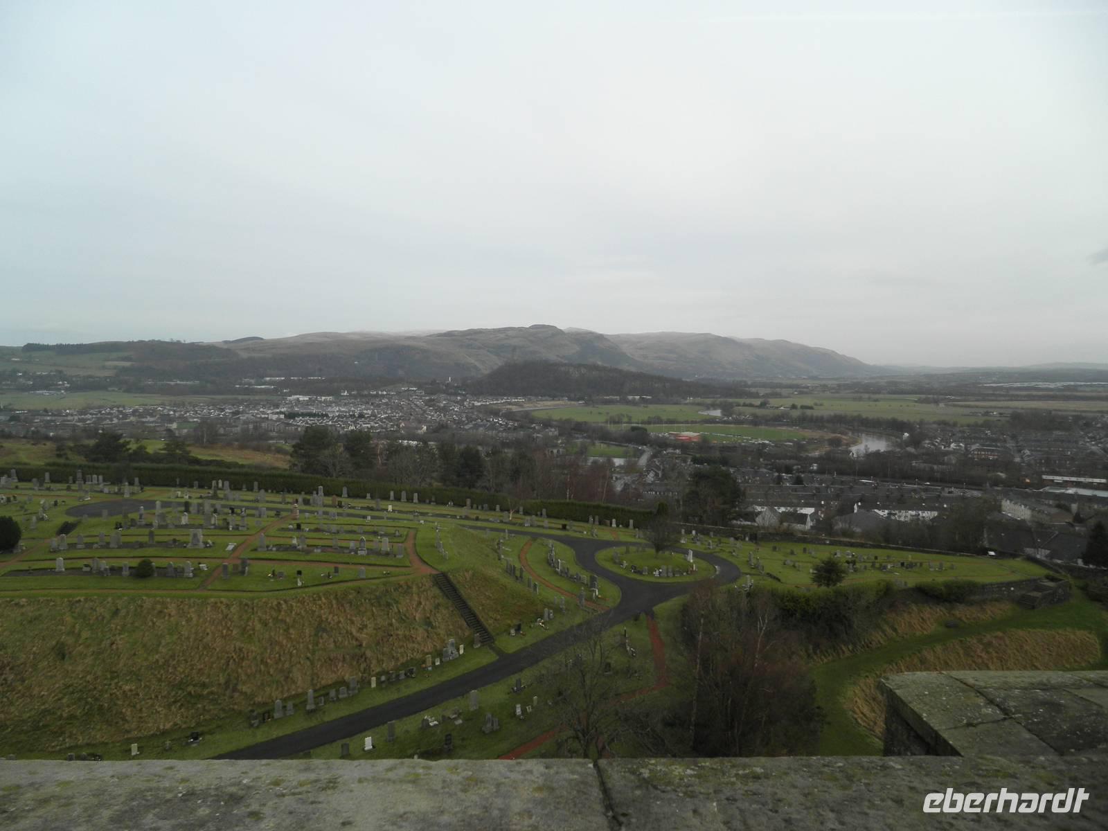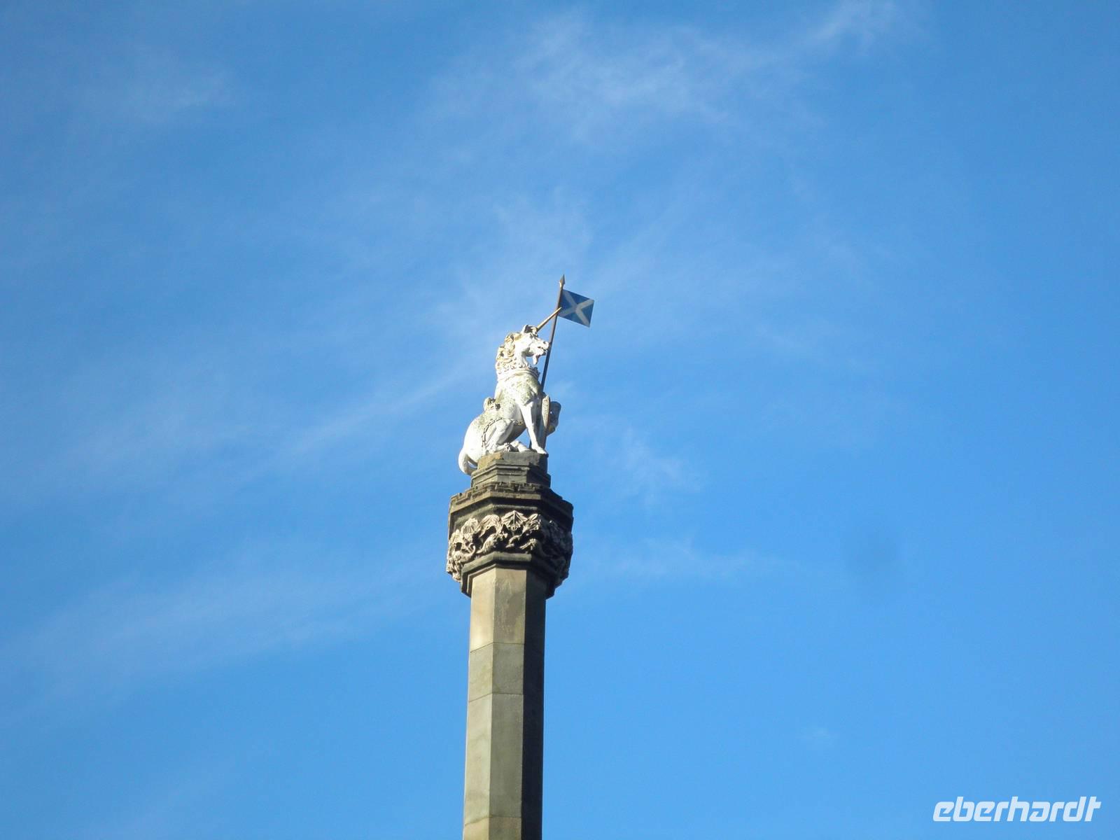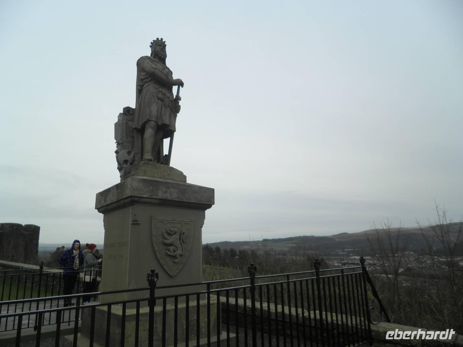 Heute fuhren wir noch einmal hinaus aus der Stadt. Unterhalb von Edinburgh verläuft der Firth of Forth, der hier von drei imposanten Brücken in einer Breite von 2500 m überspannt wird. Die berühmteste der drei ist die Eisenbahnbrücke, eine waghalsige und beeindruckende rot angestrichene Eisenkontruktion, die bereits seit 1890 in Betrieb ist. Daneben zieht sich eine graue Spannbrücke aus dem Jahr 1964 über den Fluss, diese dient noch heute den zahllosen Autos, Lastwagen und Bussen zum Überqueren des Firth of Forth. Bald jedoch wird es eine weitere moderne Brücke hier geben, die der alten Straßenbrücke Entlastung bringen wird. Man sieht schon die Pfeiler im Wasser stehen und die ersten Stahlseilbespannungen. Wir machten oberhalb der Brücken halt, um einen Blick darauf zu werfen und das ein oder andere Foto davon zu machen, bevor wir weiter fuhren, um Stirling Castle nach kurzer Fahrt zu erreichen. Hier hatten wir die Gelegenheit, diese historische Burg zu besichtigen. Einige nutzten einen deutschsprachigen Audiogiude, andere folgten der englischen Führung, die gerade begann, als wir den Innenhof des Schlosses erreicht hatten. Stirling Castle war über Jahrhunderte eine der wichtigsten Burgen der schottischen Könige. In und um die Burg hatte es mehrere wichtige Schlachten gegeben, die zwischen England und Schottland ausgetragen worden sind. 1314 zum Beispiel gab es eine solche Schlacht in Bannockburn in Sichtweite des Castles. Der damalige schottische König Robert de Bruce hatte die Engländer erfolgreich geschlagen, und so steht er heute in Stein gehauen auf einem Sockel vor dem Castleeingang und grüßt die Besucher schon von Weitem. Ebenfalls in der Nähe auf einem Hügel steht ein weiteres Denkmal, das Wallace Monument. Dieser Turm erinnert an William Wallace, der als Anführer der schottischen Kämpfer die Engländer bei Stirling Bridge im Jahre 1297 geschlagen hatte. Der Film Braveheart erinnert an diesen schottischen Freiheitskämpfer.