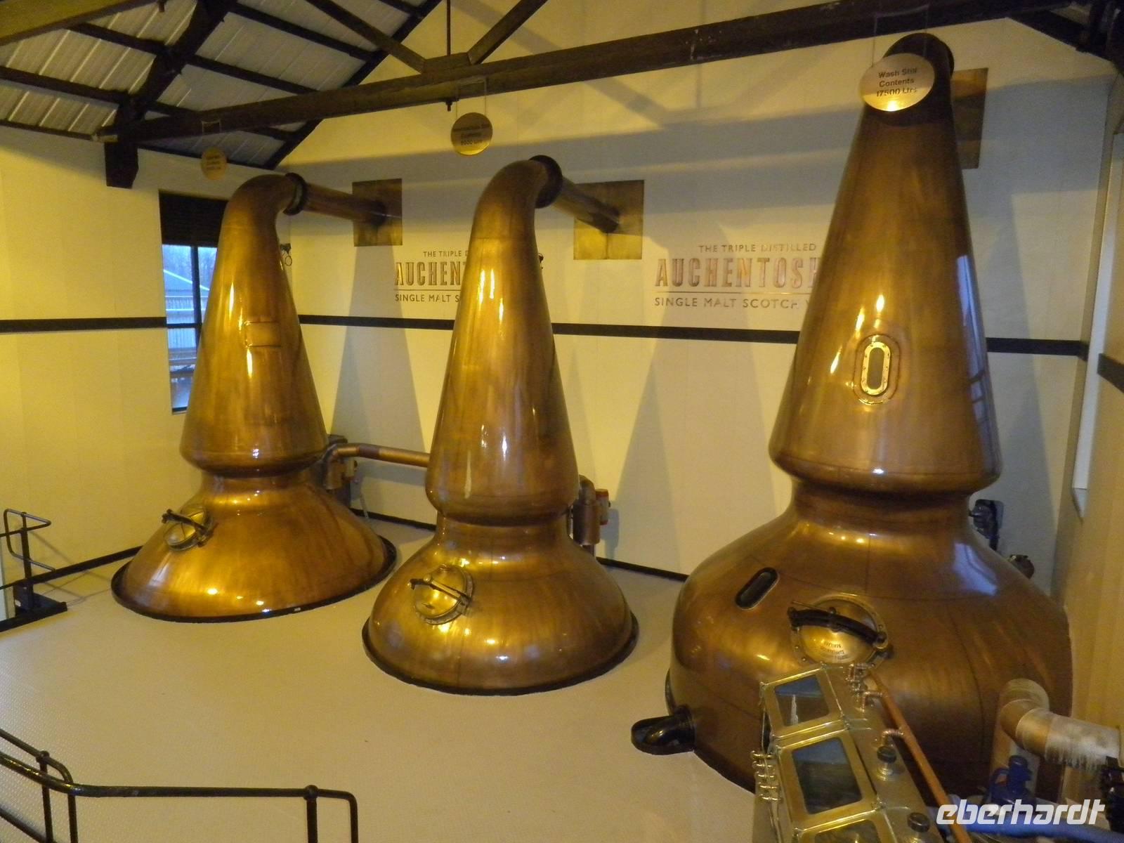 Schnell stiegen wir wieder in unseren warmen Bus und verließen die Stadt, denn wir hatten im Osten von Glasgow eine Verabredung. Auchentoshan hieß sie, das ist eine alt eingesessene Whisky-Destillery am Fluss Clyde. Dort erfuhren wir bei einer Führung eine ganze Menge über die traditionelle Herstellung des schottischen Lebeswassers. Auch kosten durften wir mal, einige erstanden den edlen Tropfen als Souvenir für zu Hause.
