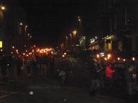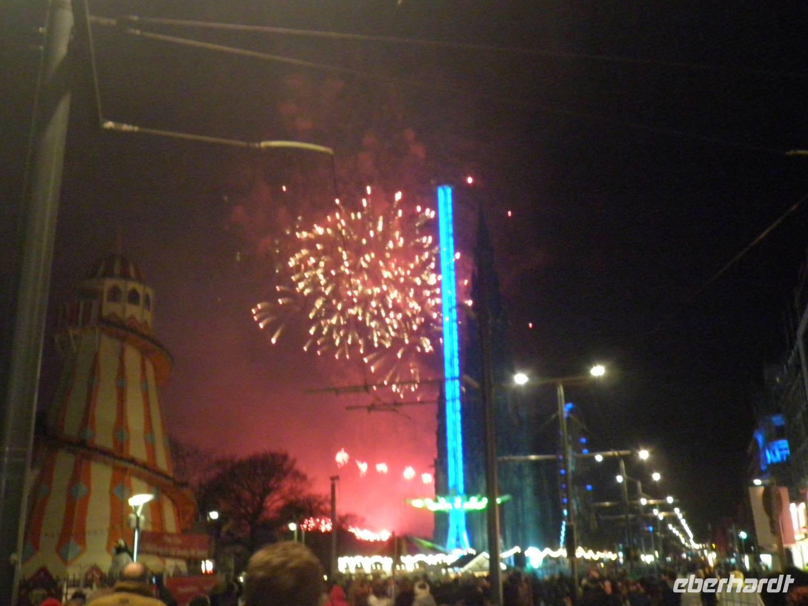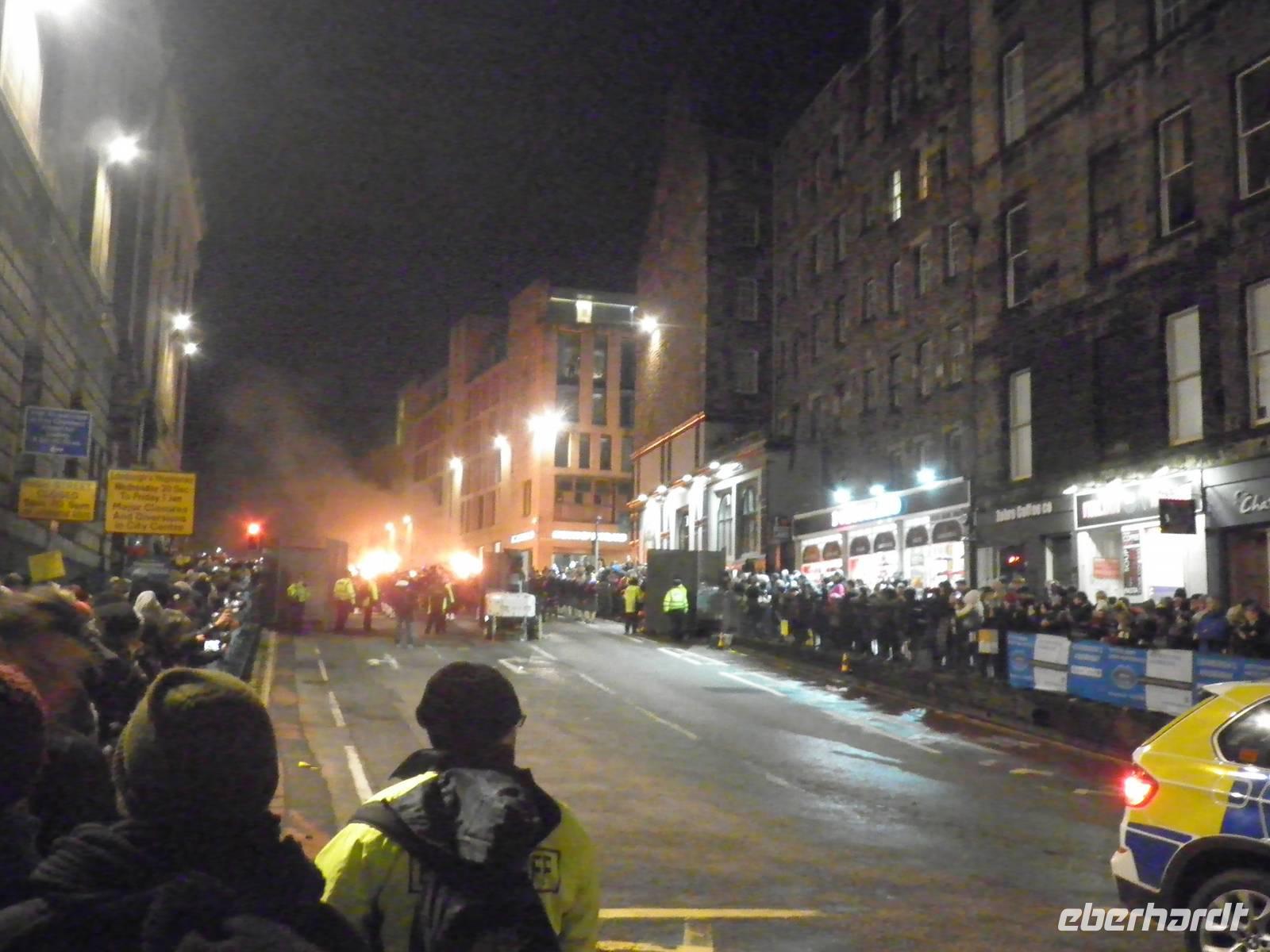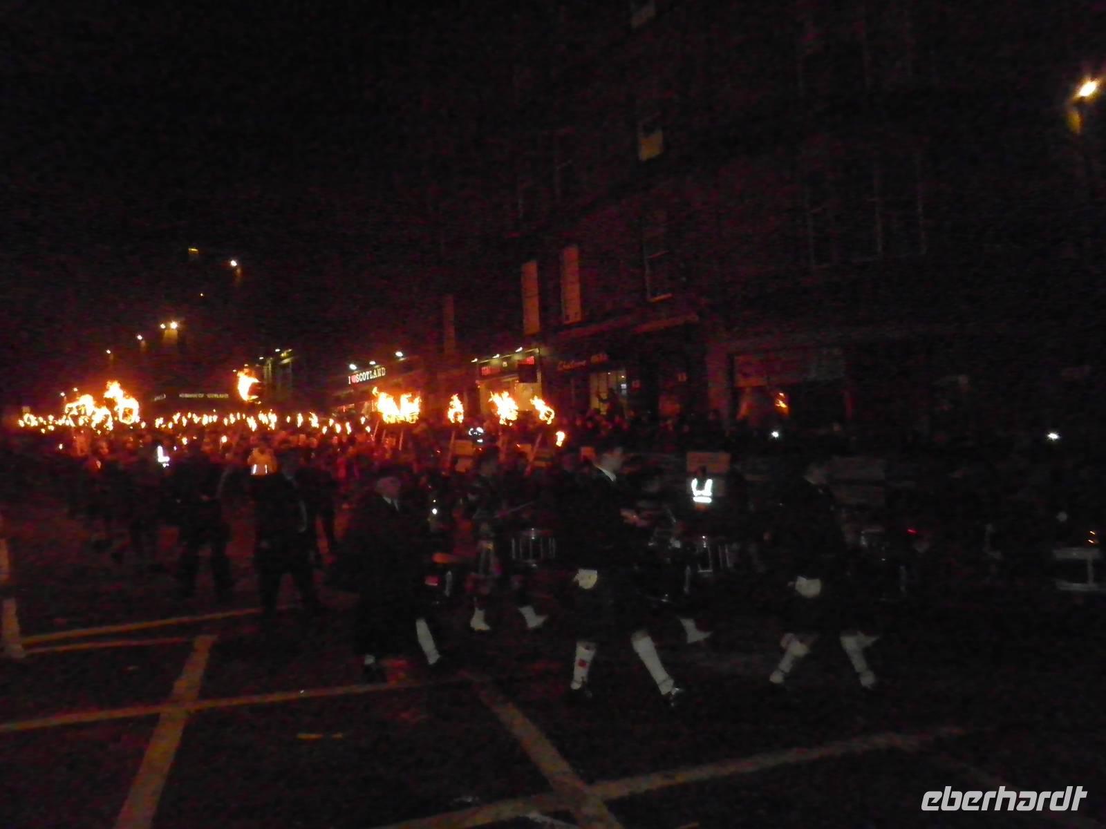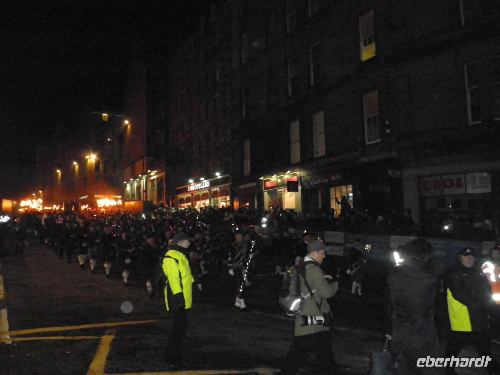 Wir fuhren zurück nach Edinburgh, direkt zu unserem Hotel und trafen uns nach kurzer Zeit schon wieder, um gemeinsam hinauf zur Royal Mile zu spazieren. An der Bank Street reihten wir uns ein in die Menge der Schaulustigen, die schon auf den Beginn des traditionellen Hogmanay Festes zum Jahreswechsel warteten. Heute begannen die Feierlichkeiten mit einem Fackelumzug durch die Innenstadt Edinburghs. Pünktlich 19 Uhr setzte sich der Zug in Bewegung, voran ging eine Schottische Highlanderkapelle mit Dudelsäcken (Pipes), Trommeln und im Kilt und sorgten für die angemessene musikalische Begeitung des Zuges. Danach folgten wilde Wickinger mit großen Fackeln, darauf unzählige Teilnehmer mit Fackeln, es müssen mehrere Tausend gewesen sein. Schier unendlich zog sich der leuchtende Zug vorbei an uns bis zum Calton Hill. Dort wurde das Ende des Fackelzuges mit einem grandiosen Feuerwerk gefeiert, das hoch über der Altstadt von Edinburgh erstrahlte.