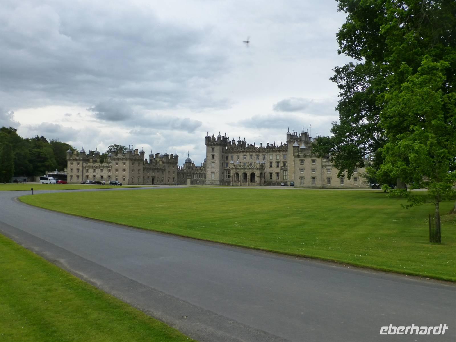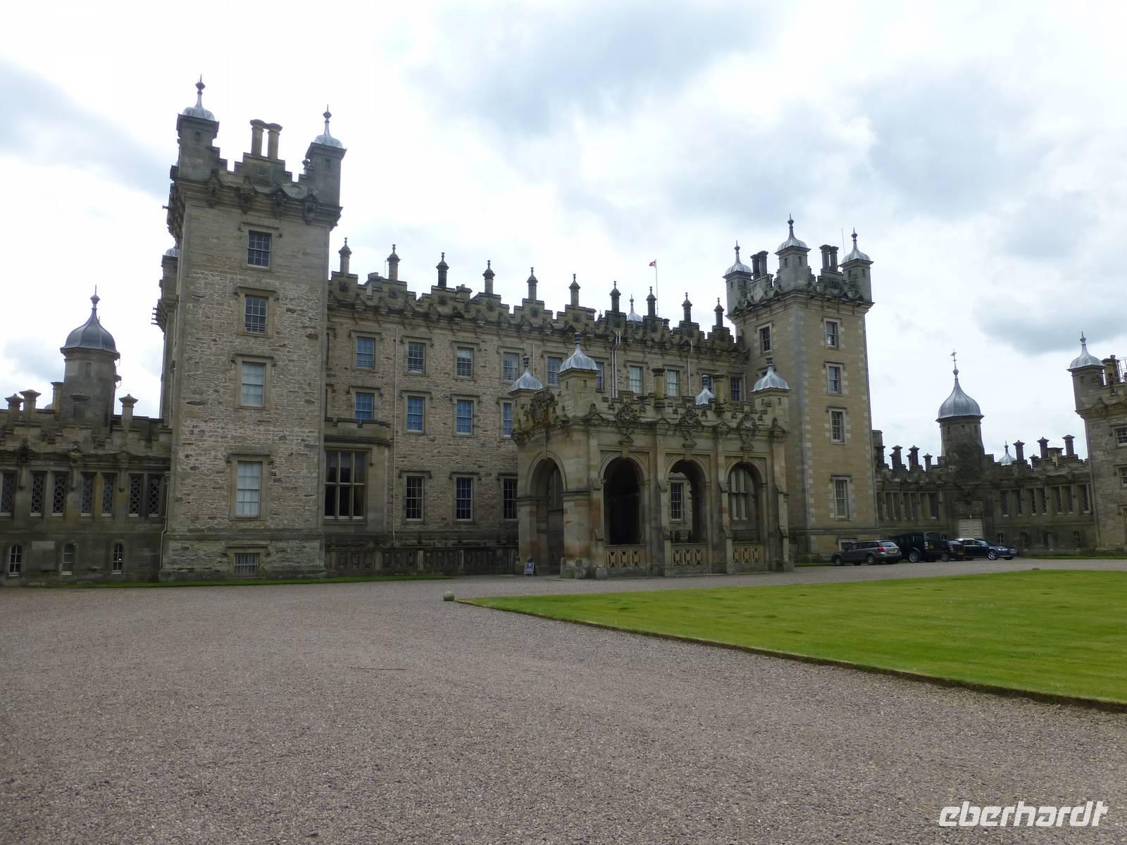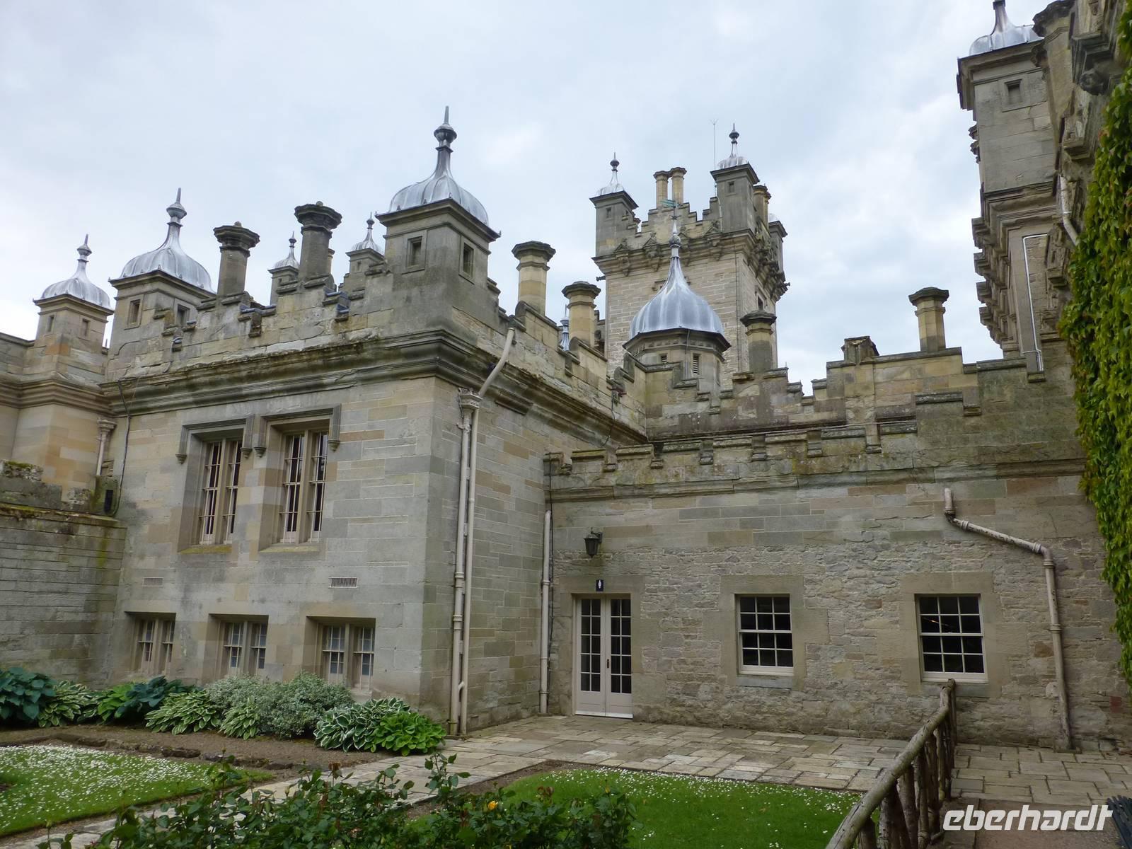 Ganz nah am Ort befindet sich Floors Castle. Trotz des Namens Castle ist es keine Burg sondern eher ein Land- oder Herrenhaus. Die Besitzer von Floors Castle, Herzöge von Roxburghe, gehören zum alten schottischen Adel. Den Titel des Herzogs hat der 5. Earl of Roxburghe 1707 von Queen Anne verliehen bekommen. Sie dankte ihm damit für seinen Einsatz und die Unterstützung bei der Union Schottlands mit England. Die Familie des 10th Duke lebt heute auch privat auf Floors Castle. Sie verwaltet den 22400 ha großen Familienbesitz. 1837 wurde dem aus dem 15. Jh. Stammenden Gebäude sein heutiges Aussehen durch den Architekten Henry William Playfair gegeben, die Zinnen, Zwiebeltürme und zahlreiche andere Details gehen auf ihn zurück. Die Innenausstattung war nicht immer so prunkvoll wie wir sie heute sehen können. Der 8. Duke hatte eine reiche Amerikanerin geheiratet und deren Sammlung von flämischen Gobelins, französischen Möbeln und zahlreichen Gemälden gibt Floors Castle heute den Glanz. Im Castle gibt es übrigens 365 Fenster, also für jeden Tag des Jahres eines.