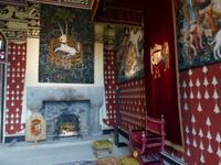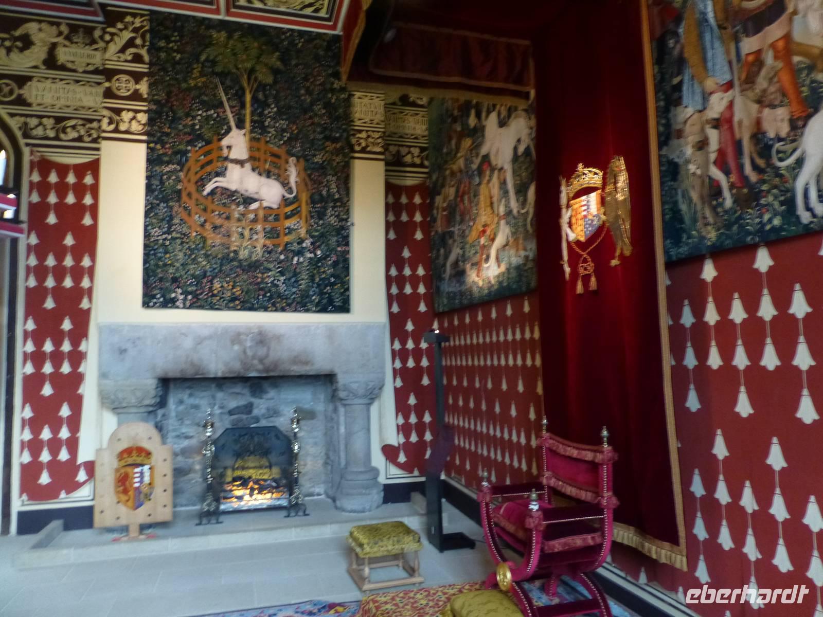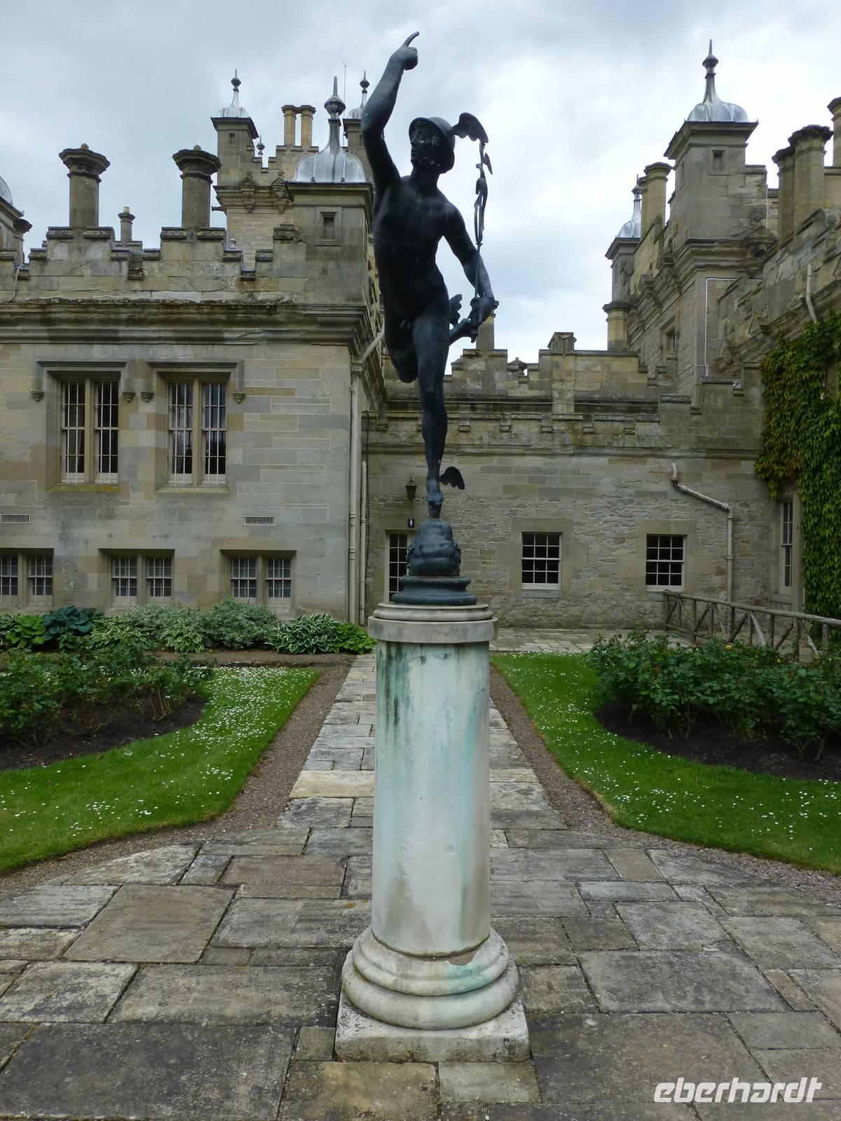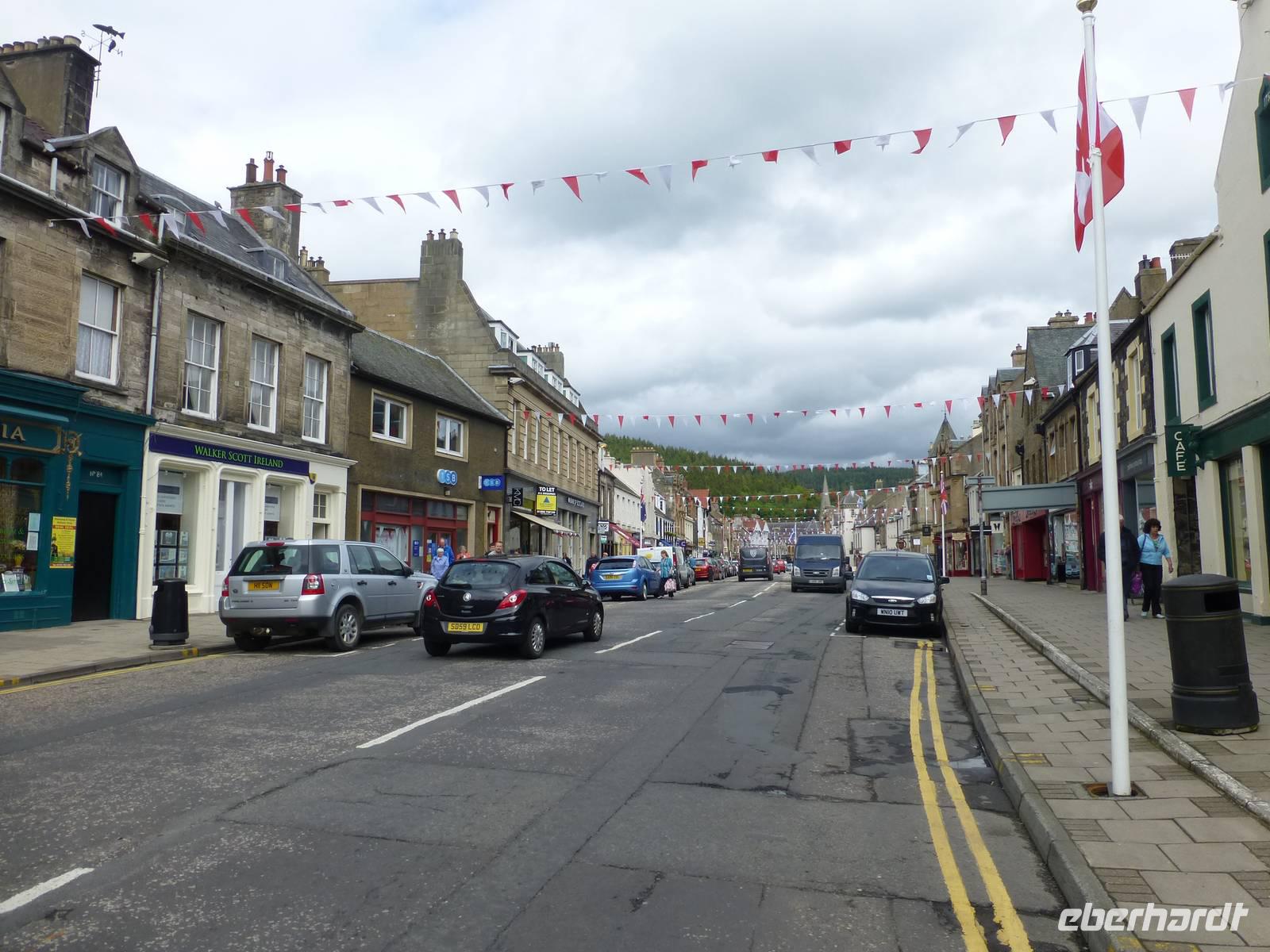 Ganz nah am Ort befindet sich Floors Castle. Trotz des Namens Castle ist es keine Burg sondern eher ein Land- oder Herrenhaus. Die Besitzer von Floors Castle, Herzöge von Roxburghe, gehören zum alten schottischen Adel. Den Titel des Herzogs hat der 5. Earl of Roxburghe 1707 von Queen Anne verliehen bekommen. Sie dankte ihm damit für seinen Einsatz und die Unterstützung bei der Union Schottlands mit England. Die Familie des 10th Duke lebt heute auch privat auf Floors Castle. Sie verwaltet den 22400 ha großen Familienbesitz. 1837 wurde dem aus dem 15. Jh. Stammenden Gebäude sein heutiges Aussehen durch den Architekten Henry William Playfair gegeben, die Zinnen, Zwiebeltürme und zahlreiche andere Details gehen auf ihn zurück. Die Innenausstattung war nicht immer so prunkvoll wie wir sie heute sehen können. Der 8. Duke hatte eine reiche Amerikanerin geheiratet und deren Sammlung von flämischen Gobelins, französischen Möbeln und zahlreichen Gemälden gibt Floors Castle heute den Glanz. Im Castle gibt es übrigens 365 Fenster, also für jeden Tag des Jahres eines.