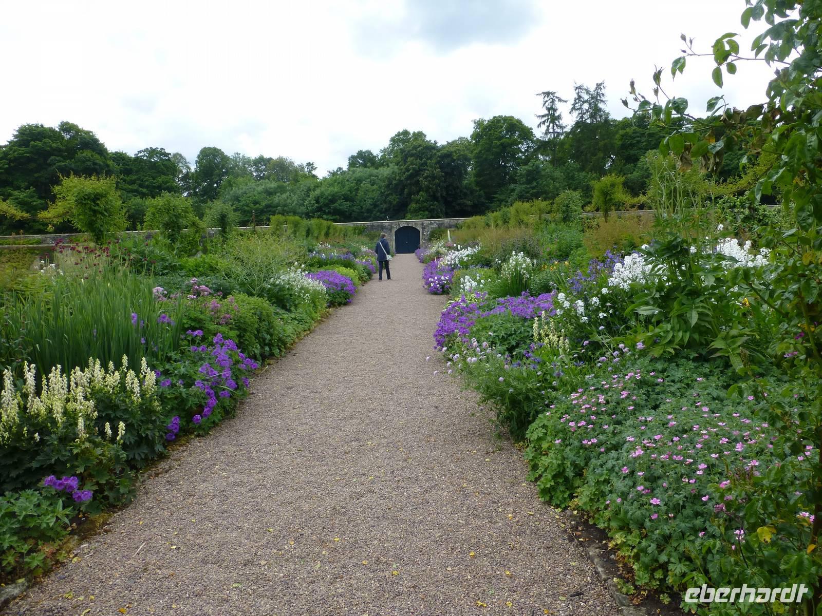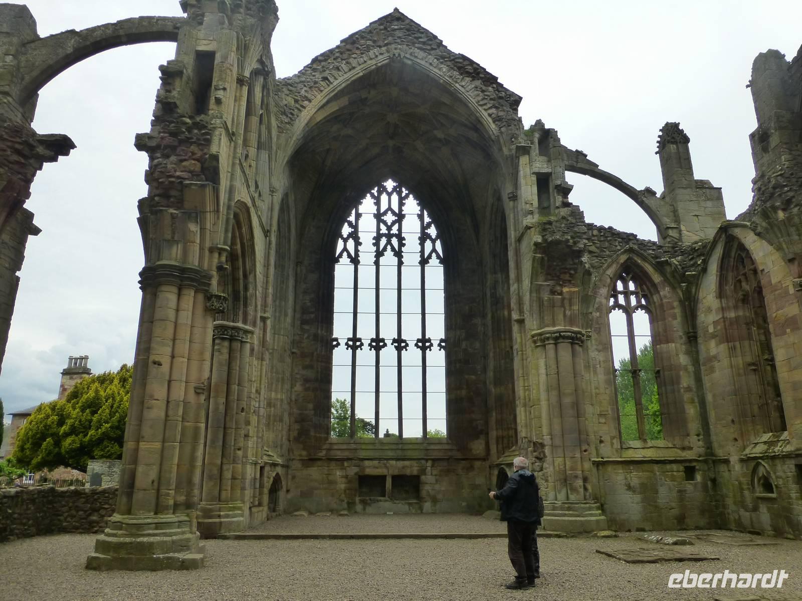 Die Garten- und Parkanlage ist sehr weitläufig, wir besuchen einen Teil und genießen bei einem Kaffee das recht angenehme Wetter. Auf dem Rückweg machen wir noch Halt in Melrose. Als kleines Extra besuchen wir die Melrose Abbey. Sie war bis zur Reformation in Schottland in der Mitte des 16. Jh. eine von vier Grenzlandabteien. Die andern befanden sich in Jedburgh, Kelso und Dryburgh. Die Ruine der Melrose Abbey zeigt eine, für Zisterzienser - Abteien, ungewöhnlich reiche Ornamentik, da dieser Orden in erster Linie Schlichtheit und Schmucklosigkeit vertrat, man folgte dem strengen „Ora et Labora" Ideal. Der betende sollte in der Andacht der Seele durch solche Verzierungen nicht gestört werden. Die Ruine hat aber auch immer viele Menschen angezogen, so den Maler William Turner aber auch den deutschen Schriftsteller Theodor Fontane.