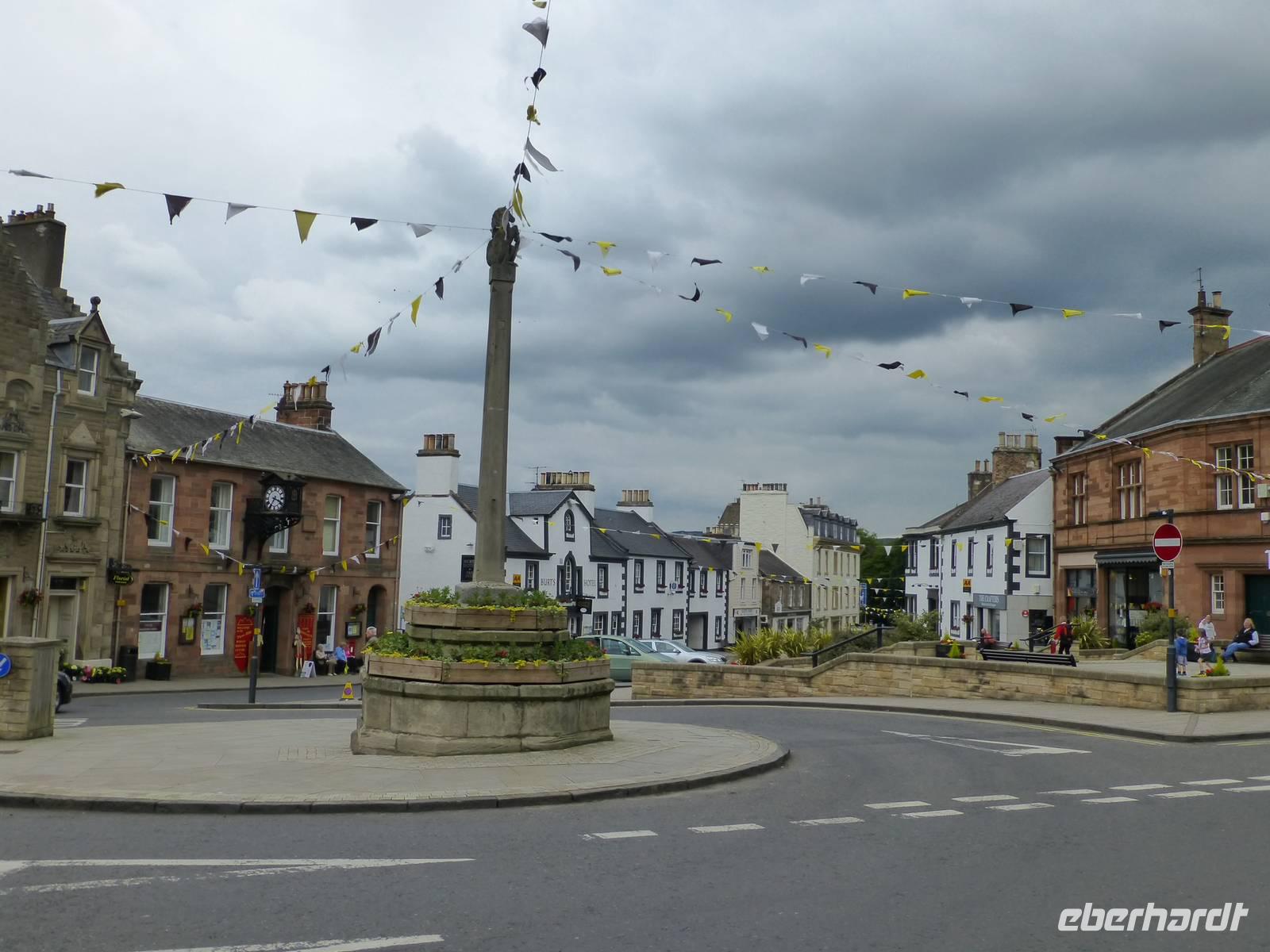 Nach dem typisch schottischen Frühstück fahren wir durch das Tal des Flusses Tweed zuerst Richtung Galashiels. Die ehemalige Textilarbeiterstadt hat nicht wirklich etwas Sehenswertes zu bieten, so dass wir nur durch den Ort fahren. Später in Kelso machen wir einen Bummel durch das Stadtzentrum mit seinen Kopfsteinpflasterstraßen. Sir Walter Scott der hier zur 1783 Oberschule meinte einmal, das Kelso „das schönste wenn nicht das romantischste Dorf in Schottland sei".