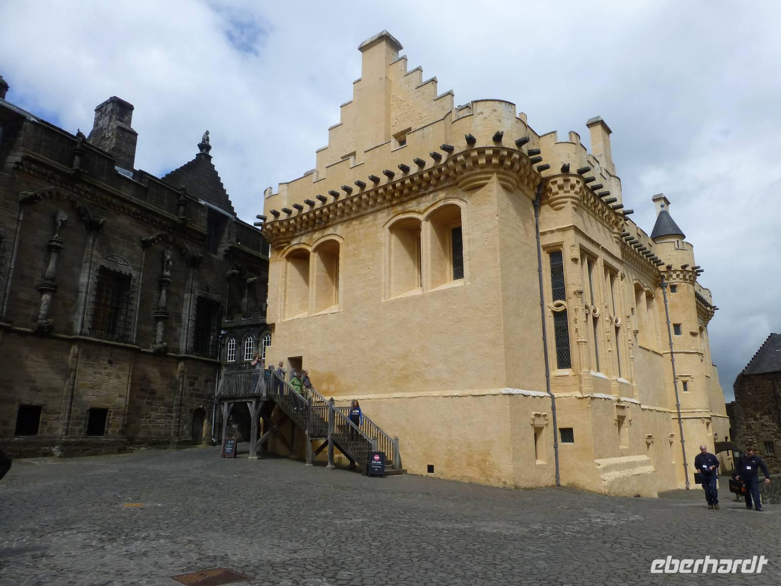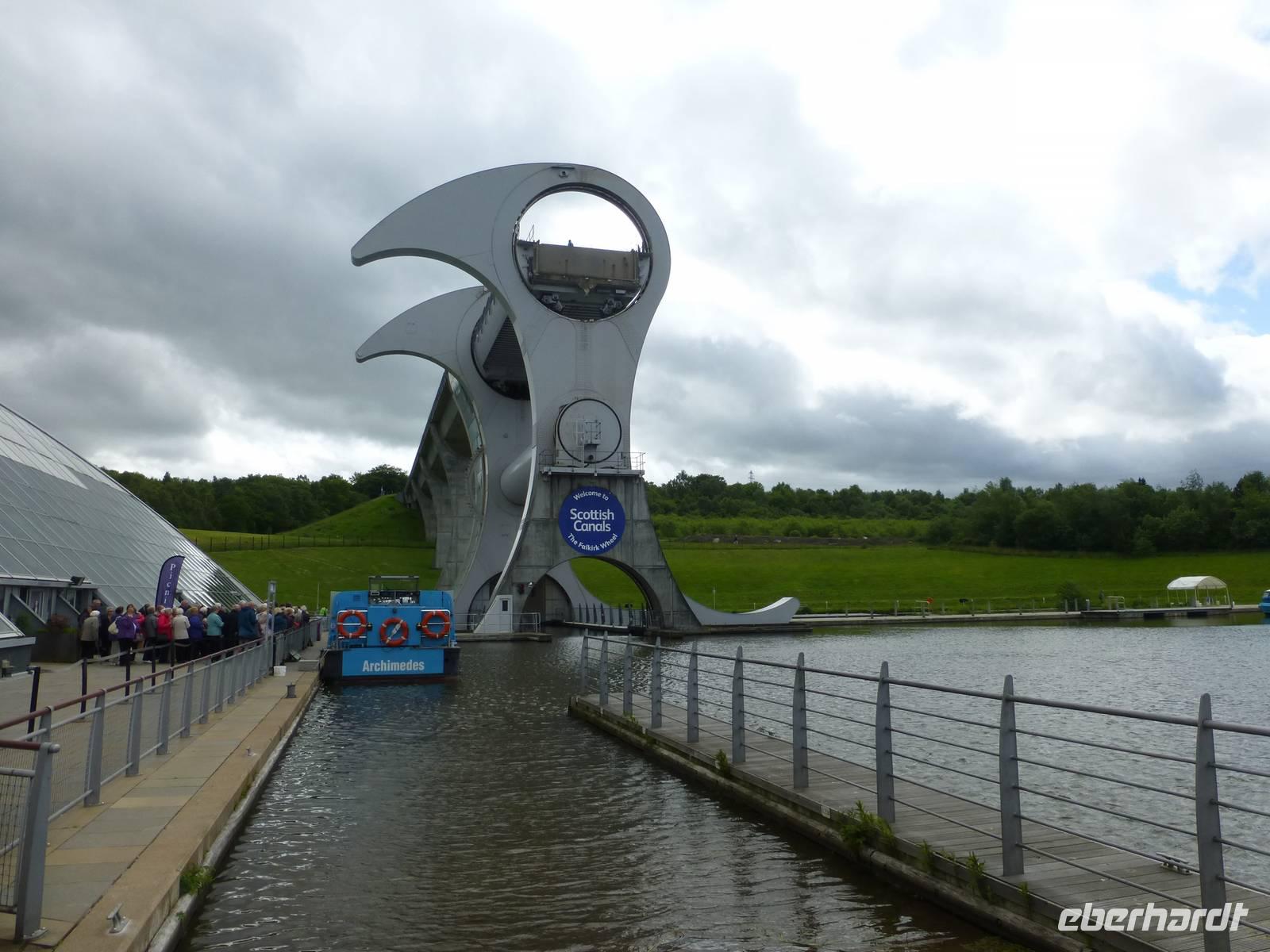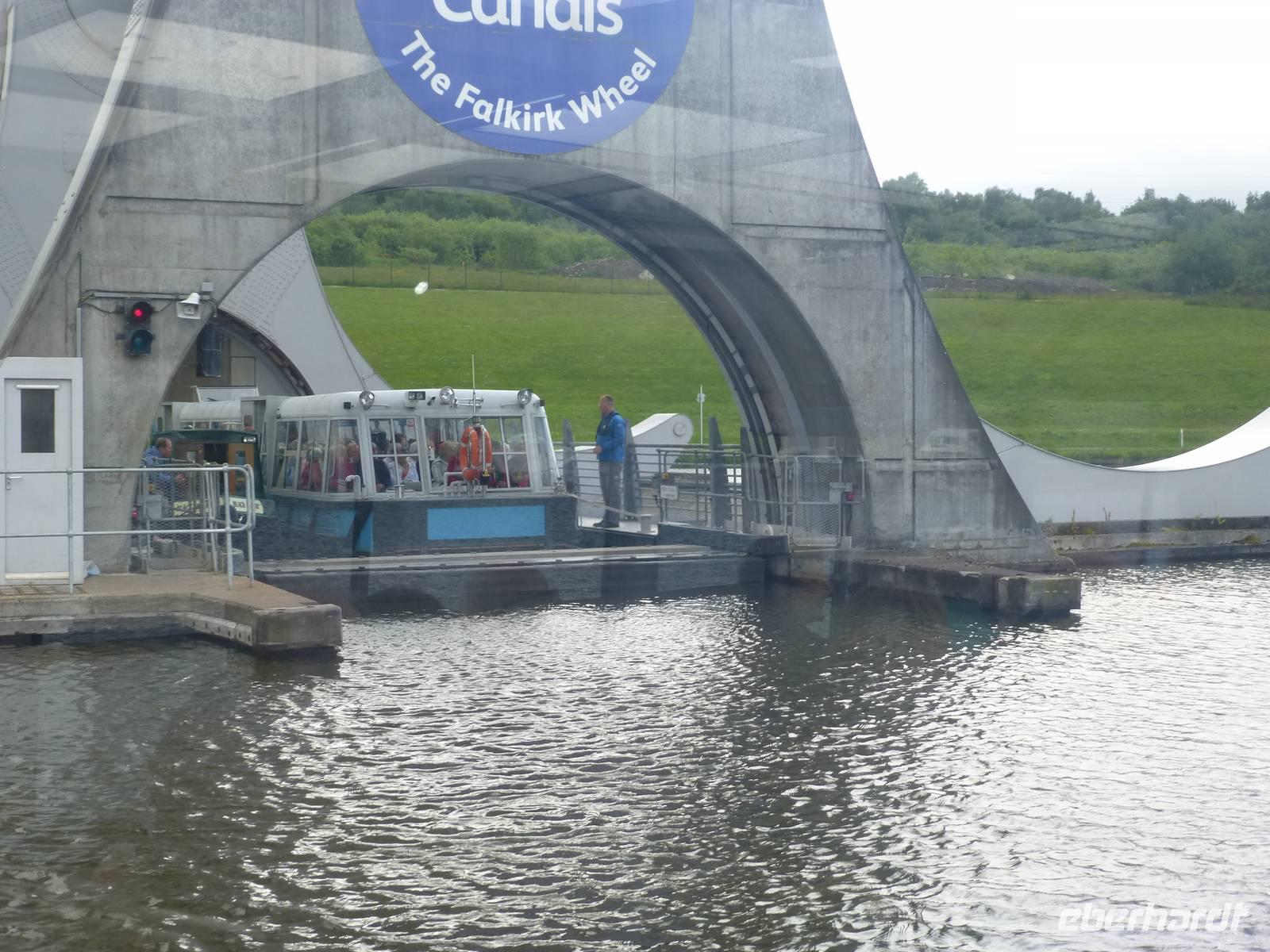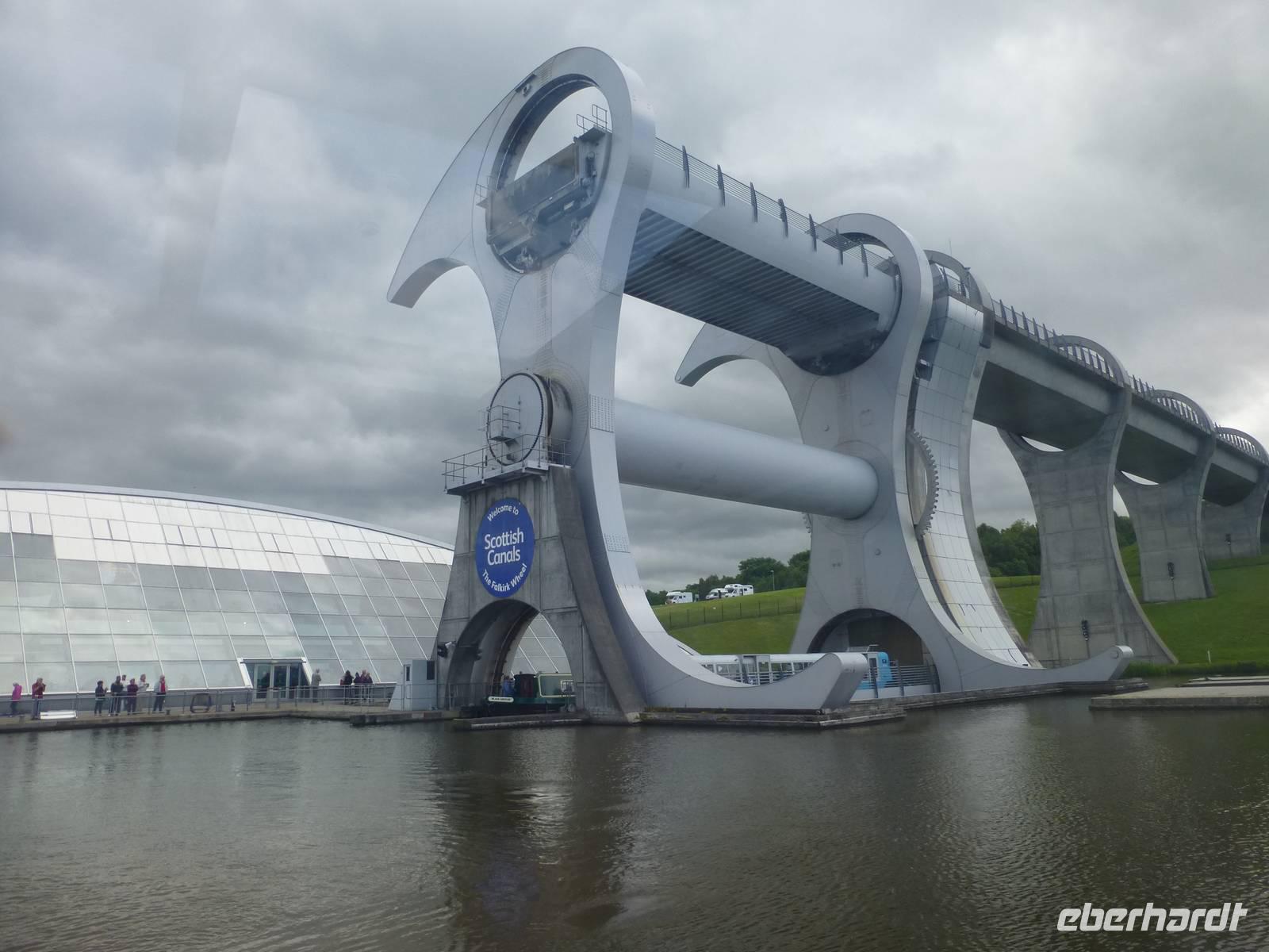 Der erste Besuchspunkt des heutigen Tages ist Stirling Castel. Zuerst machen wir aber halt an Old Stirling Bridge, ein Ort, welcher im Kampf der Schotten um Unabhängigkeit eine wichtige Rolle spielte. In der Altstadt von Stirling angekommen laufen wir vom Marktplatz mit dem Marktkreuz zur Kirche Holy Rude. Es ist eine der wenigen mittelalterlichen Kirchen in Schottland und es ist neben Westminster die einzige Kirche in welcher ein König gekrönt wurde. Es war der Sohn von Maria Stuart der hier im Alter von einem Jahr von John Knox gesalbt wurde. Das imposant über der Stadt gelegene Stirling Castle war über viele Jahrhunderte Sitz der schottischen Könige. Inzwischen wieder gut restauriert können wir die königlichen Gemächer, die große Halle aber auch die Küche der Burg sehen. Auch die Aussicht auf die Umgebung ist dank guten Wetters hervorragend. Von Stirling ist es nicht weit bis nach Falkirk. Hier wartet eine technische Besonderheit auf uns, das Falkirk Wheel. Es ist ein Schiffshebewerk in welches in seiner Funktionsweise einem Riesenrad gleicht. Bei einer Bootsfahrt überwinden wir die Höhe von 24 m von einem Kanal zum anderen. In Betrieb ist es seit 2002 und verbindet den Union Canal mit dem Clyde Canal. Eigentlich waren die ganzen Anlagen bereits seit den 30'iger Jahren stillgelegt, wurden aber als Millienums Project wieder instandgesetzt und dienen heute den Freizeitkapitänen.