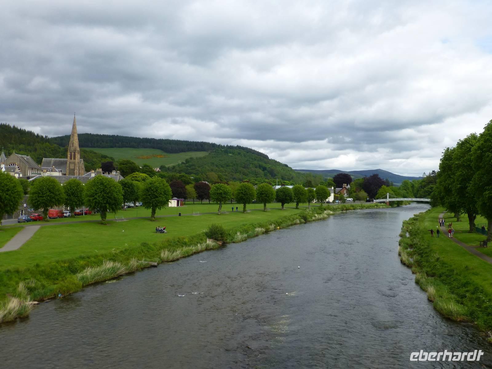 In Frankfurt trifft sich der größte Teil der Gruppe zum Flug nach Edinburgh. Dort angekommen bekommen wir auch ganz schnell unser Gepäck, warten dann noch auf zwei Gäste die über Amsterdam nach Edinburgh geflogen kommen. Als wir alle zusammen sind gehen wir zum Bus. Mit unserem Chauffeur Mike fahren wir dann nach Peebles, einer Kleinstadt mit ca. 8000 Einwohner in den Scottish Borders. Hier werden wir die nächsten vier Nächte im Peebles Hydro Hotel, einen Haus mit langer Tradition, bleiben. Nach dem Bezug der Zimmer machen wir uns auf, die Stadt ein wenig zu erkunden. Wir gehen die Hauptstraße mit ihren typischen hübschen Häusern entlang, besuchen die Peebles Parish Church und laufen entlang des Tweed. Das gemeinsame Abendessen im Speisesaal des Hotels genießen wir in einem stilvollen Ambiente.