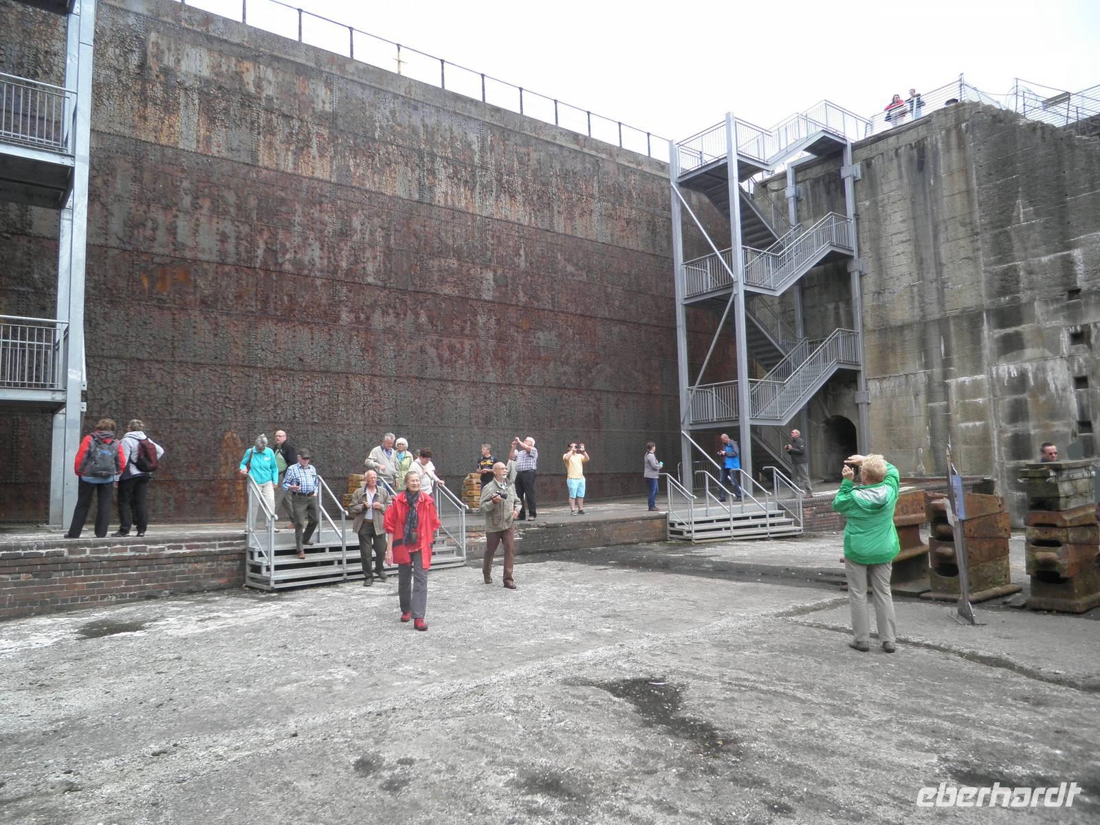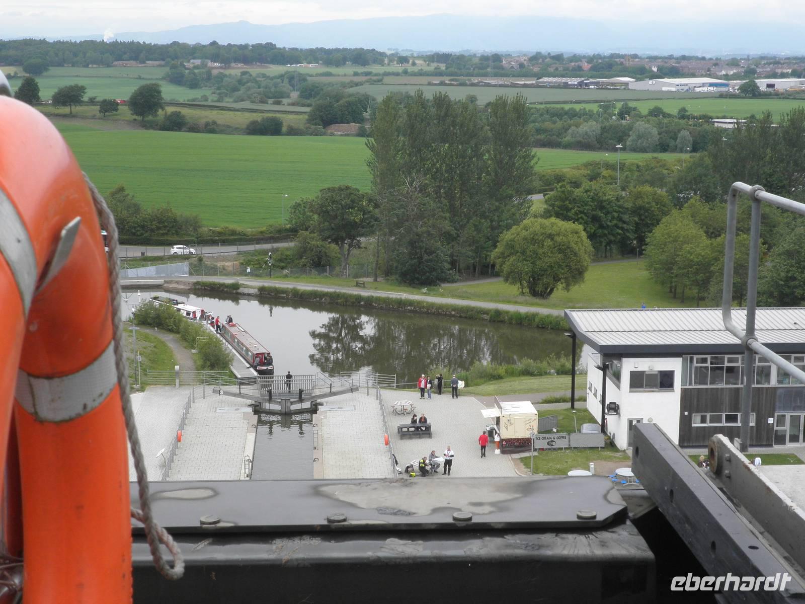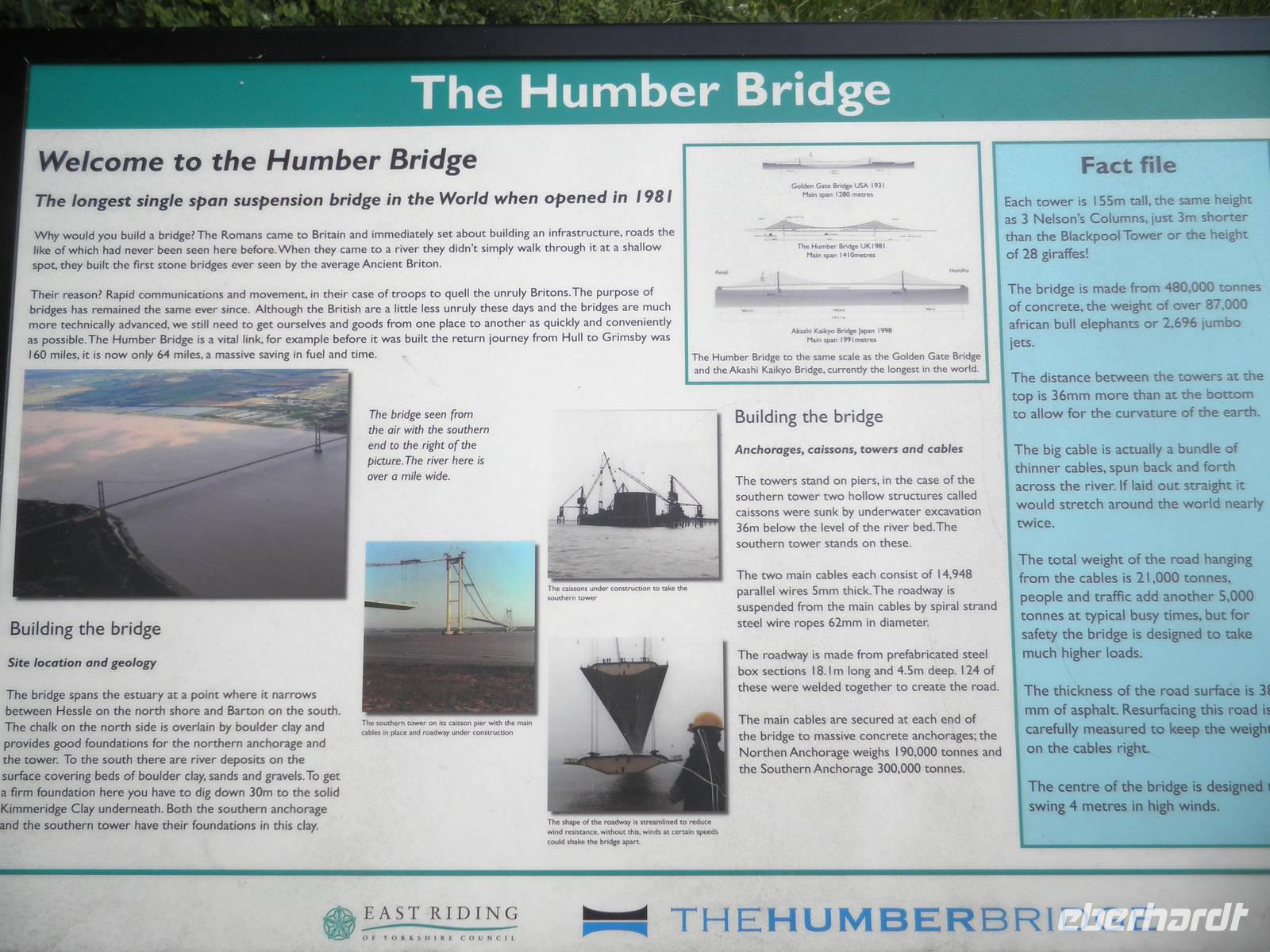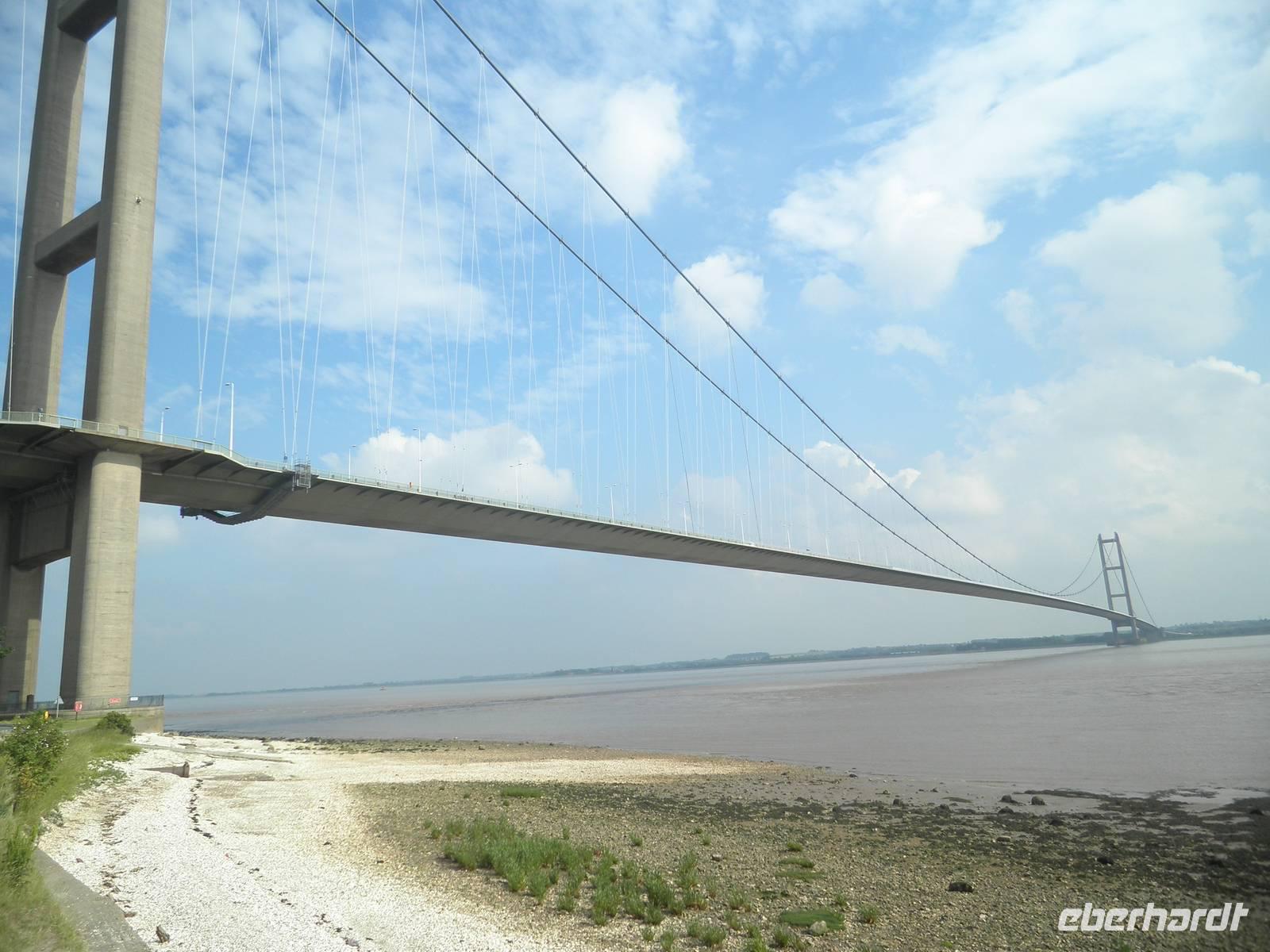 Die nächsten Stunden fuhren wir auf der Autobahn quer durch den Norden von Wales und durch Zentralengland. Wir passierten Städte wie Manchester und Leeds, die einstmals große Bedeutung während der industriellen Revolution hatten. Das letzte Mal vor der Fähre hielten wir in der Nähe der imposanten Humber-Bridge bei Kingston upon Hull. Einige schafften den Spaziergang durch den Wlad bis zum Ufer des Humber, um die beeindruckende und gewagte Konstruktion zu fotografieren, die sich westlich von Hull über die Humbermündung spannt.