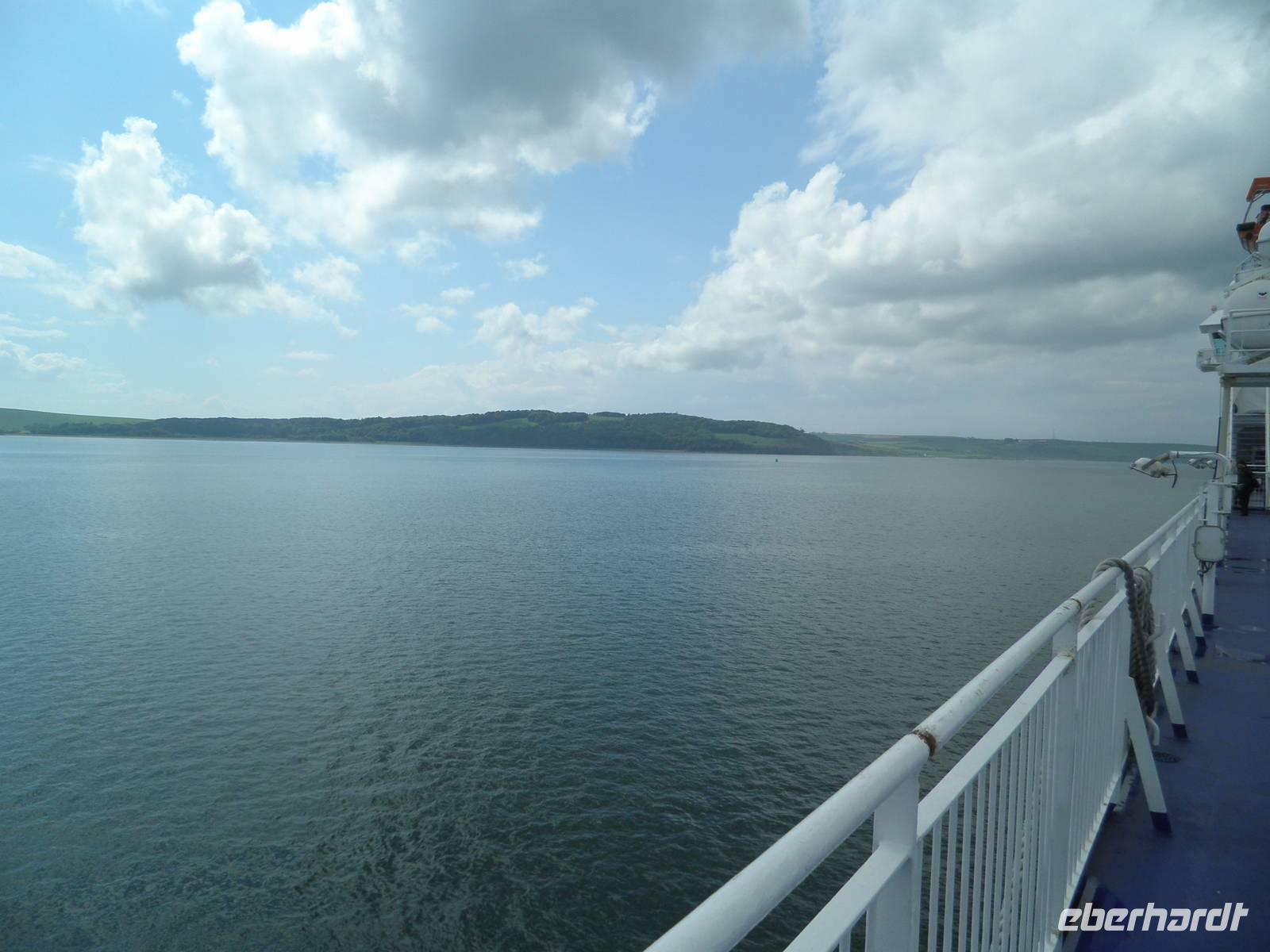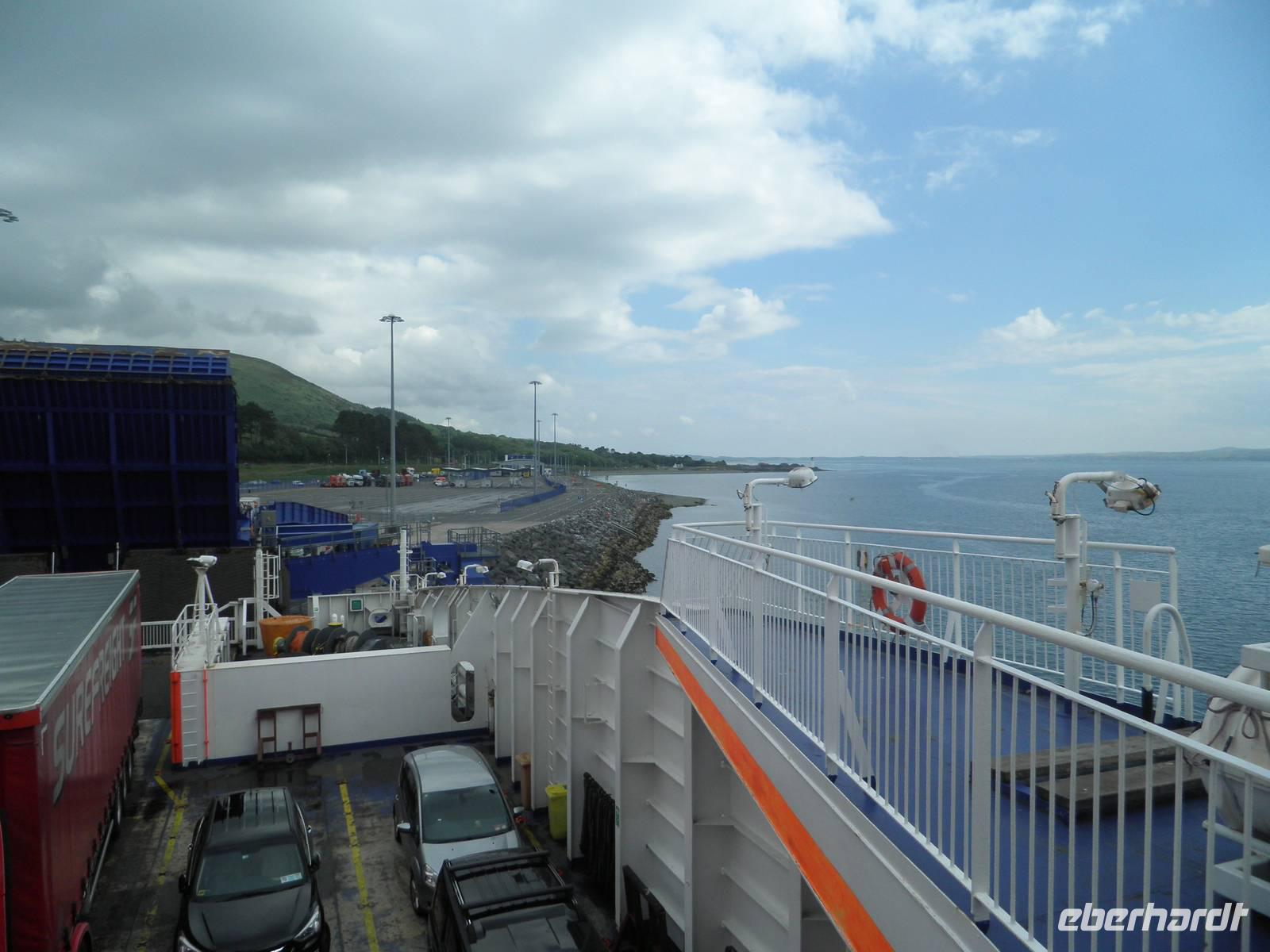 Die Gäste, die mit dem Flugzeug nach Hause reisten, konnten etwas länger schlafen, denn sie wurden am frühen Vormittag am Hotel abgeholt zum Flughafen Dublin. Von dort ging ihre weitere Reise per Flugzeug in ihre Heimatorte. Die Busgäste dagegen mussten sehr früh aufstehen und zum Hafen von Dublin fahren. Wir fuhren mit unserem Bus auf eine Fähre der "Irish Ferries" und unternahmen eine ruhige Seefahrt bei Sonnenschein und blauem Himmel.