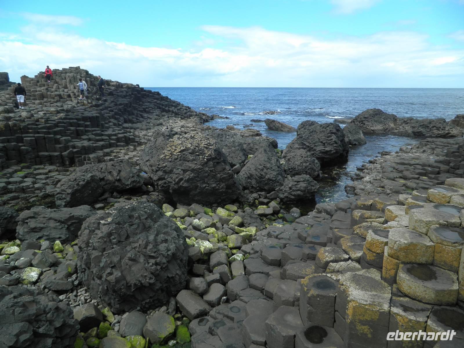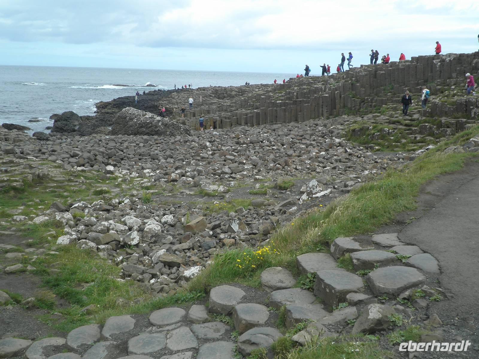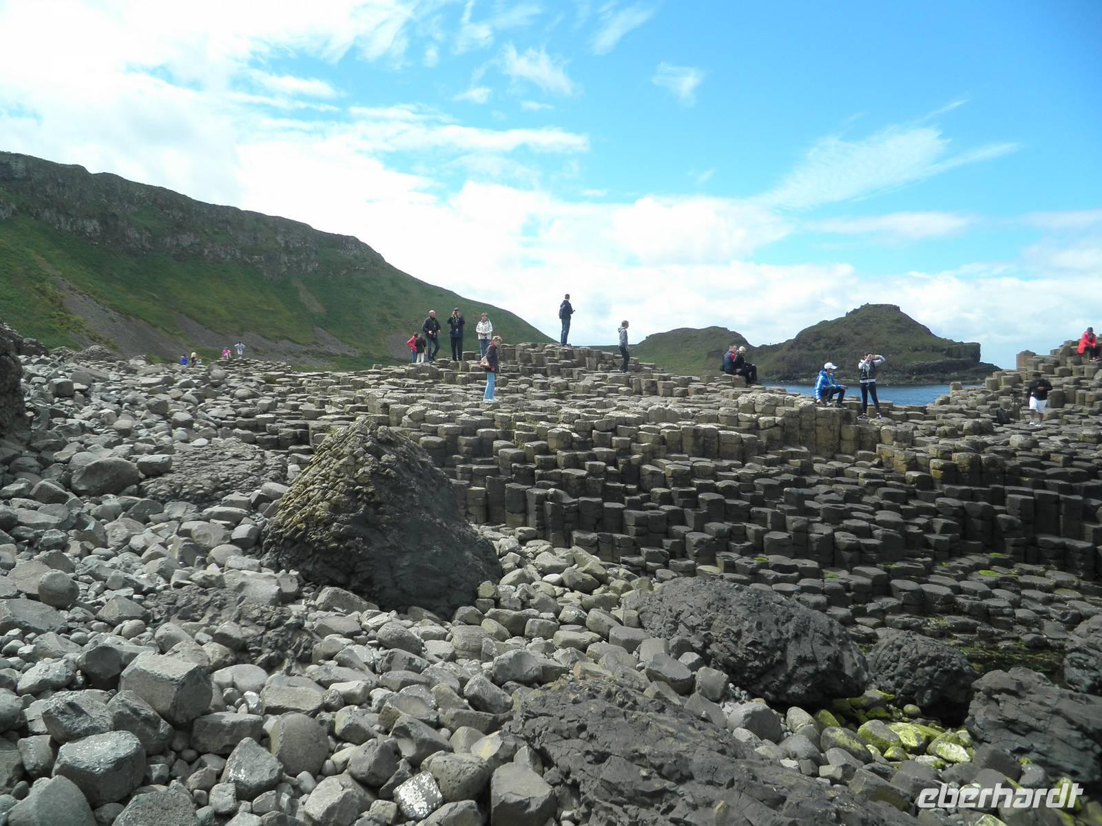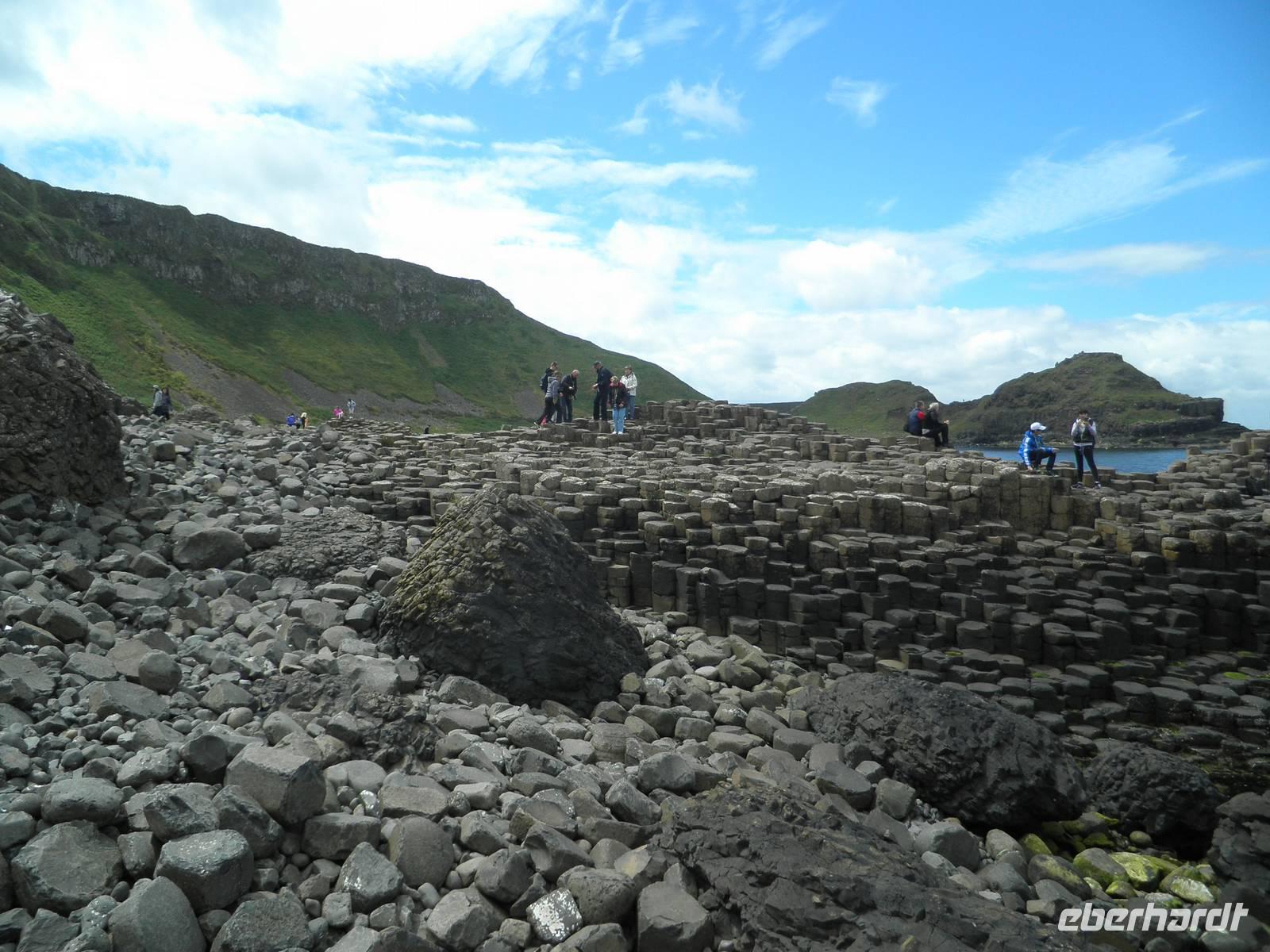 Dieser Tag stand ganz im Zeichen der herrlichen Küste von Nordirland. Nachdem uns das Wetter die vergangenen Tage reichlich Regen beschert hatte, verwöhnte es uns heute mit Sonne und damit mit einer tollen Aussicht. Wir verließen Belgast am Morgen und fuhren entlang der romantischen Küstenstraße, die sich die Antrim Coast entlang schlängelt, Wir sahen malerische Buchten, schöne Fischerorte und graue Felsen, an denen sich die Brandung brach. In Carnlough machten wir Pause und genossen die Seeluft und die Armosphäre im kleinen Fischerhafen des Ortes. Nach einem Kaffee fuhren wir weiter nach Norden. Unser Mittagessen fand am Bus statt direkt an einem Aussichtspunkt hoch über der atemberaubenden Küste. Nach weiterer kurzer Fahrt erreichten wir schließlich die wohl beeindruckendste Sehenswürdigkeit Nordirlands, die die Natur geschaffen hat: Giant's Causeway. Wir spazierten hinunter ans Meer und kletterten auf den beeindruckenden Basaltsäulen umher, die laut einer Legende der Riese Finn hier ins Meer geworfen hat, um einen trockenen Weg hinüber nach Schottland zu bauen. Doch sein schottischer Gegenspieler, der auch ein Riese war, hat bei seiner Flucht über den Causeway die Säulen hinter sich zerstört, so dass heute der Weg des Riesen einfach in den Fluten endet. Diese Legende ist unterhaltsam, aber tatsächlich hat erkaltende Lava diese Basaltsäulen geformt. Ihr besonderes Merkmal ist ihre Form, sie sind alle als 5-, 6- oder 8-Eck geformt, einige weisen sogar eine Höhe von bis zu 12 Metern auf. Nach diesem wirklich beeindruckenden Naturerlebnis fuhren wir nach Derry / Londonderry. Die besterhaltene Stadtmauer in Großbritannien lädt zu einem Spaziergang ein. Etwa eintausendfünfhundert Meter ist sie lang und so kann man eine ganze Runde auf ihr gehen und dabei die Altstadt erkunden. In der Stadt ist die jüngere Vergangenheit noch deutlich zu spüren. Am Eingang des Stadtteils Bogside gibt es verschiedene Wandgemälde, die u.a. an den sogenannten Blutsonntag am 30.01.1972 erinnern. An diesem Tag sind viele junge Menschen bei Unruhen durch Schüsse des britischen Mitiltärs ums Leben gekommen. "Free Derry" steht auf einem weißen Stein, der die irische Fahne trägt.