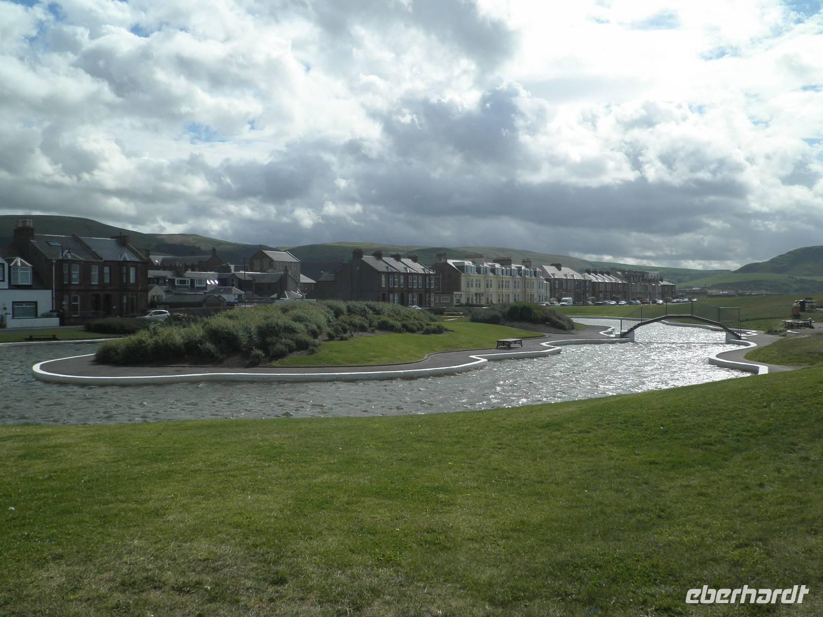 Nachdem wir wohlbehalten die Insel Anglesey erreicht hatten, die schon zu Wales gehört, machten wir recht bald eine Pause im Ort mit dem wohl längsten Ortsnamen in Großbritannien. Der Name besteht aus 58 Buchstaben und wir hatten einigen Spaß daran, das überdimensional breite Ortsschild am Bahnhofsgebäude von Llanfair... zu fotografieren.