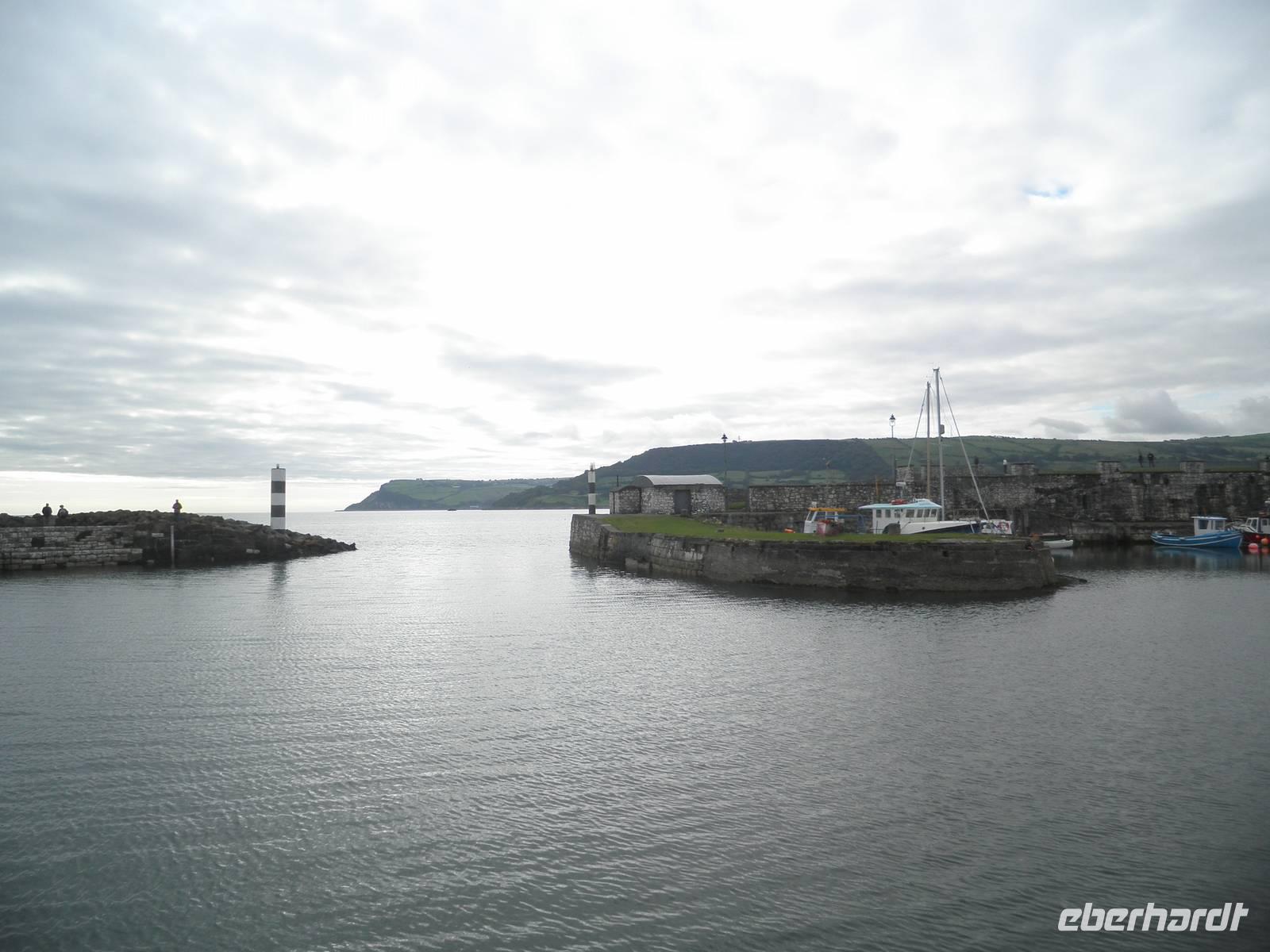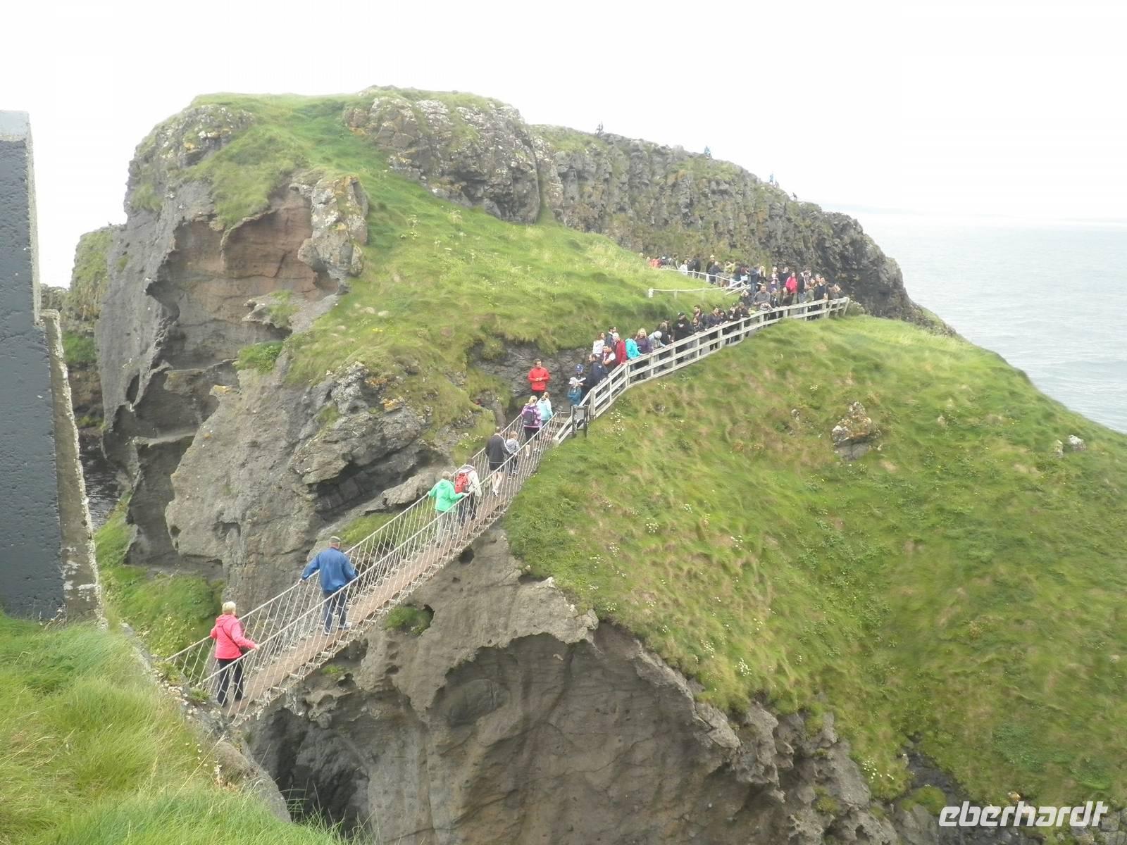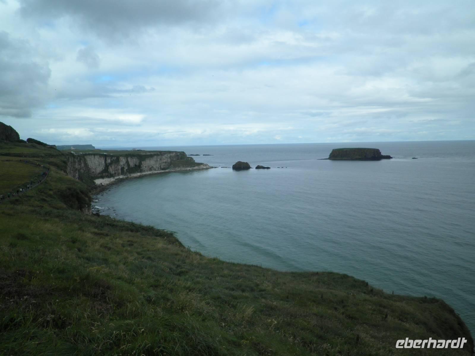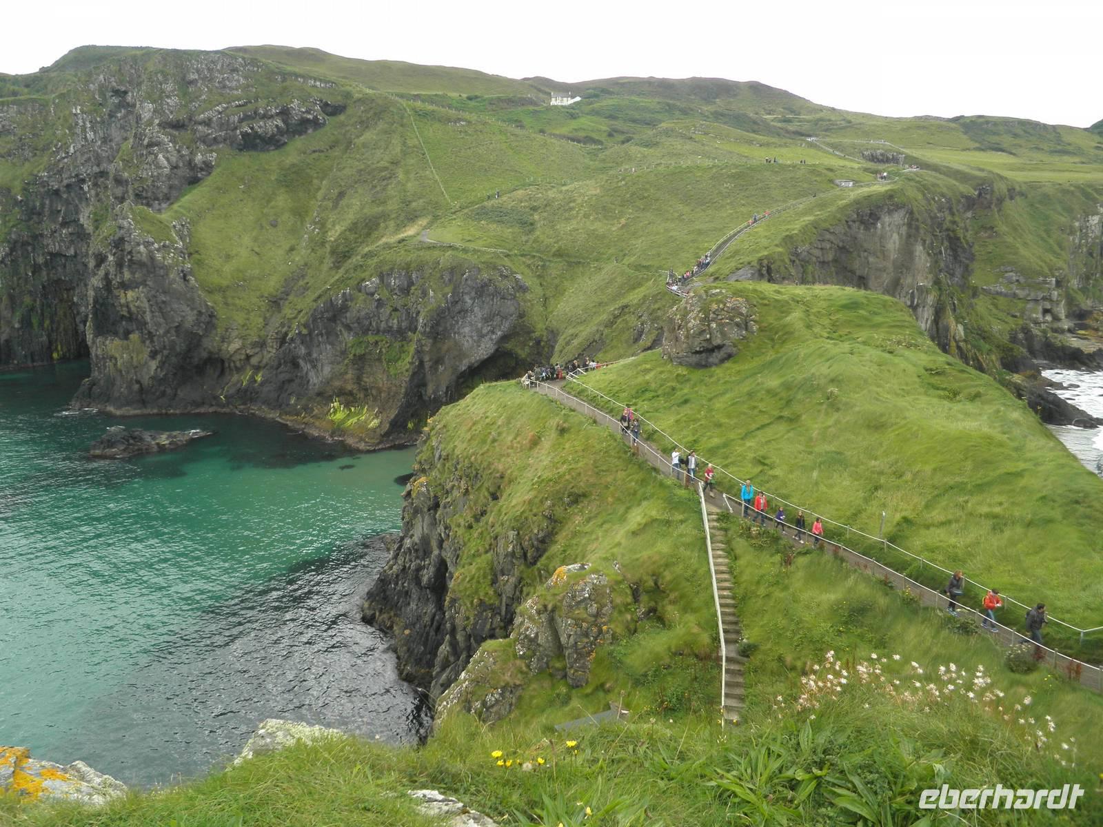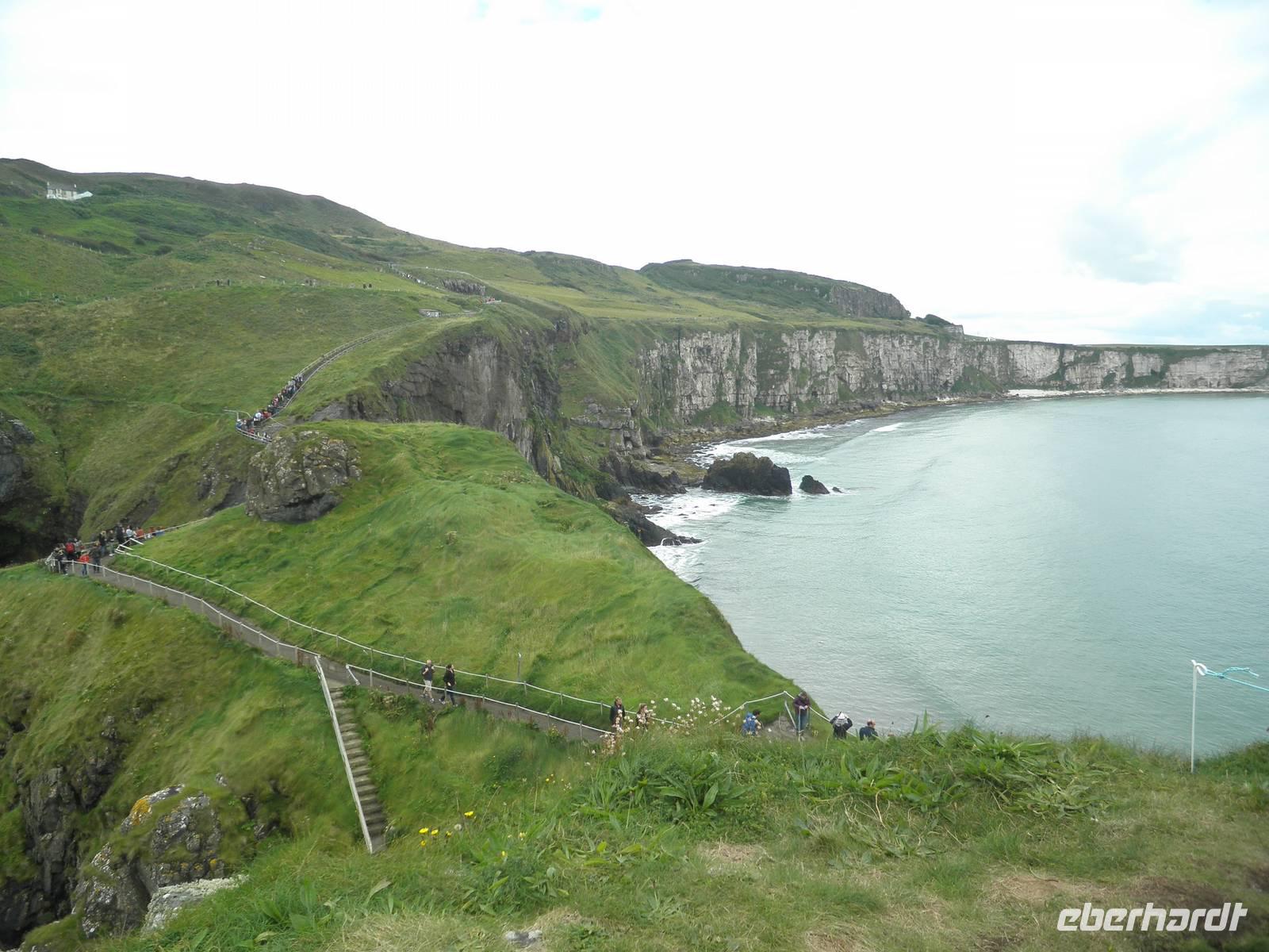 Dieser Tag stand ganz im Zeichen der herrlichen Küste von Nordirland. Das Wetter verwöhnte uns heute mit Sonne und damit mit einer tollen Aussicht und ab und zu gab es auch etwas Regen. Wir verließen Belfast am Morgen und fuhren entlang der romantischen Küstenstraße, die sich die Antrim Coast entlang schlängelt. Wir sahen malerische Buchten, schöne Fischerorte und graue Felsen, an denen sich die Brandung brach. In Carnlough machten wir Pause und genossen die Seeluft und die Armosphäre im kleinen Fischerhafen des Ortes. Nach kurzem Aufenthalt fuhren wir weiter nach Norden entlang der atemberaubenden Küste. Eine Herausforderung der besonderen Art ist eine schmale Seilbrücke, Carrick-a-Rede. Sie führt auf einen Felsen im Meer, man überquert schwankend einen 30 Meter tiefen Spalt über dem Wasser. Einige Gäste trauten sich und bezwangen diese 20 Meter lange schmale Hängebrücke und genossen herrliche Ausblicke auf die wunderschöne Küste. Nach weiterer kurzer Fahrt erreichten wir schließlich die wohl beeindruckendste Sehenswürdigkeit Nordirlands, die die Natur geschaffen hat: Giant's Causeway. Wir spazierten hinunter ans Meer und kletterten auf den unzähligen Basaltsäulen umher, die laut einer Legende der Riese Finn hier ins Meer geworfen hat, um einen trockenen Weg hinüber nach Schottland zu bauen. Doch sein schottischer Gegenspieler, der auch ein Riese war, hat bei seiner Flucht über den Causeway die Säulen hinter sich zerstört, so dass heute der Weg des Riesen einfach in den Fluten endet. Diese Legende ist unterhaltsam, aber tatsächlich hat erkaltende Lava diese Basaltsäulen geformt. Ihr besonderes Merkmal ist ihre Form, sie sind alle als 5-, 6- oder 8-Eck geformt, einige weisen sogar eine Höhe von bis zu 12 Metern auf. Nach diesem wirklich beeindruckenden Naturerlebnis fuhren wir nach Derry / Londonderry. Die besterhaltene Stadtmauer in Großbritannien lädt zu einem Spaziergang ein. Etwa eintausendfünfhundert Meter ist sie lang und so kann man eine ganze Runde auf ihr gehen und dabei die Altstadt erkunden. In der Stadt ist die jüngere Vergangenheit noch deutlich zu spüren. Am Eingang des Stadtteils Bogside gibt es verschiedene Wandgemälde, die u.a. an den sogenannten Blutsonntag am 30.01.1972 erinnern. An diesem Tag sind viele junge Menschen bei Unruhen ums Leben gekommen. "Free Derry" steht auf einem weißen Stein, der die irische Fahne trägt.