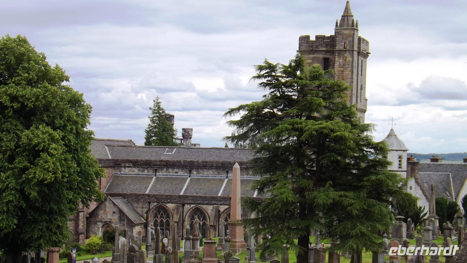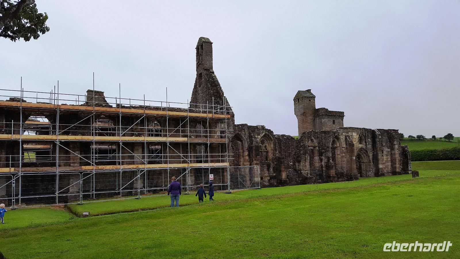 Und es ging es weiter nach Jedburgh. Die Abbey of St. Mary of Jedburgh blieb obgleich ohne Dach bemerkenswert erhalten, typisch für den Stil im späten 12. Jahrhundert die romanischen Rundbögen mit gotischen Spitzbögen. Ein prachtvoll gestaltetes Portal und die Fensterrose blieben im Westflügel erhalten. Nach einem Mittagsimbiß fuhren wir zügig nach Edinburgh- wo unsere Fluggäste schon ungeduldig auf uns warteten. Obwohl wir von unterwegs das Hotel verständigt hatten, dass wir später kommen, hat es ihnen leider niemand mitgeteilt.