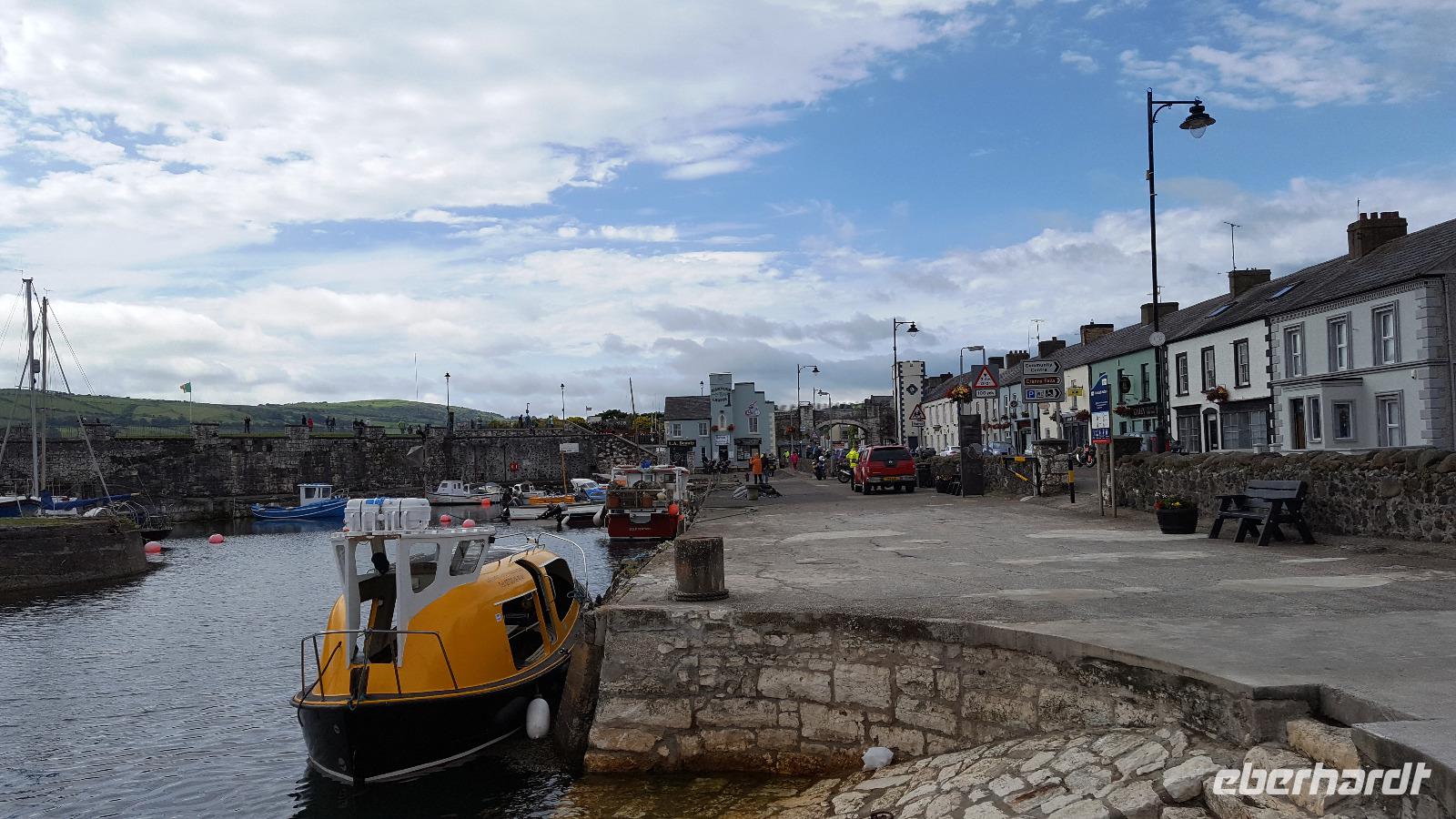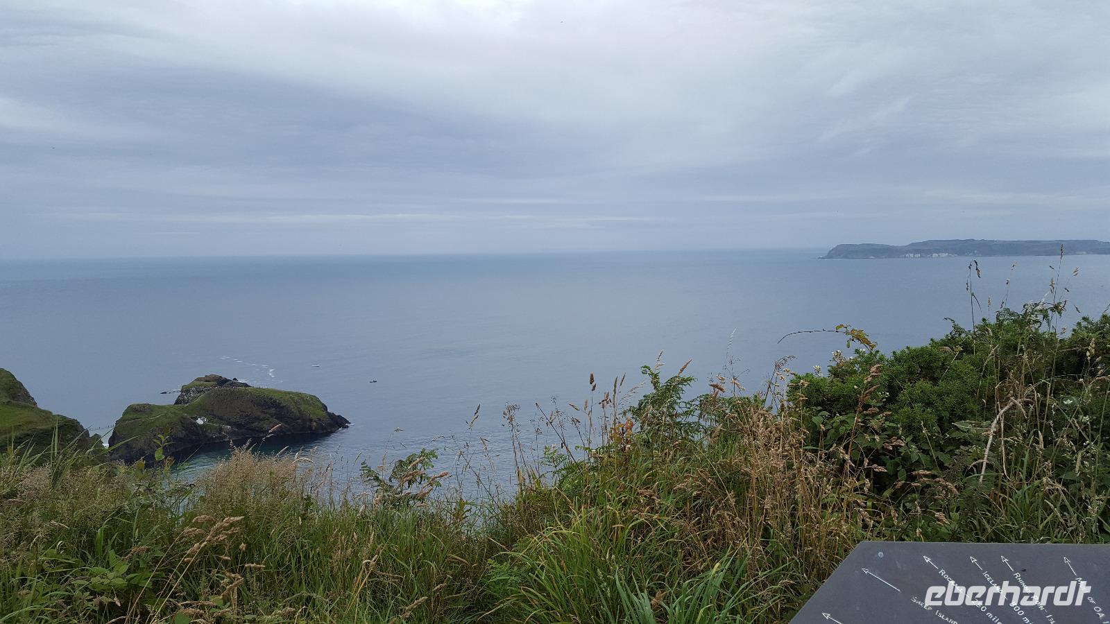 Heute heißt unser Ziel Giants Causeway. Wir entscheiden uns für die Küstenstraße und werden nicht enttäuscht. Die Wolken reißen auf und dies sorgt dafür, dass wir an unseren Stops in Carrickfergus-Castle und später Carnlough wundervolle Fotos bekommen. Leider kostet die Küstenstraße viel Zeit, in Carrick-a-Rede ist daher nur ein kurzer Stop an der Hängebrücke möglich, zumal wir dort den Parkplatz nicht nutzen konnten. So fuhren wir ein Stück zurück zum Aussichtspunkt Portaneery, von hier hatte man auch einen Blick auf die Carrick-a-Rede Rope Bridge. Der Name der Insel bedeutet „Fels im Weg", hier vor allem für die Lachse, da die kleine Felsinsel genau im Weg der Lachse zu ihren Laichplätzen liegt. Sie müssen um die Insel herum schwimmen und sind daher leicht mit einem Netz zu fangen. Außerdem finden die vielen Seevögel hier entsprechend Nahrung. Die Hängebrücke ist für Fußgänger (die sich trauen), sie überspannt die 20 Meter breite Meerenge in einer Höhe von ca. 30 Metern. Wir hatten einen tollen Blick auf Rathlin Island und bis nach Schottland.
