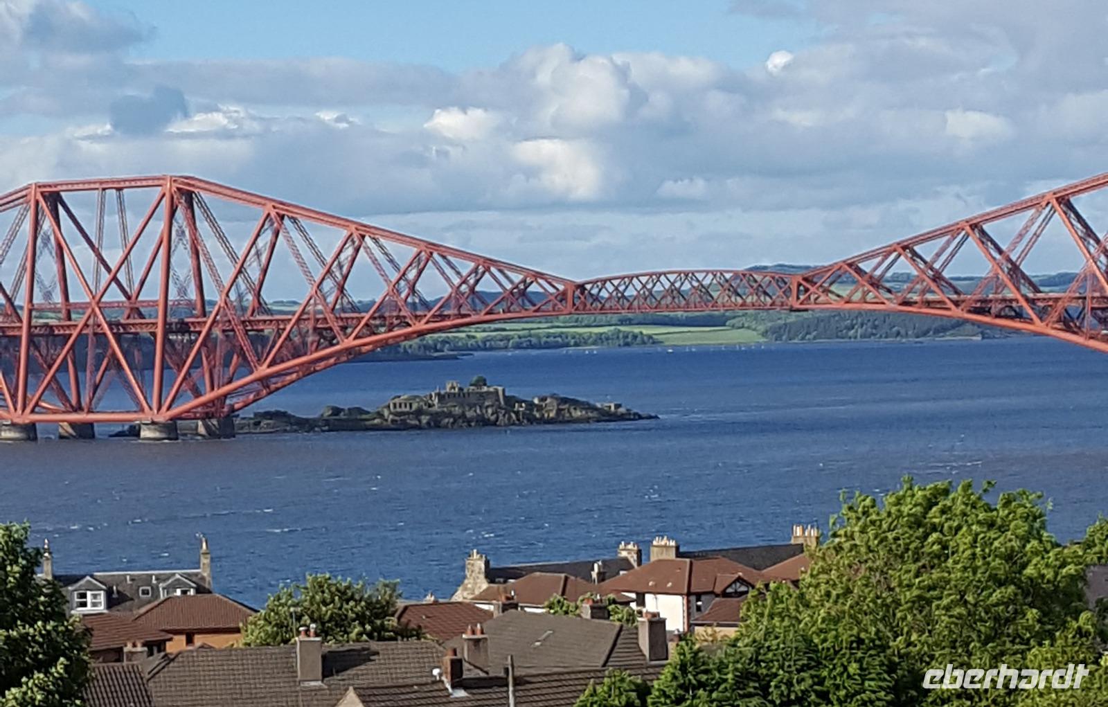 Dann verabschieden wir uns von Ed, wir fahren weiter zum Hotel in Grangemouth. Unterwegs machen wir noch einen Abstecher nach South Queensferry an die Mündung des Flusses Forth. Hier steht die Forth Road Bridge, eine Hängebrücke mit 2517 Metern Länge, damals (1958 bis 1964 erbaut) die größte Brücke ihrer Art in Europa. Sie besteht aus fast 47.000 t Stahl und darin eingeschlossen fast 50.000 km Drahtseile des Tragwerks. Parallel dazu verläuft die Eisenbahnbrücke. Seit 2014 wird mit der Queensferry Crossing eine weitere Straßenbrücke über den Firth gebaut, die die Forth Road Bridge entlasten und teilweise auch ersetzen wird. Diese soll bis Februar 2017 fertiggestellt sein.