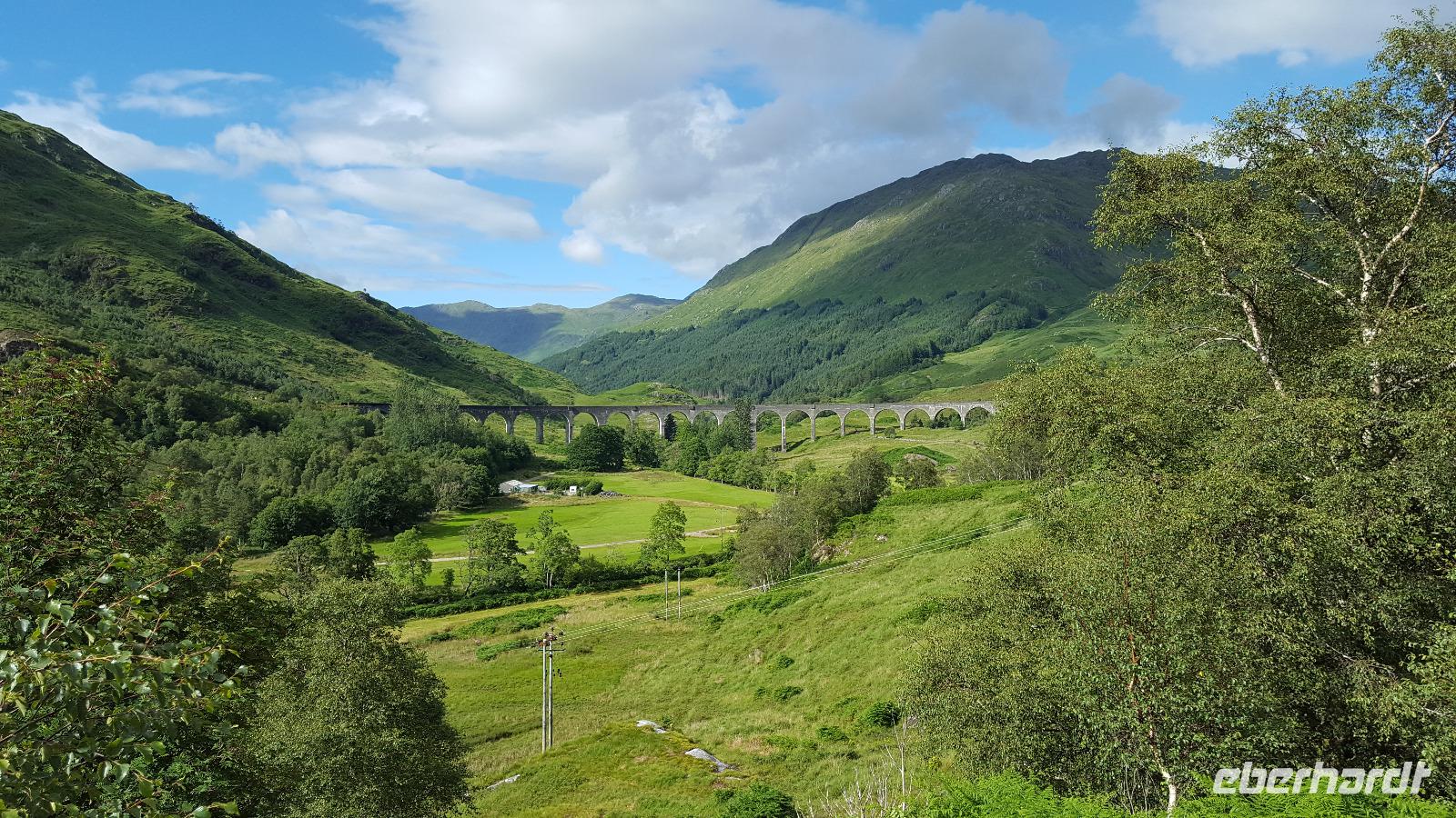 Weiter geht unsere Fahrt wieder nach Süden, wir folgen dem Loch Ness nach Drumnadrochit. Hier machen wir am Loch Ness Center einen kurzen Fotostop und fahren dann zum Urquhart Castle. Diese Festung war strategisch so wertvoll, dass sie am Ende keine Feindesmacht zerstörte sondern die eigene Besatzung. Im Zuge der Jakobitenaufstände widerstand Urquhart Castle 1690 noch den Versuchen der Jakobiten, die Festung einzunehmen. Doch die Grants, deren Clan die Burg im 16. Jahrhundert zugesprochen bekam, zogen danach ihre Truppen ab und sprengten Urquhart in die Luft. Es wurde danach nie wieder aufgebaut. Zur Geschichte konnten wir einen eindruckvollen Film anschauen, am Ende wurde dann der Vorhang des Kinos aufgezogen und die Burg lag malerisch vor uns. Jeder kann nun individuell die Burg erkunden. Es beginnt leicht zu nieseln, wir fahren weiter nach Fort Augustus. Die Schleusentreppe hier hat 5 Stufen und wir haben Gelegenheit, einen Schleusen-Vorgang zu beobachten. Weiter geht die Fahrt Richtung Süden zur Spean Bridge. Hier steht ein Denkmal für die gefallenen Soldaten, deren Ausbildungscamps hier waren. Die Sonne kommt wieder und zaubert eine einzigartige Landschaft aus Bergen, Tälern, Licht und Schatten. Gegen 17 Uhr kommen wir dann in Fort William an, wie Fort Augustus eine Festung der Briten gegen widerspenstige Schotten. Wir nutzen die Gelegenheit und fahren noch zum Glenfinnan Monument. Nach einem kleinen Aufstieg wird alle Mühe belohnt- ein phantastischer Blick über den Loch Shield, und auf der anderen Seite das Viadukt von Glenfinnan, bekannt durch die Harry Potter Filme, denn hier fuhr der Hogwarts Express. Die Sonne taucht alles in wunderbares Licht- ein toller Tagesabschluss. Dieser wird jedoch noch gekrönt- auf der Rückfahrt zum Hotel zeigt sich der Ben Nevis ohne Nebel- oder Dunstkappe in voller Pracht!