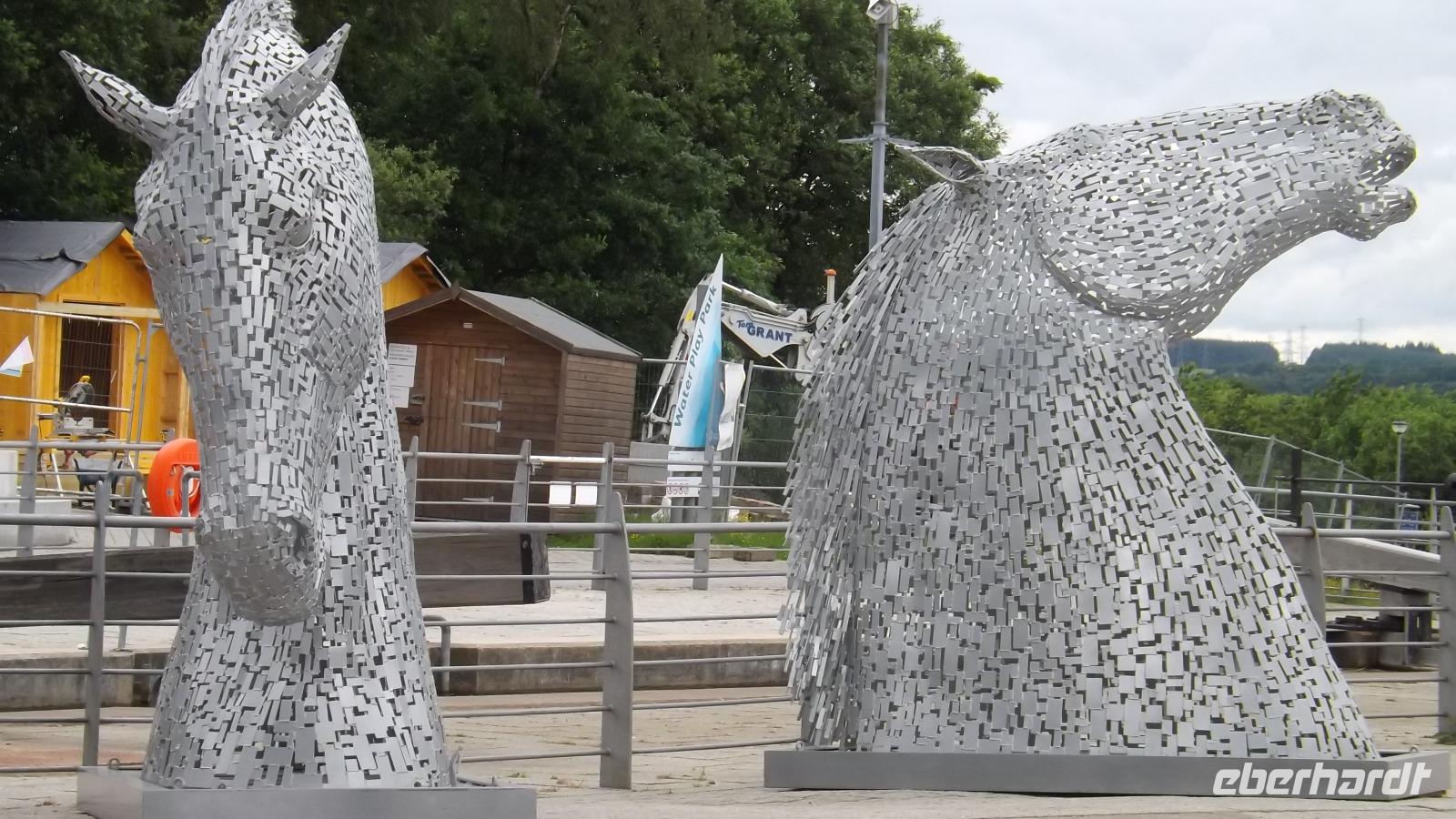 Heute fahren wir zuerst zum Falkirk Wheel, einem Schiffshebewerk als eine Art Riesenrad. Es ist einmalig auf der Weilt und wurde ab 1998 als Teil des Millenium Link gebaut. Am 24.05.2002 wurde es durch Königin Elisabeth II. anläßlich ihres goldenen Thronjubiläums feierlich eröffnet. Mit einer Bootsfahrt können wir uns von der Funktionsweise beeindrucken lassen: 2 Gondeln sind an einer riesigen Radnabe angebracht, mit minimalem Kraftaufwand in einer halben Drehung vertauschen die Gondeln ihre Positionen nach dem archimedischen Prinzip in knapp 4 Minuten.