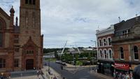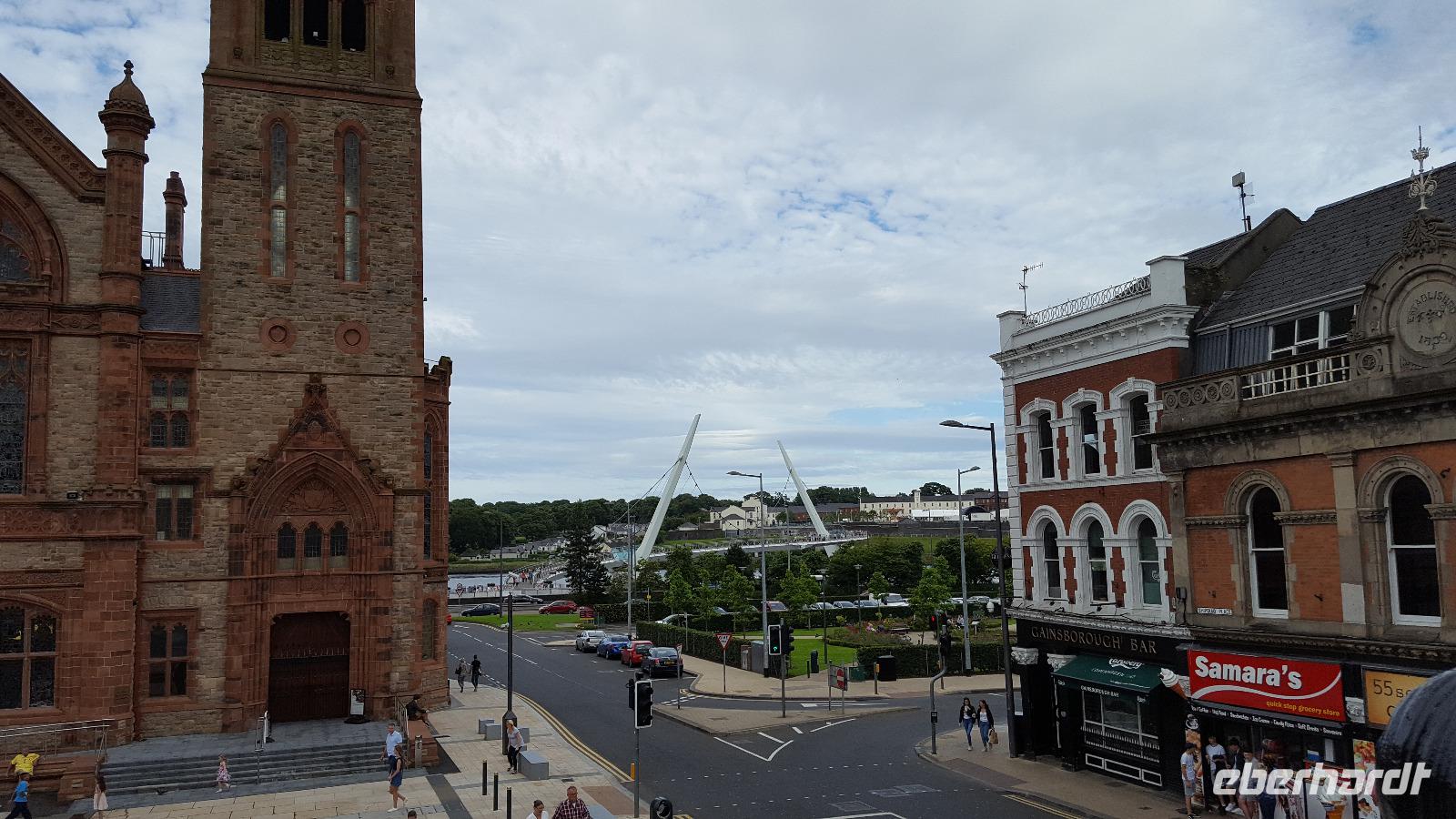 Gegen Mittag kommen wir in Giants Causeway an und bleiben bis gegen 15 Uhr, mit einem Audio Guide werden Geschichte und Besonderheiten vorgestellt, ein unglaubliches Naturschauspiel. Weiter fahren wir nach Londonderry mit einem Zwischenstopp am Magheracross mit Blick auf Dunluce Castle. Wir erreichen Londonderry, leider ist Sonntag und die Tourist-Info geschlossen, so gibt es keine Pläne / Maps, auf der alten Stadtmauer können wir einen Rundgang machen. Derry oder Londoderry- für manche ist sie die „Schrägstrich-Stadt", einige nennen sie „Maiden City", weil sie trotz Belagerung nie eingenommen wurde, für andere ist sie die „Walled City", eine von Mauern umgebene Stadt, wieder andere nennen sie einfach Foyle, nach dem Fluß der durch sie fließt. Der ursprüngliche Name war Doire- irisch für Eichenwald. Traurige Berühmtheit erlangte die Stadt 1972. Am 30. Januar wurden bei einer Demonstration für Menschenrechte in der Stadt 13 Menschen von britischen Soldaten erschossen und weitere verletzt. Da die Opfer unbewaffnet waren kam es zur Eskalation der Nordirland-Konfliktes. Erst spät - 2010- entschuldigte sich der britische Premier Cameron für diese Taten.