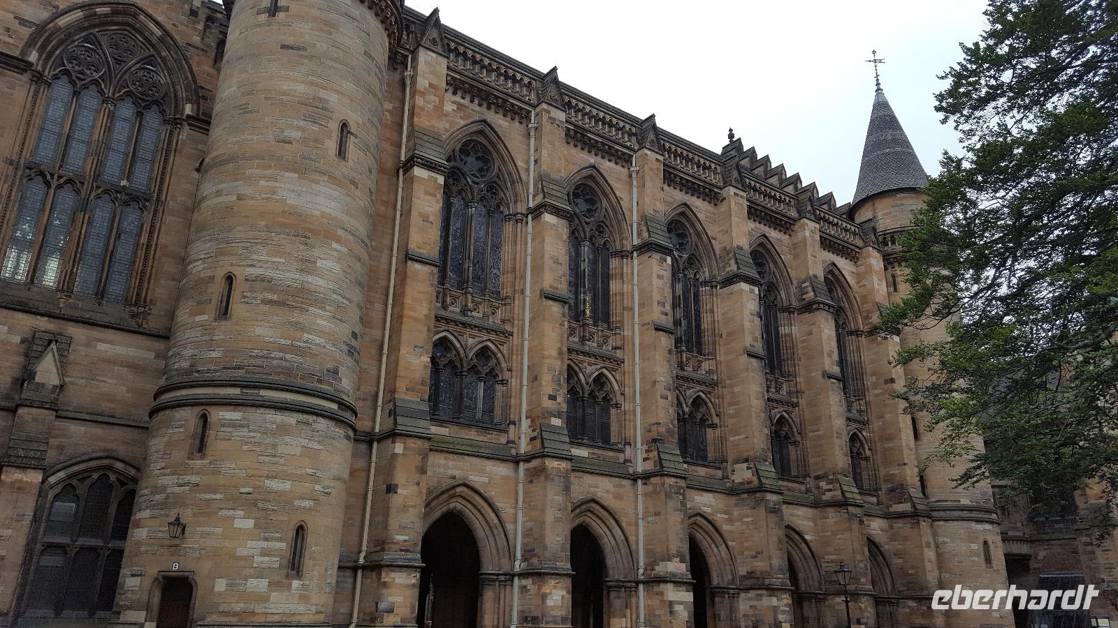 Wir fahren heute nach Glasgow, unser Stadtführer Ian erwartet uns an der Bothwell Street, das Stadtzentrum selber ist gesperrt, da gerade der Fußball Worldcup der Obdachlosen hier ausgetragen wird. Es folgt eine Stadtrundfahrt mit kleinen Spaziergängen, z.B. durch die University of Glasgow, die Glasgow Kathedrale, zum Peoples Palace, leider können wir den Wintergarten nicht besuchen, er ist gesperrt, da sich letzte Woche eine Glasplatte gelöst hatte und zu Boden fiel. Ringsherum waren an den Zäunen Panels aufgehängt mit gestrickten oder gehäkelten Quadraten- jedes einzelne stand für einen der Glasgower Soldaten, die 1916 in der Schlacht an der Somme gefallen waren- insgesamt 3800.