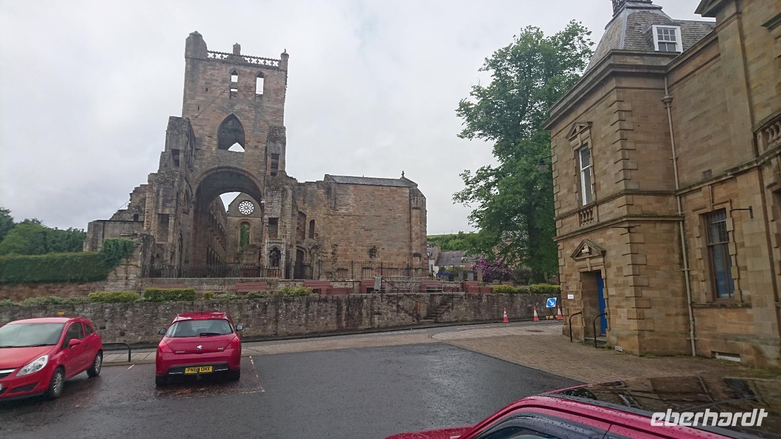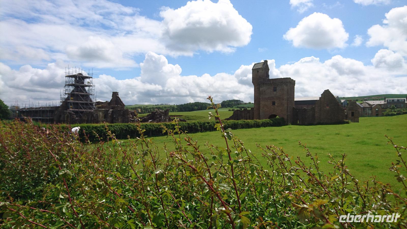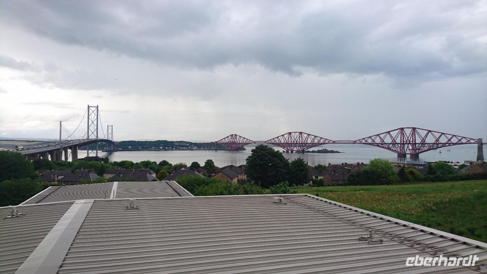 Am Morgen weckte man uns an Bord mit einem Rundruf und wir hatten noch genügend Zeit, um uns frisch geduscht das Frühstück schmecken zu lassen. Währenddessen legte die Fähre bereits im Fährhafen von Newcastle upon Tyne an. Wie mit Stefan besprochen, trafen wir uns auf Deck 8, stellten die Uhren um eine Stunde zurück auf englische Zeit, die uns nun die nächsten Tage begleiten sollte, und konnten dann recht schnell hinunter zur Passkontrolle. Das Vereinigte Königreich, noch EU-Mitglied und doch stets um seine Einreisenden bemüht, begrüßte uns mit Wind und etwas Regen und so störte es uns nicht, dass die Passformalitäten etwas länger dauerten. Thomas musste mit dem Bus auch noch warten und schließlich trafen wir doch alle am Fährterminal zusammen, konnten also nach den Klängen der Hymne des Vereinigten Königreiches und dem Schwenken der beiden hier gültigen Fahnen, der Union Jack und der Fahne Englands, unsere Reise gen Schottland beginnen. Stefan erzählte uns über die alten Römer, die von Newcastle bis hinüber nach Carlisle einst nach dem Antoniuswall weiter nördlich hier den Hadrianswall errichteten und bald erreichten wir den schottischen Grenzstein, wo uns der Borderpiper mit Dudelsack im Regen empfing. Von da ging es weiter nach Jedburgh. Im Schatten der Abbey-Ruine nahmen wir unseren Mittagsimbiss ein und starteten dann wieder gen Edinburgh. Am Nachmittag nahmen wir dort am Brooks-Hotel unsere Fluggäste auf, die schon am Vortag ankamen und die Stadt bereits auf eigene Faust erkundeten. Unsere Stadtführerin Majorie zeigte uns nun noch ganz andere Seiten ihrer Heimatstadt und brachte uns die Schotten mit Witz und guten Anekdoten näher, ehe wir das Castle besichtigten und nach diesen gewaltigen Eindrücken die Stadt per Bus verließen. Am Firth of Forth fuhren wir über die berühmte Road-Bridge, schauten vom Aussichtspunkt auch zur Railroad-Briodge und zur Baustelle der dritten, wohl noch 2017 oder 2018 fertigzustellenden neuen Straßenbrücke als wichtige Verbindung von Schottlands Hauptstadt in den Norden des Landes. Danach fuhren wir nach Livingston in unser Hotel und ließen dort den tag ausklingen.