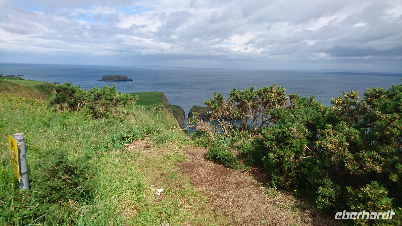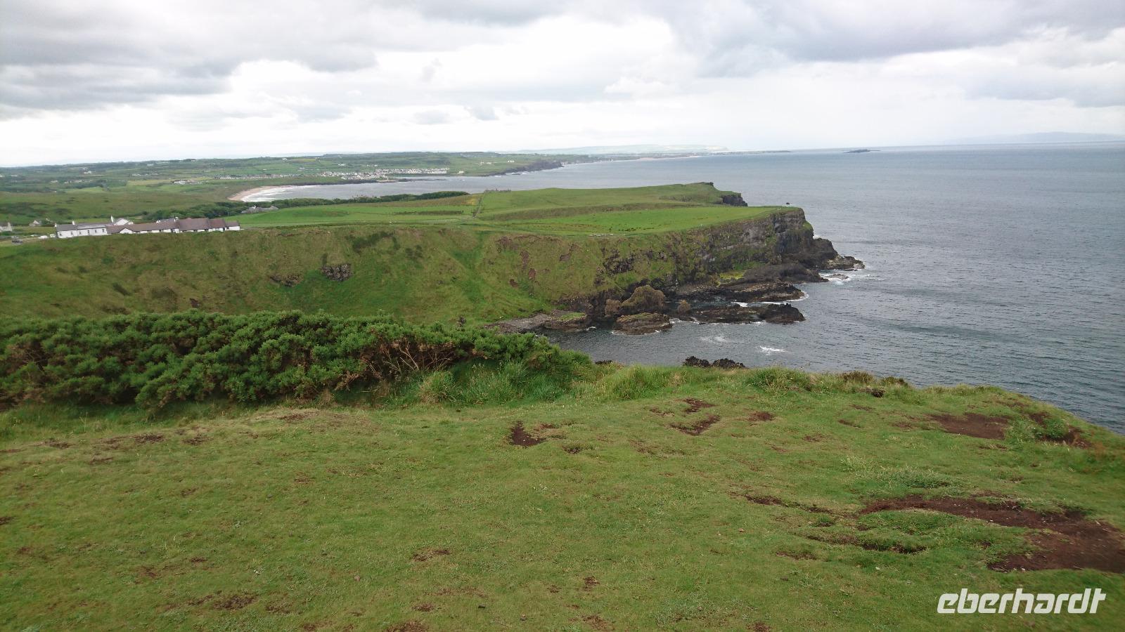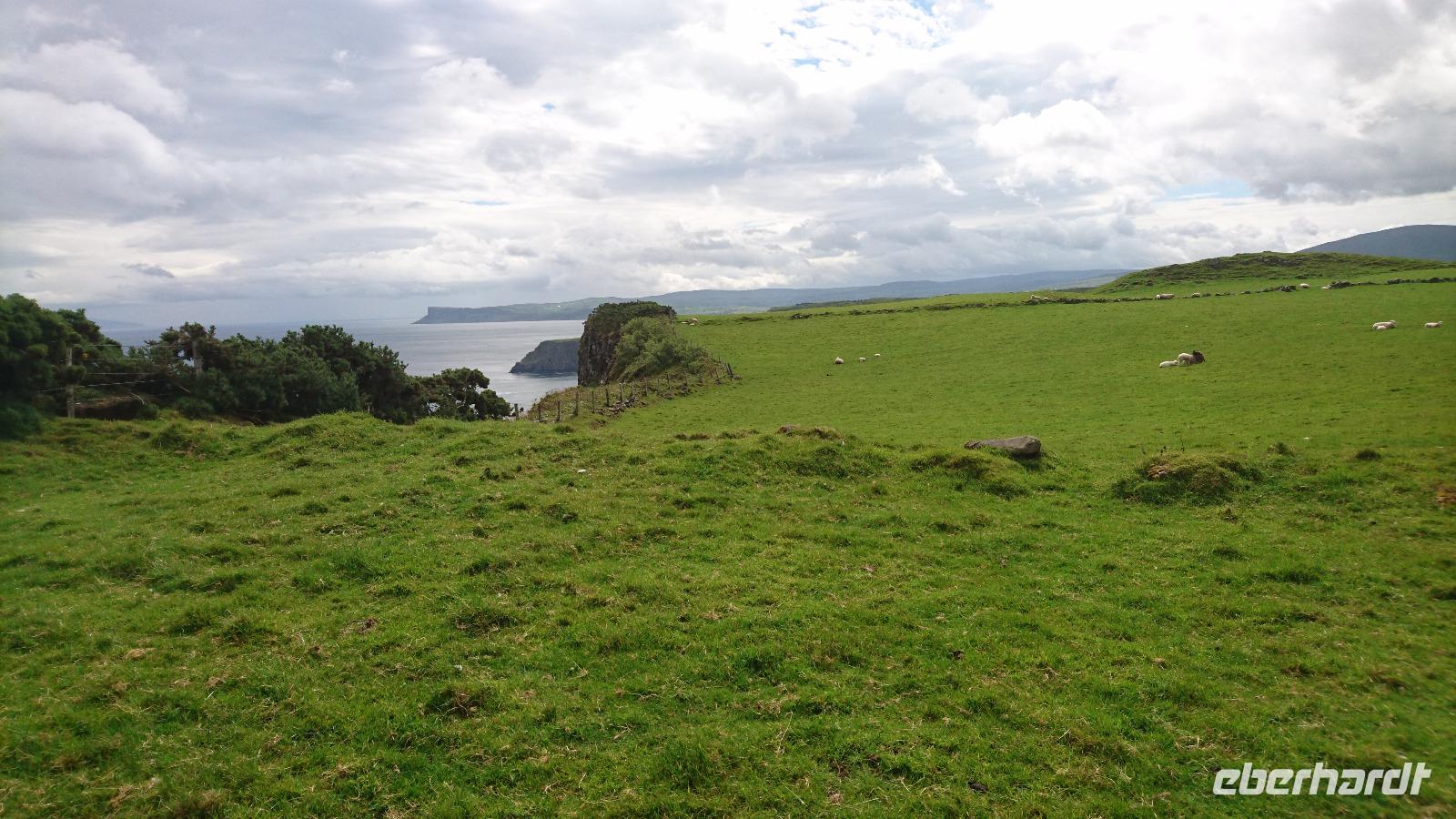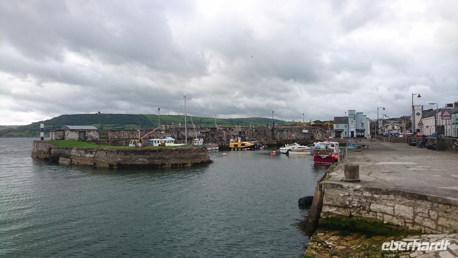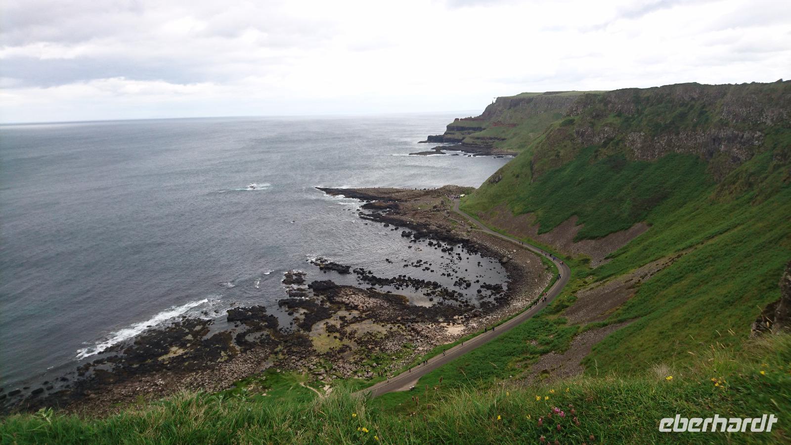 Heute sollte es nicht regnen. Nein, der Wetterbericht sagte ganz Anderes, aber wir wünschten es uns. Denn heute wollten wir die Brücke der Riesen, Giants Causeway, die einstige Basalt-Verbindung zwischen Schottland und Irland besichtigen. Stefan berichtete schon am Morgen von der alten Sage vom Riesen Finn Mc Cool und seinem Herausforderer Brenneghan, wir stoppten unterwegs an einem alten Militär- und Rebellenhafen in Cairnalough und sahen von dort schon schroffe Küsten. Wenig später, als wir wieder in den Bus einstiegen, fanden wir alle schottische Kekse auf unseren Sitzplätzen. Nett. Warum aber schottische Kekse in Irland? Da klappten die Video-Monitore des Busses herunter und die Wings sangen Mull of Kintyre. Stefan zeigte nach Osten. Erst schemenhaft, dann deutlicher erkannten wir dort in der Ferne Land. Schottland. Eben jenes Mull of Kintyre. Die Kekse waren also noch ein Gruß von Schottland herüber über die irische See. Sehr nett! Dann fuhren wir, beschwingt von irischer Musik, zur Rope Bridge, wo seit Urzeiten Menschen einfach Lachse fingen, weil diese dachten, die Enge zwischen Land und einem Felsen wäre der Ausfluss einen Flusses, den sie hinauf schwimmen wollten. Unterwegs zum Besucherzentrum von Giants Causeway sahen wir noch einige alte Burgruinen und verfallene Bauernhäuser, die eine sagenhafte Mystik über die Gegend legten, ehe wir wirklich an der Brücke der Riesen ankamen. Audioguides wiesen uns den Weg und brachten uns viele Informationen über die Entstehung, aber auch die Sagenwelt der Landschaft an der irischen Nordküste, die wir nun erreichten. Dazu gab es einige Souvenirs ganz im Stil der Basaltsäulen und manch einer probierte noch den Irish Stew, einen traditionellen Lamm-Kartoffel-Gemüse-Eintopf in der Versorgungseinheit oder lauschte der Live-Music im Giants-Causeway-Hotel neben dem Besucherzentrum. Später fuhren wir weiter und sahen noch die Ruinen des Dunluce Castle, welches einst ein Mac Donald auf der Flucht von Glen Coe gründete und das heute aufgrund seiner Lage auf einem Felsvorsprung jedes Jahr etwas kleiner wird. Hier entlang, vom Ort Portrush nach Giants Causeway fuhr einst eine Straßenbahn. Kaum vorstellbar! Wir erreichten am Nachmittag die Stroke-City, die Stadt mit dem Schrägstrich. Denn für die Republikaner heißt sie Derry, für die Royalisten Londonderry. Und da sich keine öffentliche Einrichtung aus Angst vor Übergriffen festlegen will, schreiben alle beide Namen mit Schrägstrich in wichtige Druck- und Anzeigewerke. Stefan wanderte mit uns bei regen und Wind über die Stadtmauer und erklärte uns Vieles zur Stadt und der heutigen Situation dort, ehe wir einige Minuten Freizeit hatten, die wir trotz Sonntag in einem Einkaufszentrum zum Shoppen nutzen konnten, ehe es wieder weiter ging. Am Abend erreichten wir dann Letterkenny, bemerkten auf der Fahrt hinüber gar nichts von der nordirisch-irischen Grenze, machten uns Gedanken darüber, wie all das als EU-Außengrenze beim erfolgreichen Austritt des Vereinigten Königreiches aus der EU einst aussehen wird, freuten uns, nun wieder Angaben in km/h und km lesen zu können und checkten mit Stefans Unterstützung im Hotel ein, wo es dann bald Abendessen und Nachtruhe, für einige noch einen Pub-Besuch gleich um die Ecke im Warehouse-Pub gab.