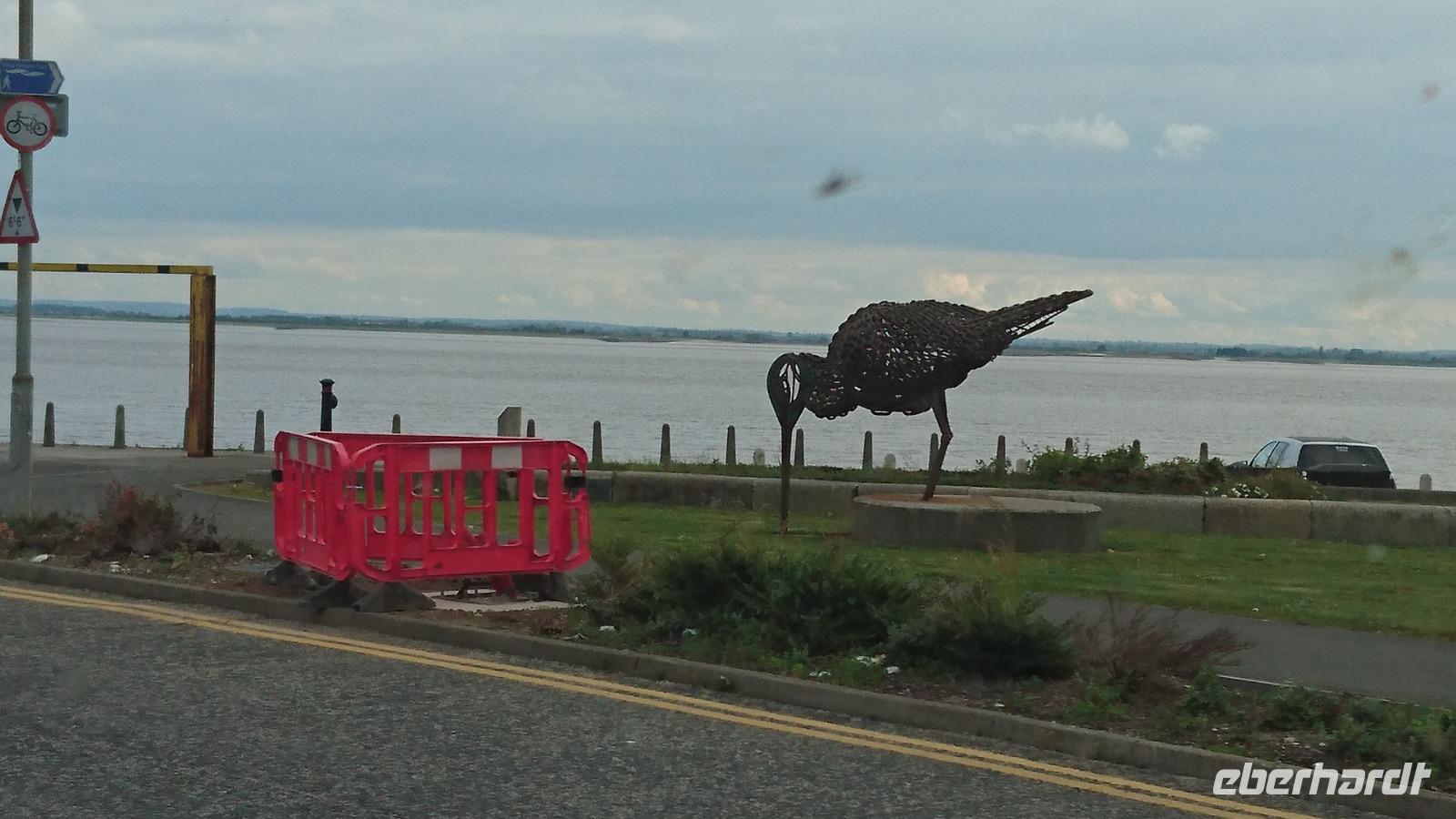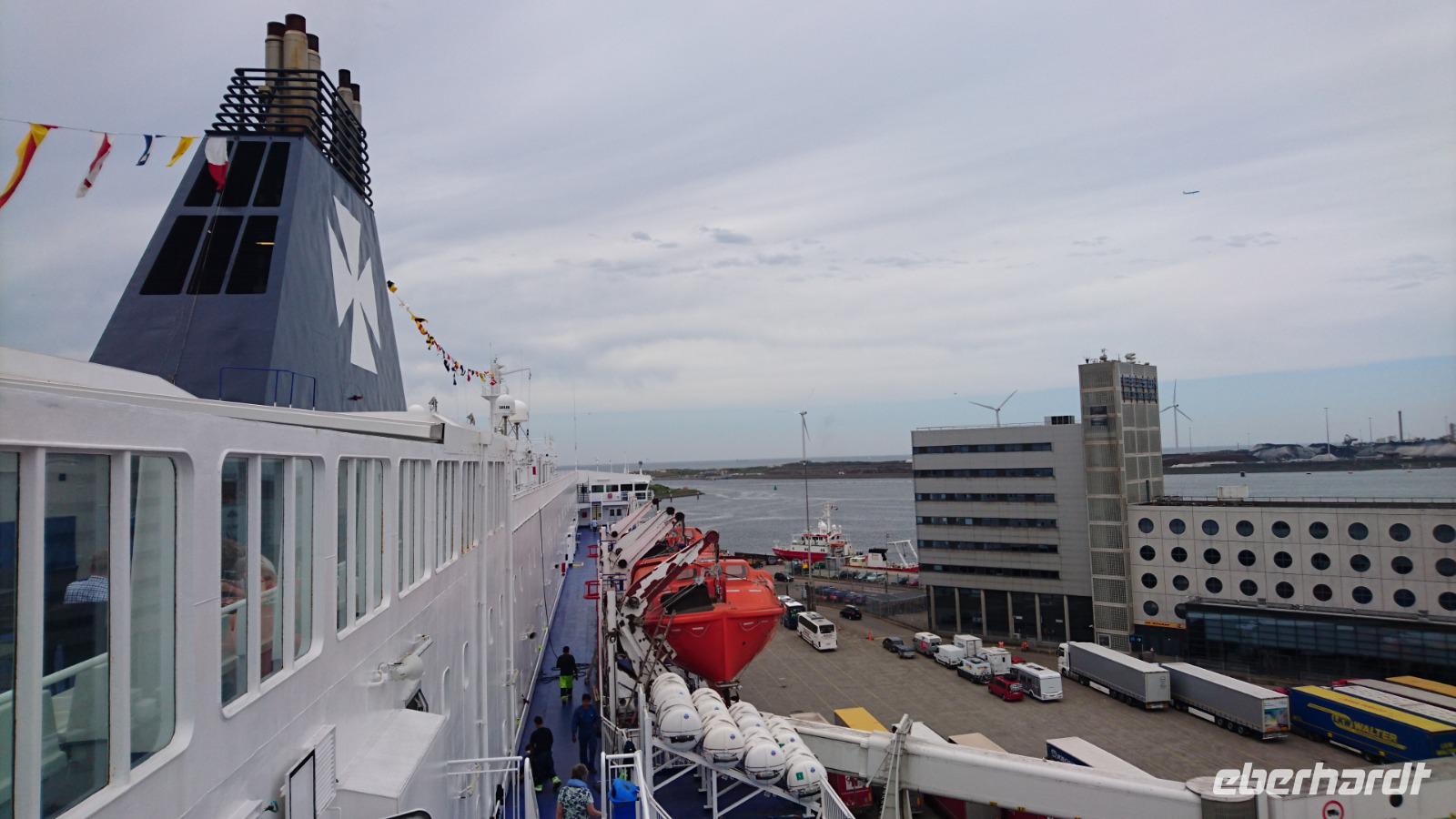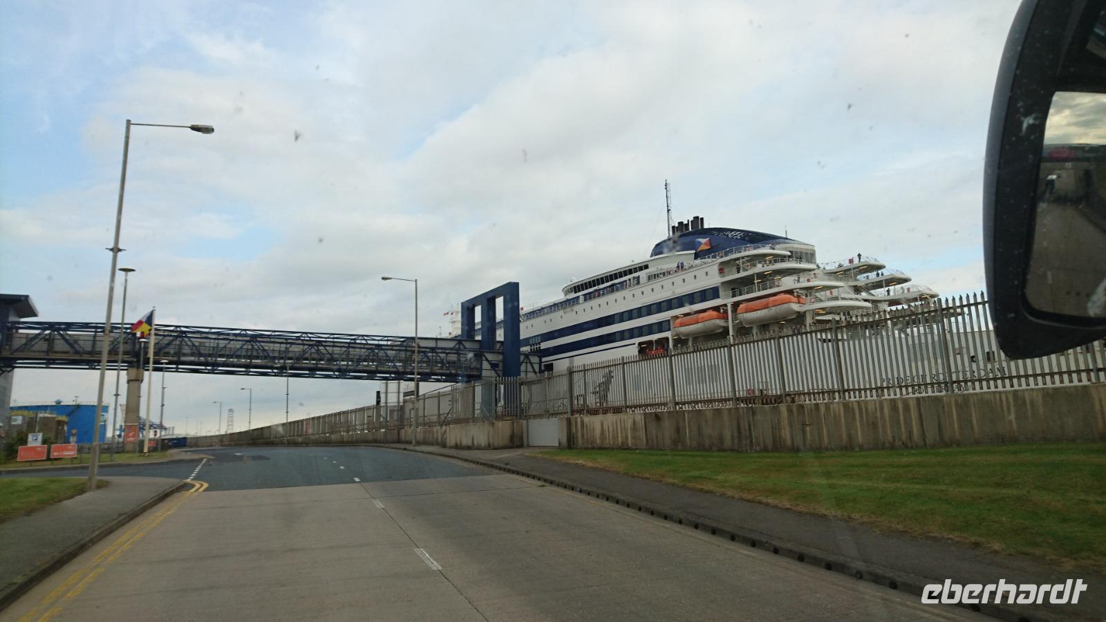 Der frühe Vogel...war einigen von uns heute sicher egal. Während unsere Fluggäste sich noch einmal herumdrehen konnten, mussten die Busgäste mit Holger und Stefan zeitig aus den Federn und an der Rezeption die Frühstückpacks entgegennehmen, ehe Holger mit dem trotz Innenstadtüberfüllungen zum Glück nahe abgeparkten Bus vor unserem Hotel anhielt und wir unser Gepäck verluden. Natürlich dachten wir wieder an unser Fährgepäck, um nicht mit den großen Koffern durch die schmalen Gänge der Nachtfähre nach Rotterdam gehen zu müssen. Dann ging es hinüber in den Fährhafen der Stena Line und bald nach dem Check-in an Bord des Schiffes nach Wales. Dort ruhten wir uns aus oder besuchten den Schiffsladen, um noch etwas für zuhause zu erwerben, sahen dann zu wie die Fähre Dublin verließ, die irische See querte und schließlich in Holyhead anlandete. Kaum waren wir an Land, erklang die Hymne von Wales und wir sahen die walisische Fahne, stoppten auf unserer Tour gen Osten quer über die Insel später im Ort mit dem längste Bahnhofsnamen der Welt, um auch hier noch ein wenig Souvenirs zu sehen oder zu erwerben, aßen später unsere Mittagswürstchen mit Blick auf die Menaistraße und die beiden Brücken Menai und Britannia. Dann konnte Stefan bereits berichten, dass unsere Fluggäste gut am Flughafen ankamen und bald an Bord der Maschine nach Frankfurt gehen würden. Später durchfuhren wir die Burgstadt Conwy und ließen noch einmal viele Fotos zum Heimnehmen entstehen, überquerten dann mit entsprechenden Pausen auch den höchsten Punkt englischer Autobahnen und stoppten noch einmal am Birch Service, einem kleinen Autohof, zu dem Stefan wieder spannende Geschichten auf Lager hatte, ehe unsere Ausweise im Schatten der Humber Bridge eingesammelt wurden, wir den P&O-Fährhafen in Kingston upon Hull erreichten, später unsere Bordkarten und Kabinenschlüssel erhielten, an Bord gingen, dort individuell den Abend an Bord und das Abendessen im Buffetrestaurant genossen und noch einmal über alles auf dieser schonen Reise nachdachten.