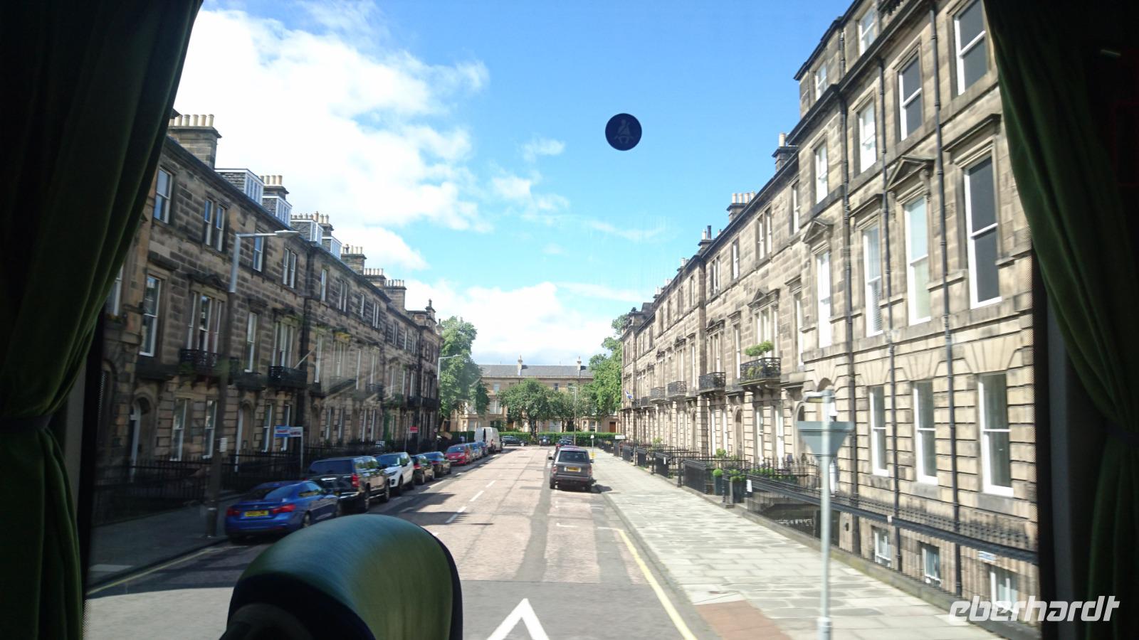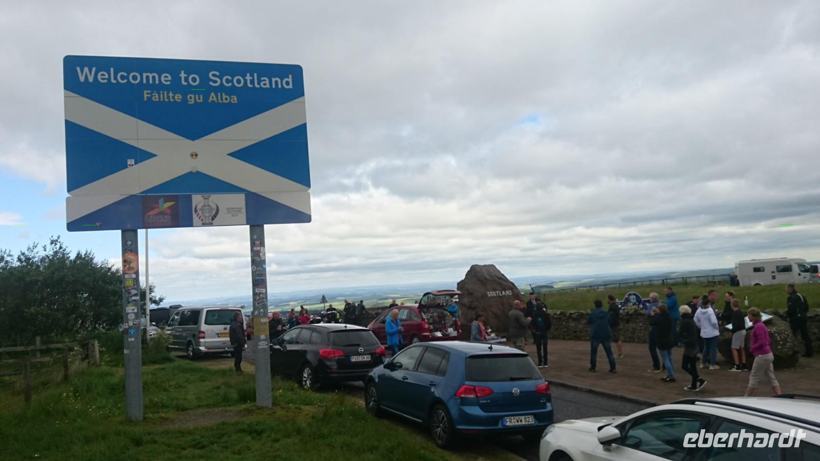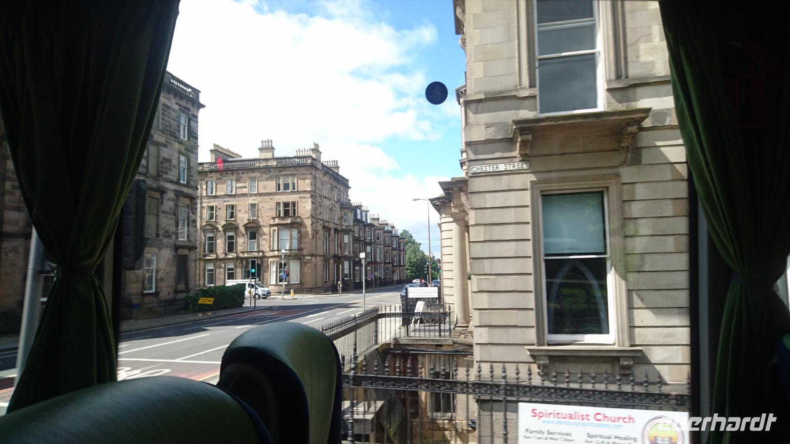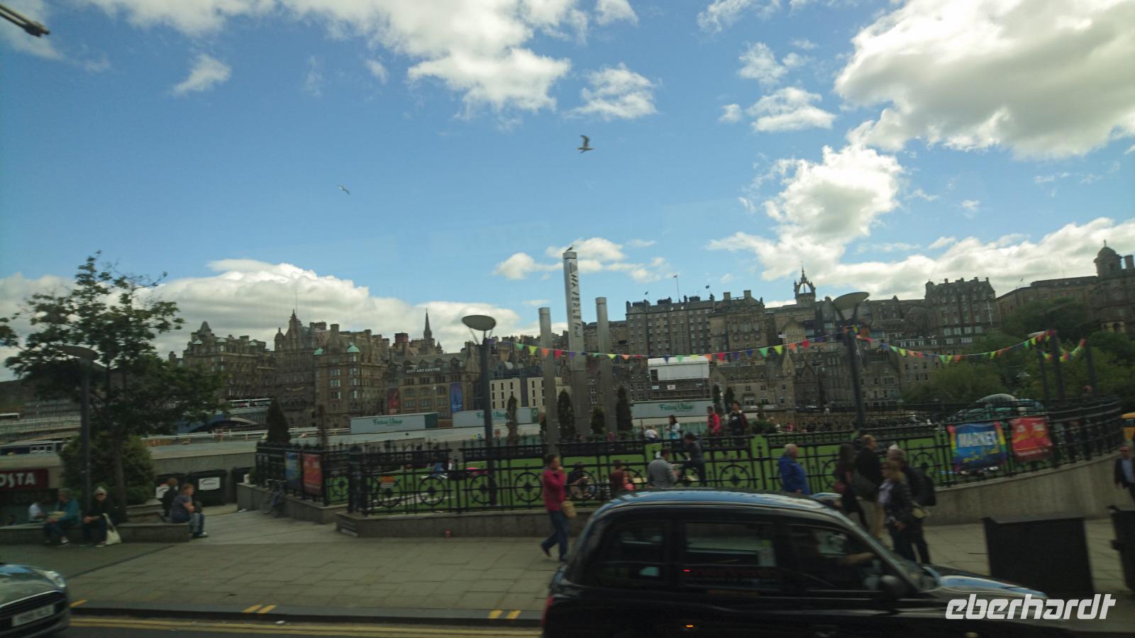 Ein ausgiebiges Frühstück nach dem Wecken stärkte uns an Bord der Fähre kurz vor der Landung in Newcastle upon Tyne. Wir tragen uns alle auf Deck 8, wo nach Stefans Erfahrungen noch so viel los war, wir also in Rhe auf die letzten Anlegemanöver und dann auch an die Kommandos zum Ausschiffen warten konnten. Bald war es soweit und wir betraten das Terminal der DFDS in Newcastle, erlebten eine recht schnelle und nette Ausweiskontrolle, hoben bei Bedarf noch Geld vom ersten britischen Automaten im Terminal ab und trafen bereits vor dem Terminal auf Holger und unseren Bus. Nach dem Verstauen unseres Fährgepäcks saßen wir bald auf unseren Plätzen und ab ging die Fahrt unter dem Klang der britischen Nationalhymne und dem Schwenken der britischen und englischen Fahnen, die Stefan mitgebracht hatte. Gleich bewunderten wir, wie sicher und versiert Holger auf der für uns falschen Seite der Straße fuhr, doch er meinte nur trocken, dass das hier alle so tun, also fällt es auch nicht schwer. Dann ging es durch Newcastle hindurch und in Richtung englisch-schottische Grenze, die wir nach einiger Zeit erreichten. Hier stimmte uns die schottische Fahne, die geheime Hymne der Schotten und vor allem auch ein Dudelsackspieler am Grenzstein zwischen den beiden Königreichen auf unser erstes wichtiges Reisegebiet ein. Kurz darauf erreichten wir unter vielen Erklärungen zur schottisch-englischen Geschichte und Gegenwart, die Grenzstadt Jedburgh, genossen hier unsere Mittagswürstchen und nutzten den Moment, um die Ruine der alten Grenzkathedrale von Jedburgh zu fotografieren, ehe wir weiter gen Hauptstadt rollten und recht pünktlich unser Hotel in Edinburgh erreichten. Hier warteten bereits unsere Fluggäste, die wir herzlich an Bord unseres Busses begrüßten, sowie unser Stadtführer Peter. Gleich von hier starteten wir zu einer Fahrt durch die schottische Hauptstadt, sahen dabei die Neustadt, die zugemauerten Fenster, die vielen Parks, die königlichen Palast und schließlich auch das Castle, bei dem wir ausstiegen und es dann zu Fuß besichtigten, natürlich eingestimmt von Peter und Stefan. Unsere Stadtführung endete hier, doch unsere Freizeit begann und so nutzten wir die Zeit in der Stadt, ehe wir uns wieder unterhalb des Castle trafen, gemeinsam zum Hotel fuhren, dort eincheckten und später zu Abend aßen, ehe wir uns mit etwas Schlaf fit für kommende Ereignisse machten.