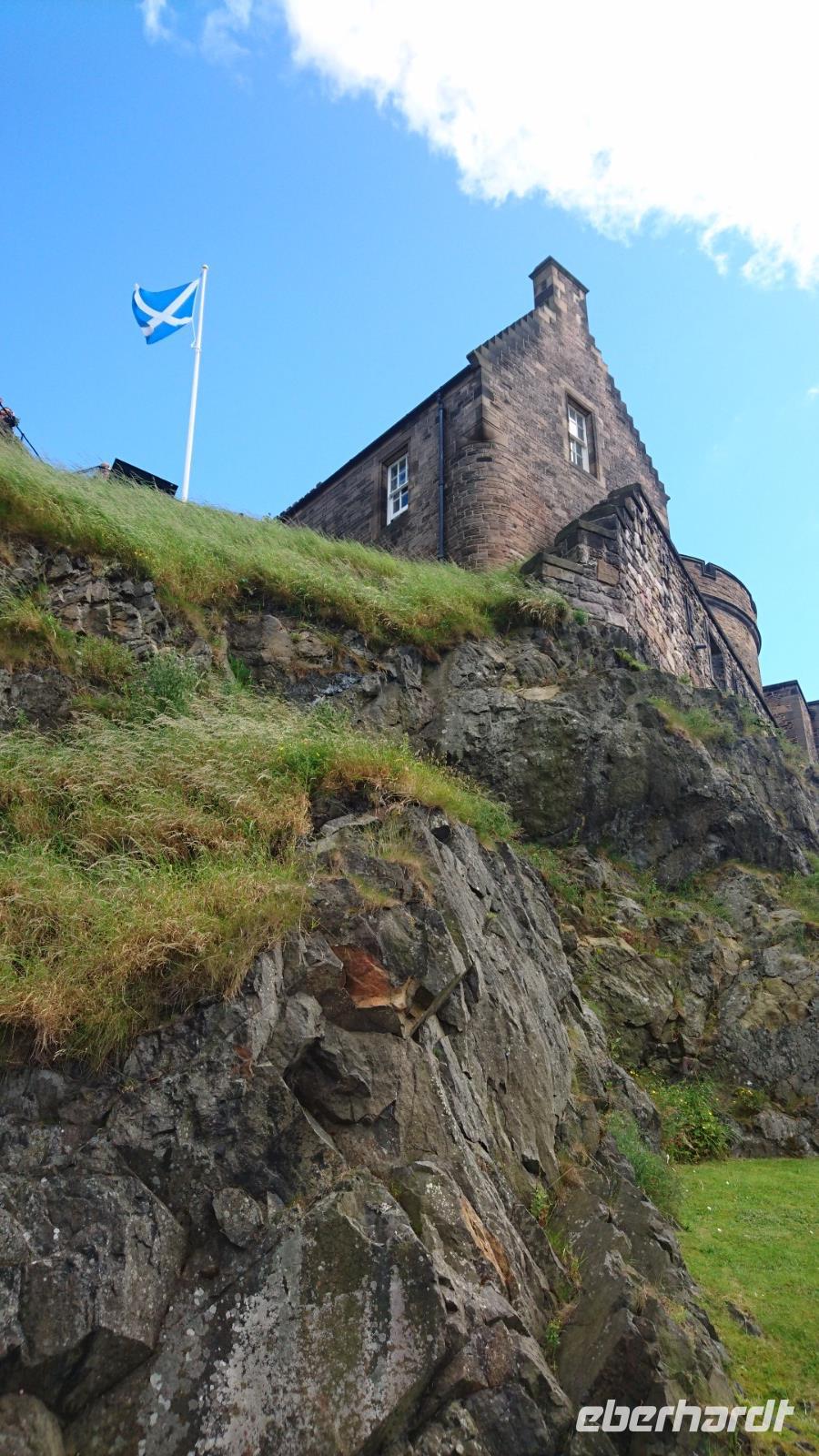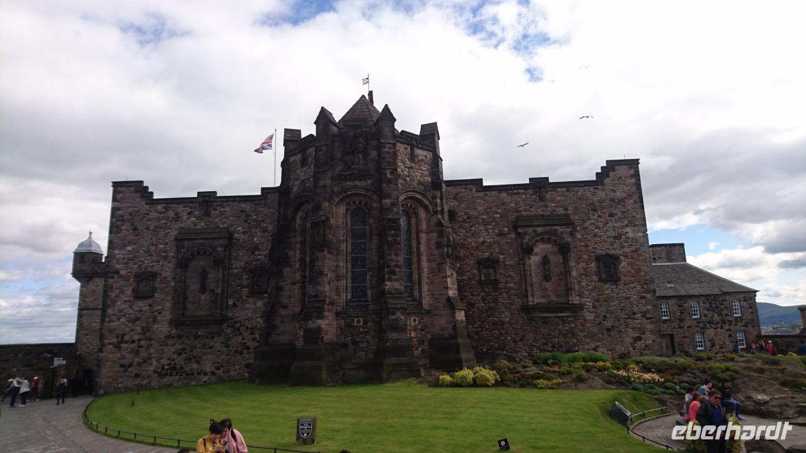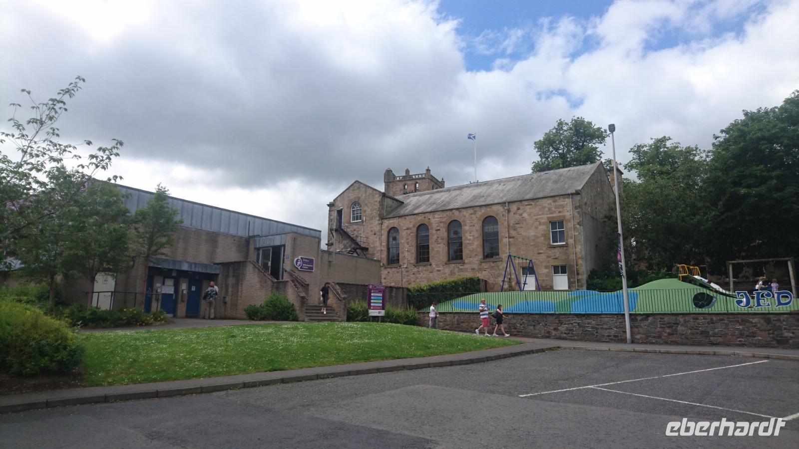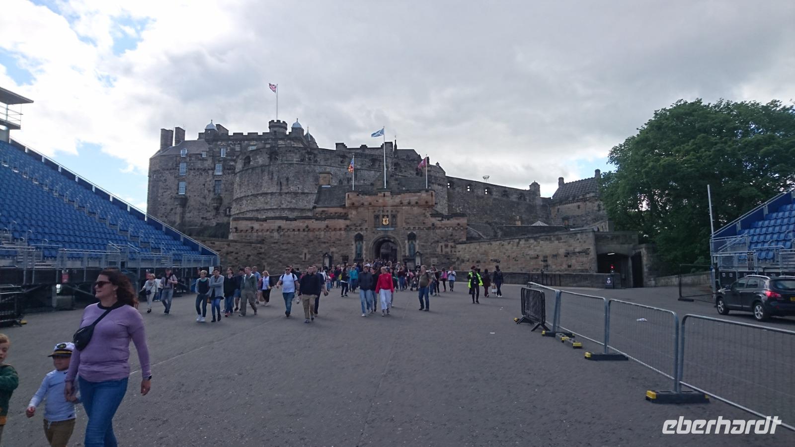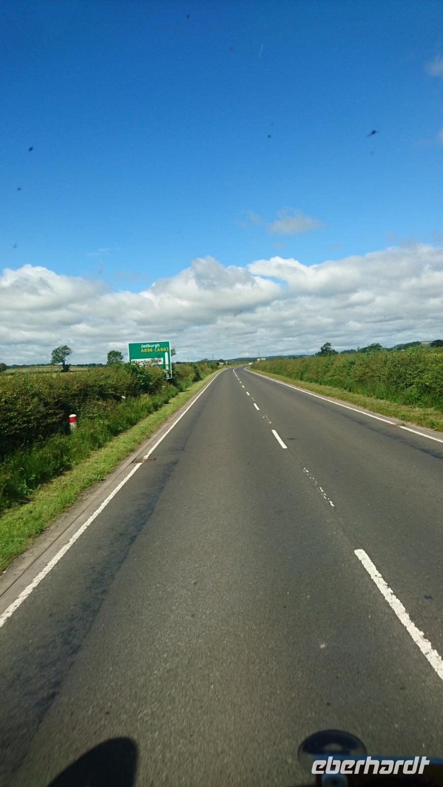 Ein ausgiebiges Frühstück nach dem Wecken stärkte uns an Bord der Fähre kurz vor der Landung in Newcastle upon Tyne. Wir tragen uns alle auf Deck 8, wo nach Stefans Erfahrungen noch so viel los war, wir also in Rhe auf die letzten Anlegemanöver und dann auch an die Kommandos zum Ausschiffen warten konnten. Bald war es soweit und wir betraten das Terminal der DFDS in Newcastle, erlebten eine recht schnelle und nette Ausweiskontrolle, hoben bei Bedarf noch Geld vom ersten britischen Automaten im Terminal ab und trafen bereits vor dem Terminal auf Holger und unseren Bus. Nach dem Verstauen unseres Fährgepäcks saßen wir bald auf unseren Plätzen und ab ging die Fahrt unter dem Klang der britischen Nationalhymne und dem Schwenken der britischen und englischen Fahnen, die Stefan mitgebracht hatte. Gleich bewunderten wir, wie sicher und versiert Holger auf der für uns falschen Seite der Straße fuhr, doch er meinte nur trocken, dass das hier alle so tun, also fällt es auch nicht schwer. Dann ging es durch Newcastle hindurch und in Richtung englisch-schottische Grenze, die wir nach einiger Zeit erreichten. Hier stimmte uns die schottische Fahne, die geheime Hymne der Schotten und vor allem auch ein Dudelsackspieler am Grenzstein zwischen den beiden Königreichen auf unser erstes wichtiges Reisegebiet ein. Kurz darauf erreichten wir unter vielen Erklärungen zur schottisch-englischen Geschichte und Gegenwart, die Grenzstadt Jedburgh, genossen hier unsere Mittagswürstchen und nutzten den Moment, um die Ruine der alten Grenzkathedrale von Jedburgh zu fotografieren, ehe wir weiter gen Hauptstadt rollten und recht pünktlich unser Hotel in Edinburgh erreichten. Hier warteten bereits unsere Fluggäste, die wir herzlich an Bord unseres Busses begrüßten, sowie unser Stadtführer Peter. Gleich von hier starteten wir zu einer Fahrt durch die schottische Hauptstadt, sahen dabei die Neustadt, die zugemauerten Fenster, die vielen Parks, die königlichen Palast und schließlich auch das Castle, bei dem wir ausstiegen und es dann zu Fuß besichtigten, natürlich eingestimmt von Peter und Stefan. Unsere Stadtführung endete hier, doch unsere Freizeit begann und so nutzten wir die Zeit in der Stadt, ehe wir uns wieder unterhalb des Castle trafen, gemeinsam zum Hotel fuhren, dort eincheckten und später zu Abend aßen, ehe wir uns mit etwas Schlaf fit für kommende Ereignisse machten.