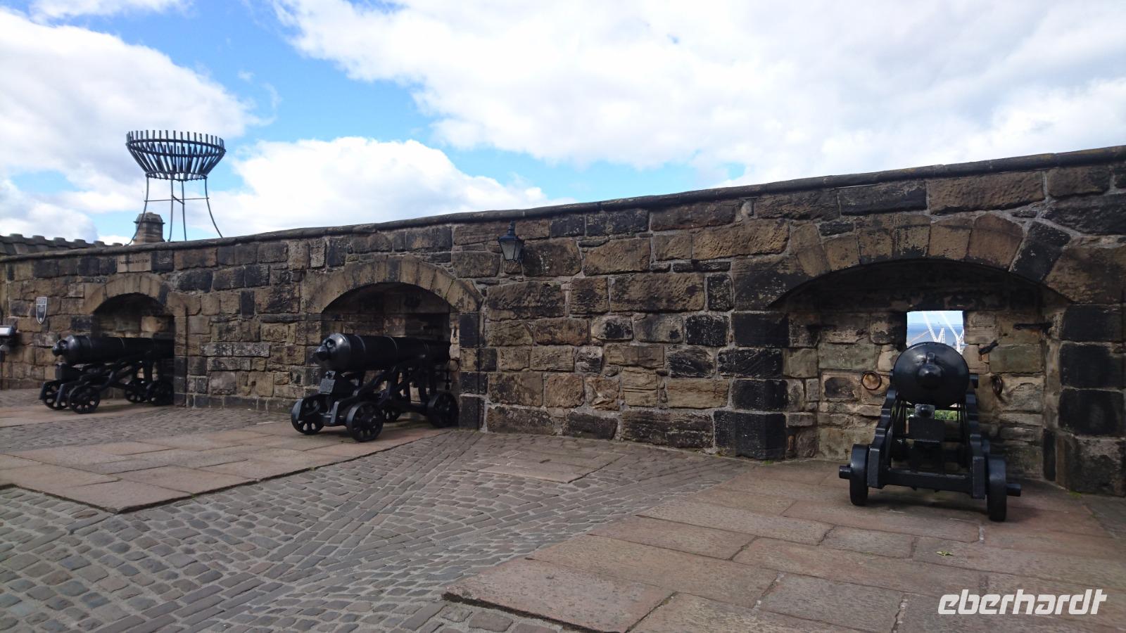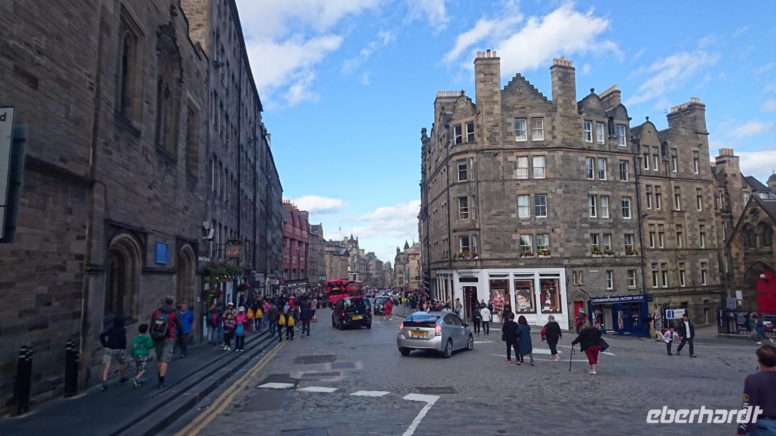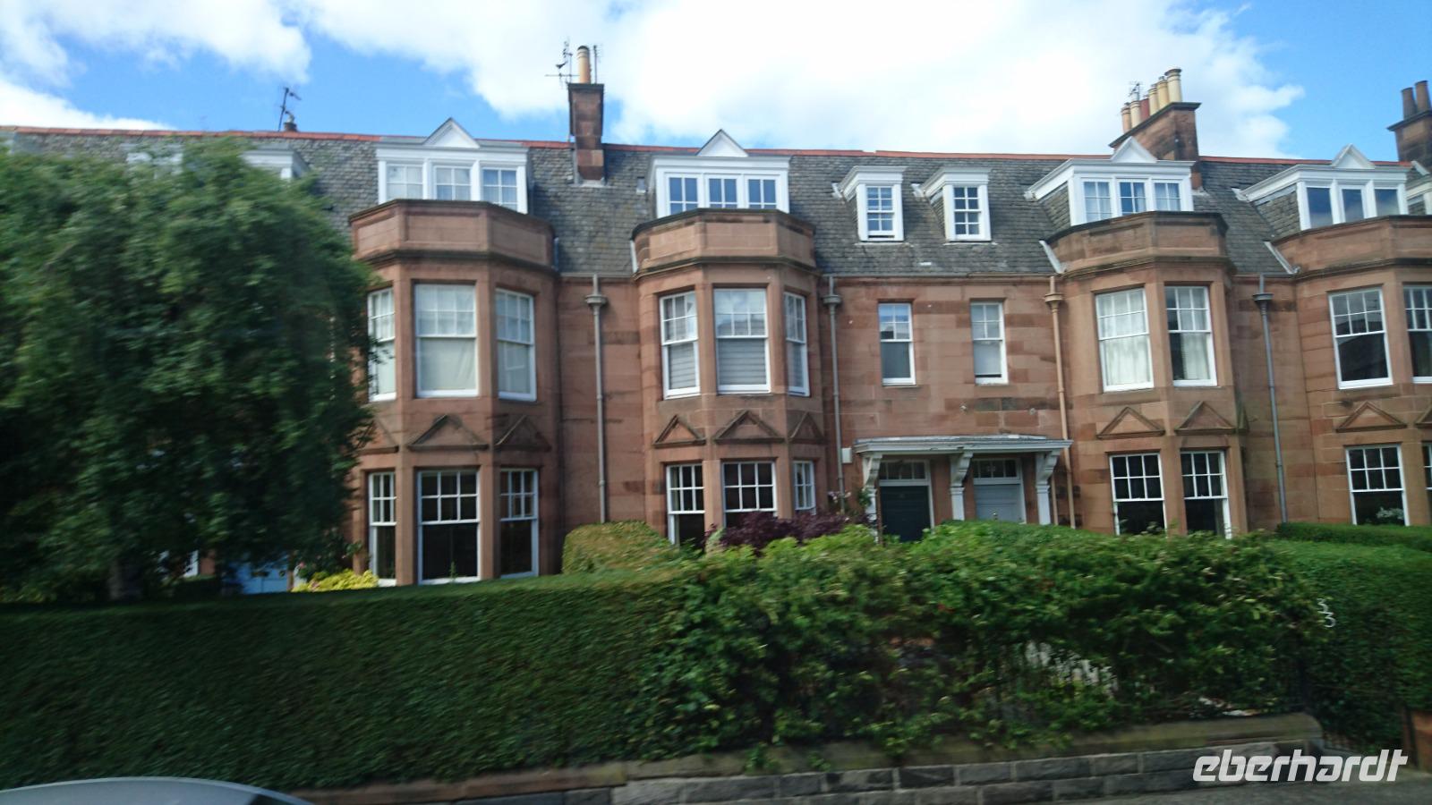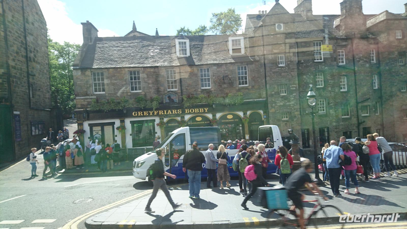 Ein ausgiebiges Frühstück nach dem Wecken stärkte uns an Bord der Fähre kurz vor der Landung in Newcastle upon Tyne. Wir tragen uns alle auf Deck 8, wo nach Stefans Erfahrungen noch so viel los war, wir also in Rhe auf die letzten Anlegemanöver und dann auch an die Kommandos zum Ausschiffen warten konnten. Bald war es soweit und wir betraten das Terminal der DFDS in Newcastle, erlebten eine recht schnelle und nette Ausweiskontrolle, hoben bei Bedarf noch Geld vom ersten britischen Automaten im Terminal ab und trafen bereits vor dem Terminal auf Holger und unseren Bus. Nach dem Verstauen unseres Fährgepäcks saßen wir bald auf unseren Plätzen und ab ging die Fahrt unter dem Klang der britischen Nationalhymne und dem Schwenken der britischen und englischen Fahnen, die Stefan mitgebracht hatte. Gleich bewunderten wir, wie sicher und versiert Holger auf der für uns falschen Seite der Straße fuhr, doch er meinte nur trocken, dass das hier alle so tun, also fällt es auch nicht schwer. Dann ging es durch Newcastle hindurch und in Richtung englisch-schottische Grenze, die wir nach einiger Zeit erreichten. Hier stimmte uns die schottische Fahne, die geheime Hymne der Schotten und vor allem auch ein Dudelsackspieler am Grenzstein zwischen den beiden Königreichen auf unser erstes wichtiges Reisegebiet ein. Kurz darauf erreichten wir unter vielen Erklärungen zur schottisch-englischen Geschichte und Gegenwart, die Grenzstadt Jedburgh, genossen hier unsere Mittagswürstchen und nutzten den Moment, um die Ruine der alten Grenzkathedrale von Jedburgh zu fotografieren, ehe wir weiter gen Hauptstadt rollten und recht pünktlich unser Hotel in Edinburgh erreichten. Hier warteten bereits unsere Fluggäste, die wir herzlich an Bord unseres Busses begrüßten, sowie unser Stadtführer Peter. Gleich von hier starteten wir zu einer Fahrt durch die schottische Hauptstadt, sahen dabei die Neustadt, die zugemauerten Fenster, die vielen Parks, die königlichen Palast und schließlich auch das Castle, bei dem wir ausstiegen und es dann zu Fuß besichtigten, natürlich eingestimmt von Peter und Stefan. Unsere Stadtführung endete hier, doch unsere Freizeit begann und so nutzten wir die Zeit in der Stadt, ehe wir uns wieder unterhalb des Castle trafen, gemeinsam zum Hotel fuhren, dort eincheckten und später zu Abend aßen, ehe wir uns mit etwas Schlaf fit für kommende Ereignisse machten.