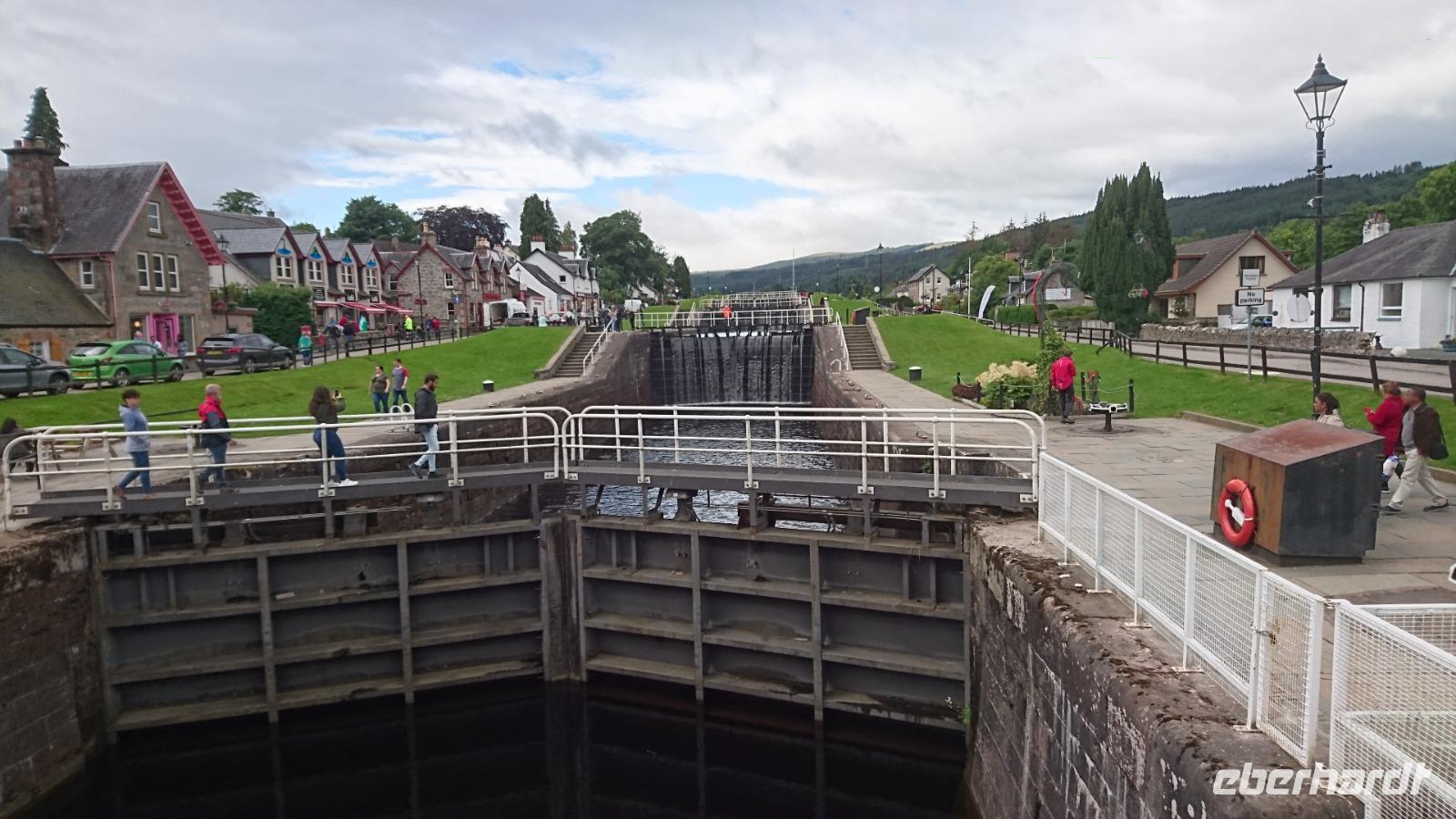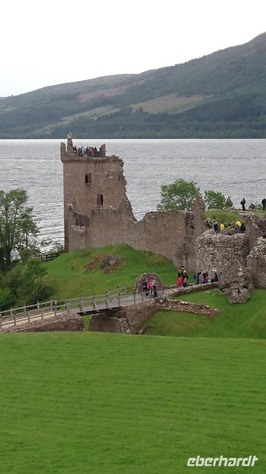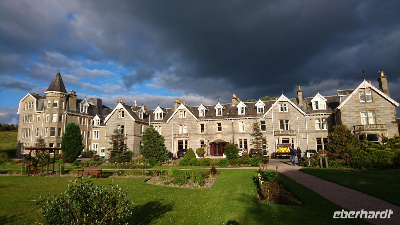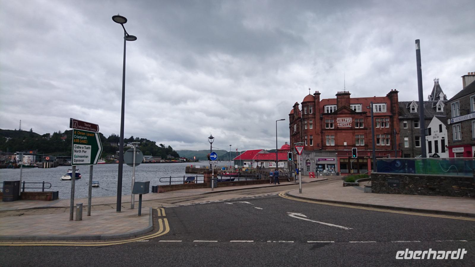 Der Nationalpark um uns herum bestach mit der absoluten Stille in der Nacht. Manch schönes Foto entstand noch nach dem Aufstehen und dann gab es Frühstück und erneutes verladen unserer Koffer. Gern wären wir hier noch geblieben, denn dieses Hotel in Nethybridge begeisterte durch seinen besonderen schottischen Highlandcharme. Aber eine Rundreise heißt ja so, weil man weiterreist. Also führte uns unser Weg heute noch ein Stück nach Norden, nach Inverness, und von da immer am Caledonischen Kanal entlang, den einst die Römer bei einer kurzen Stippvisite in den Highlands bereits planten, den dann jedoch Telford und andere Ingenieure erst in späteren Jahren unter der genialen Nutzung der aus der letzten Eiszeit stammenden langgezogenen Seen zwischen Inverness und Fort William erbauten. Am Clansman-Hotel am Wege sahen wir, wie man Nessi, das angebliche Ungeheuer dieser Gegend, vermarktete, hofften natürlich auf einen Blick zu eben diesem Urvieh, hatten aber nicht alle Glück, erreichten dafür jedoch am Vormittag Urquhart Castle am Loch Ness und sahen hier in einem Video im Besucherzentrum die genial aufbereitete Geschichte des über Jahrhunderte gehaltenen und schließlich doch verlorenen Schlosses am See, wo einst der Heilige Columbian an Land ging und die Christianisierung der Pikten begann. Später ging es weiter am Loch Ness entlang nach Fort Augustus, wo wir uns eine lange Schleusentreppe anschauten, die es den Schiffen auf dem Caledonischen Kanal ermöglichte, die Höhen der Kanal- und Seeabschnitte zu überwinden. Später wollten wir gern den Ben Nevis, den höchsten Berg Schottlands, sehen, doch er hüllte sich beim Stopp am Command Memorial in Wolken und wir fuhren weiter über Fort William ins Glen Coe, dem Heimatort des Riesen Finn McCool sowie dem Ort eines bösen Massakers der Campbells an den McDonalds auf Befehl der Engländer. Die Bergwelt rund um die drei Schwestern im Glen Coe ließ uns jedoch nicht an zu schaurige Dinge denken und da wir danach unsere Fahrt durch die Berge gen Oban fortsetzten, hatten wir noch viele schöne Momente, ehe wir die Hafen- und Whiskystadt erreichten und unser Hotel am Markt bezogen. Manch einer ging am Abend noch an den Pier oder in einen der vielen Pubs im Ort und nach dem Abendessen genossen wir dann wieder die Ruhe für kommende Erlebnisse.