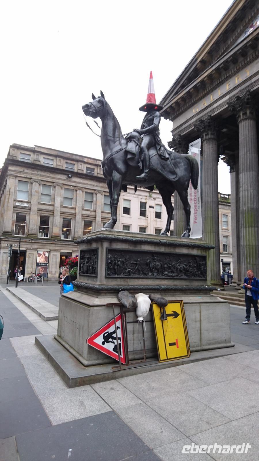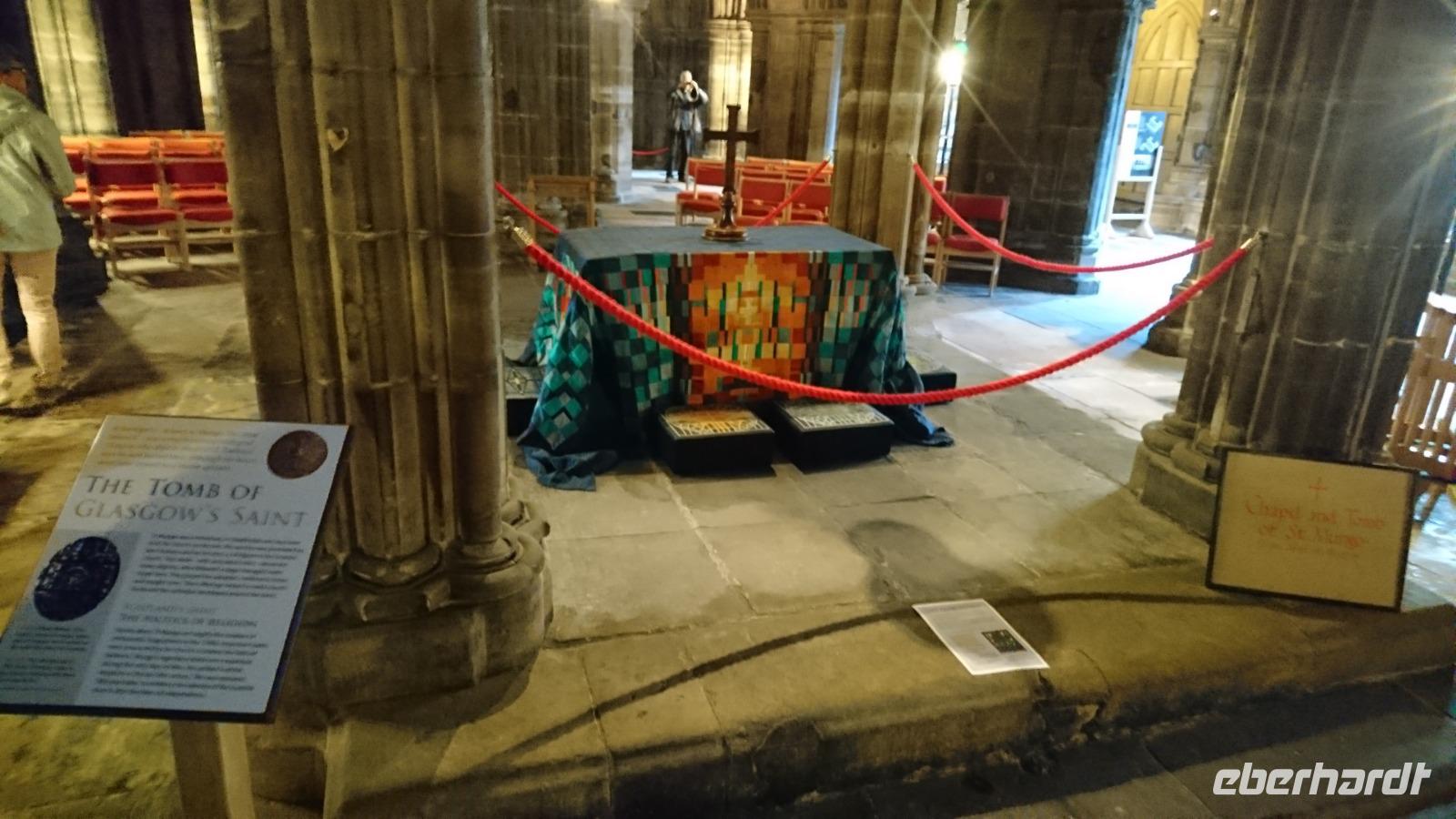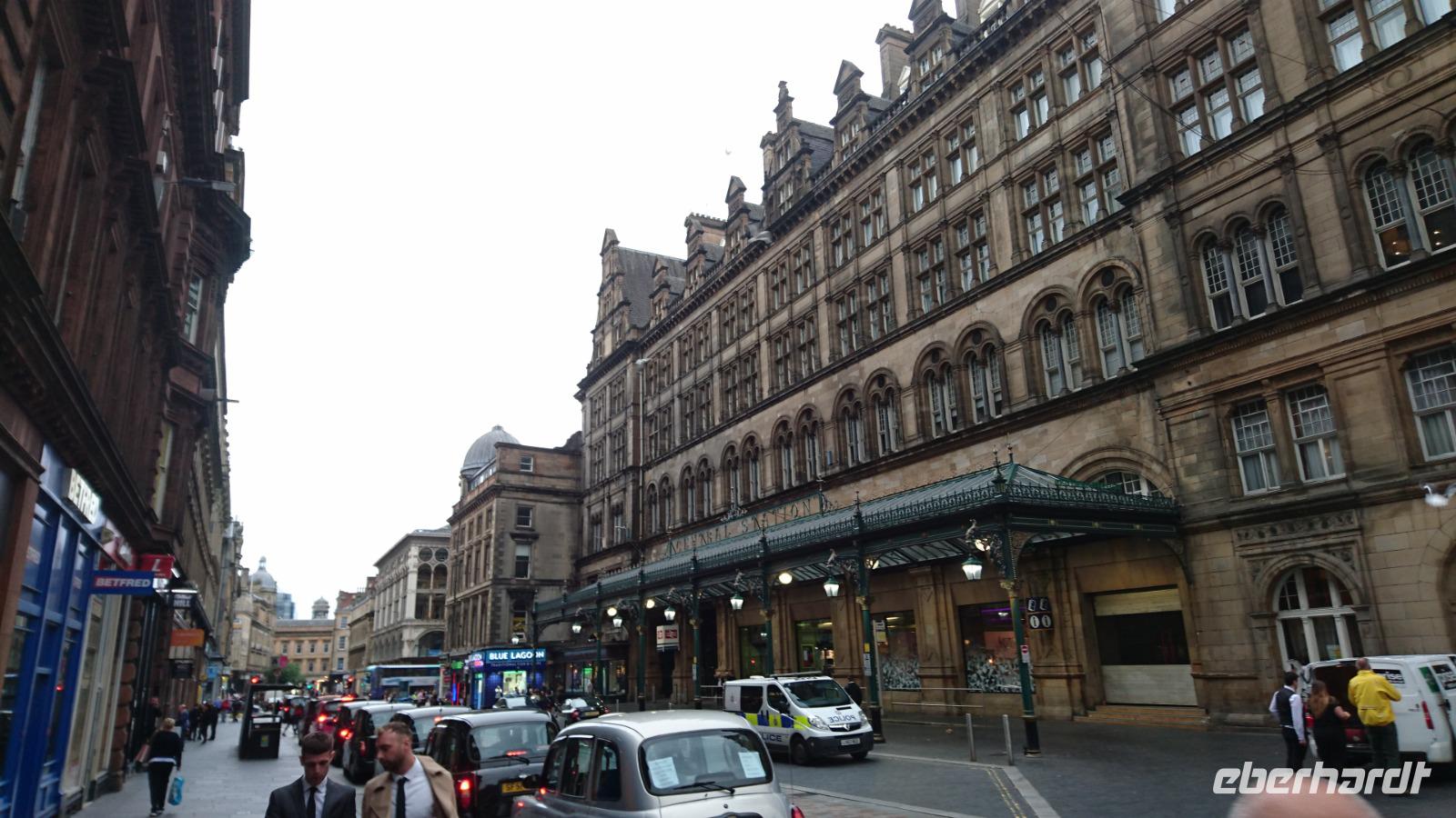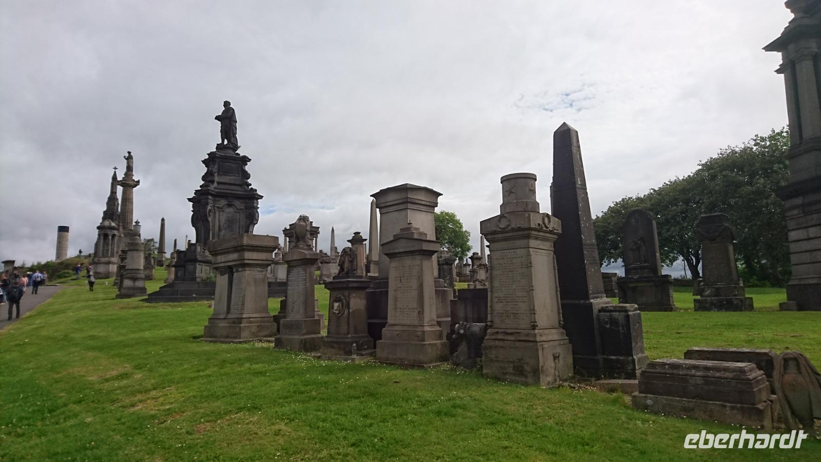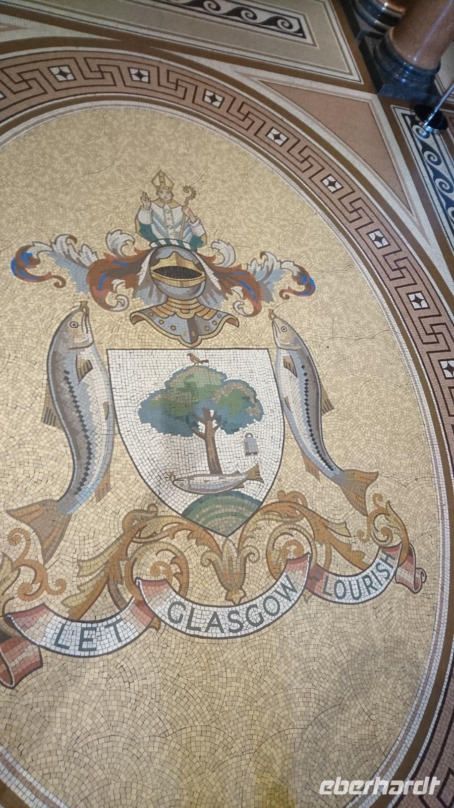 Erst einmal luden wir nach dem Frühstück unsere Koffer in die unteren Busklappen, dann fuhren wir das kurze Stück vom Hotel zum St. George Square, stiegen aus und Stefan besprach mit Holger, wo wir später unseren Bus wiederfinden würden. Dann begann unser Stadtspaziergang. Wir besuchten das ehrwürdige und vom einstigen Reichtum der Stadt Glasgow zeugende Rathaus mit seinen herrlichen Mosaiken und Bleiglasfenstern, den marmornen Treppenhäusern und vielen interessanten Gestaltungselementen. Dann zeigte uns Stefan die in Glasgow einst bei Streitigkeiten genutzten Urmaße an der Rathauswand und wir spazierten aus der Altstadt hinein ins Universitätsviertel, bemerkten noch einmal, wie sehr Glasgow auf verschiedene Hügel gebaut wurde und erreichten nach vielen Blicken auf modernste Gebäude die altehrwürdige Kathedrale von St Mungo, dem Schutzpatron der Stadt, die eist katholisch war, später in den Zeiten nach Heinrich dem VIII. und dem Kampf um die richtige Religion in Schottland von den Glasgower Bürgern als Bauwerk gerettet und in die damals neue protestantische Religion umgewidmet wurde. Nach der Besichtigung der Gräber von St. Mungo, Black Adder und anderen, den vielen Eindrücken der hochinteressant erbauten und eingerichteten Kirche, blieb noch etwas Zeit, die weithin sichtbare Nekropole Glasgows zu besichtigen, ehe wir wieder im Bus saßen und weiter gen Südwesten fuhren. Denn heute sollte sie zu Ende gehen, unsere Zeit in Schottland. Vorbei an Ayr ging es zur Mittagspause nach Girvan und schließlich in den Fährhafen der Stena Line nach Cainryan. Nach dem Check-in ging es leider einem unserer Gäste aus privaten Gründen nicht so gut, aber besonnene und schnelle Hilfe durch Holger, Stefan, die herbeigerufene Polizei und einen Notarztwagen konnten Schlimmeres verhindern und alle gemeinsam setzten wir mit höchst ärztlicher Genehmigung die Reise mit der Fährüberfahrt nach Belfast fort. Die nordirische Hauptstadt erreichten wir am späten Nachmittag, fuhren dann von Bord und durch die Hafenanlangen hinüber in die Innenstadt, wo wir unser Hotel bezogen und bald zum Abendessen gehen konnten. Später nutzten wir diesen ersten von zwei Abenden in Belfast, um die Pubs und Gebäude der Innenstadt zu sehen, einige von uns besuchten auch den wohl schönsten Pub der Stadt, The Crown, ehe wir wieder Kraft für den kommenden Tag tankten.