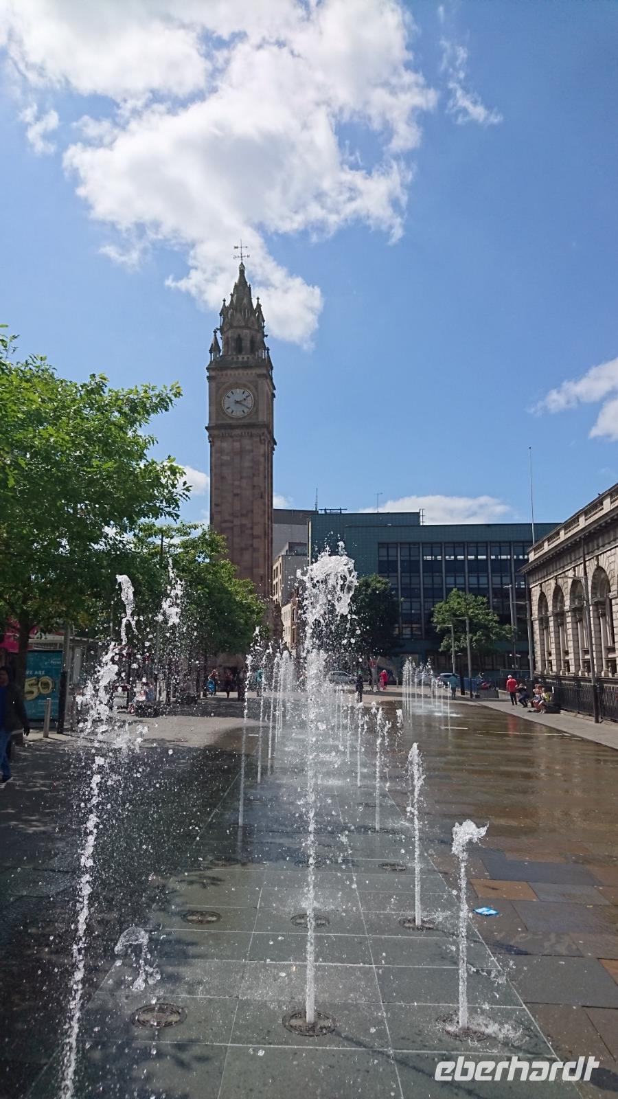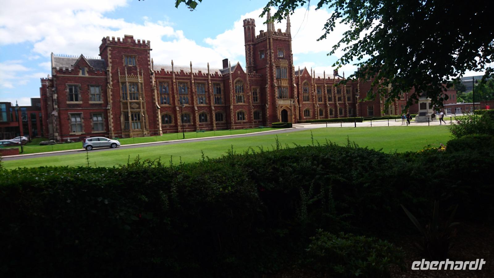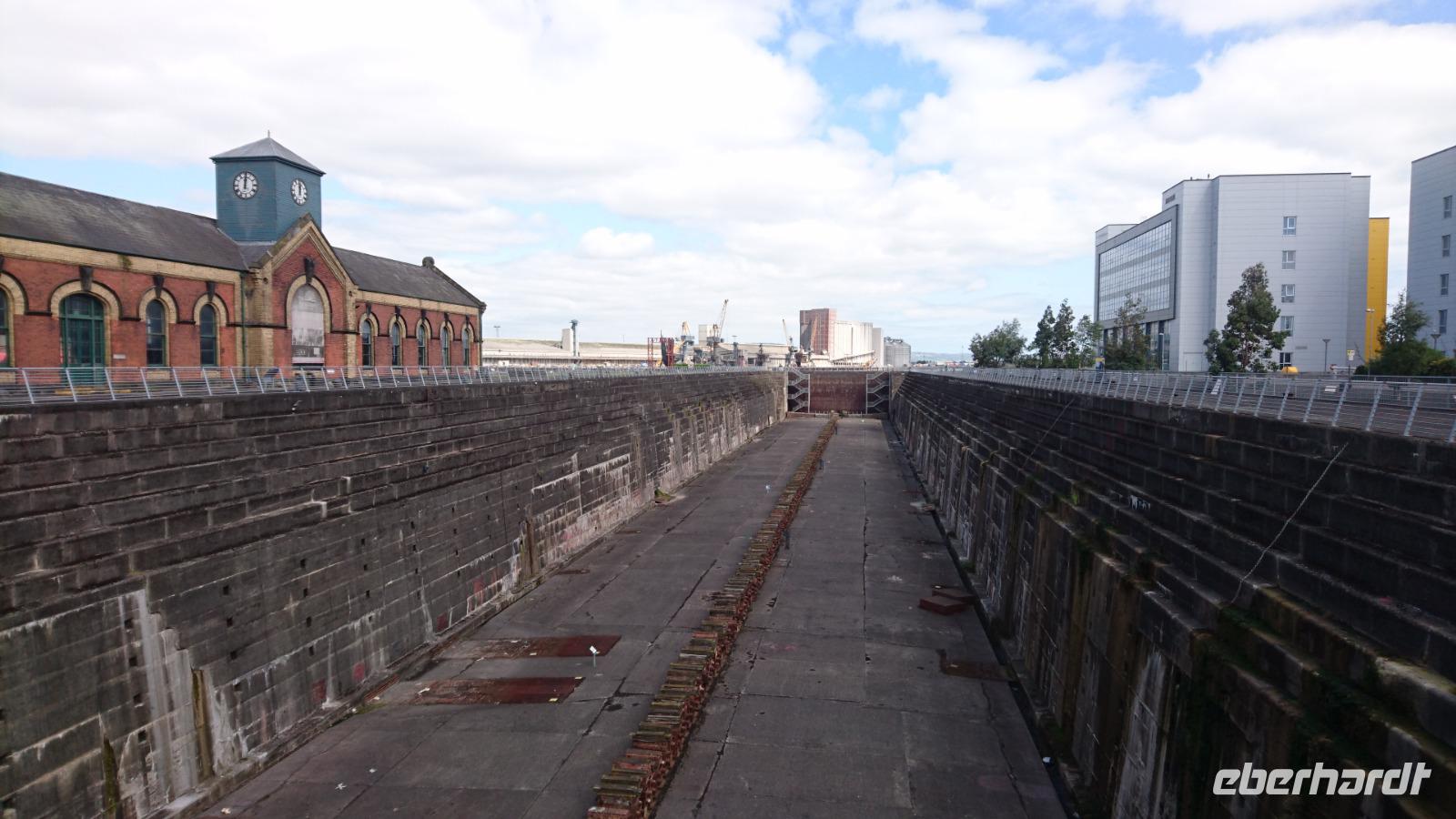 Heute konnten wir endlich einmal die Koffer im Hotelzimmer zurücklassen, denn dieses eine Mal wollten wir zwei Nächte an einem Ort auf unserer Rundreise bleiben. Nach dem Frühstück ging es ab und per Bus erreichten wir bald das Titanic Quarter, jenen Teil der Hafenanlagen, wo weithin die gelben Kräne Samson und Goliath der Werft H&W zeigen dass dort einmal die Titanic gebaut wurde, auch wenn die Kräne viel jünger sind als das wenige Tage nach Indienststellung gesunkene Luxusschiff aus dem Jahre 1912. Wir erreichten die Exhibition Titanic Belfast und besuchten diese, erfuhren darin viel über die Entwicklung der Stadt und des Schiffbaus in Belfast sowie wie es eigentlich zum Bau der Luxusschiffe Olympic, Britannic und Titanic kam, von denen heute keines mehr fahrtüchtig existiert. Natürlich kannten wir wenigstens einen Film, den man über die damalige Katastrophe drehte, sahen jedoch nach dem Ausstellungsbesuch vieles noch einmal mehr mit anderen Augen. Doch noch hatten wir keine Ahnung von der wirklichen Dimension des Schiffes. Dazu fuhren wir nach dem Ausstellungsbesuch ein kleines Stück weiter und besuchten nach einigen Einlassschwierigkeiten das Thompson Dock, welches man heute Titanic Dock nennt, denn das bedeutendste Schiff, welches man hier ausrüstete, war nun einmal die Titanic. Hier erkannten wir, wie groß dieses Schiff wirklich war, und hatten so einen sehr guten Eindruck von den Dimensionen, von der Entwicklung der Stadt und dem Niedergang des Schiffbaus in Belfast in unseren Tagen. Dann fuhren wir gemeinsam zum Rathaus der Stadt, das wir auf eigene Faust am Abend besuchten und ein ähnlich imposantes und schönes Gebäude innen wie außen vorfanden, wie beim Rathaus in Glasgow. Wir nahmen unseren örtlichen Guide Petra auf und sie zeigte uns gemeinsam mit Stefan Belfast aus noch einmal mehr anderen Perspektive. Die Teilung der Stadt in den schlimmen Jahren bis in die Neunziger des gerade zu Ende gegangenen Jahrhunderts war dabei noch das Unwesentlichste. Dass die Tore mitten in der Stadt immer noch jede Nacht geschlossen werden, um Übergriffe zwischen Royalisten und Republikanern, Protestanten und Katholiken zu minimieren, war und ist für uns immer och nicht nachvollziehbar. Trotzdem sahen wir aber auch die Universität, das Parlamentsgebäude, welches jedoch seit Monaten verwaist ist, da sich die Parteien verstritten und nun einfach gar nicht regieren, anstatt sich weiter zu streiten, die Innenstadt und die verschiedenen Baustile in der Stadt. Unsere Reise durch Belfast endete am Hotel und wir nutzten die verbleibende Freizeit für einen Bummel, ehe wir wieder gemeinsam zu Abend aßen und den Tag angenehm ausklingen ließen.