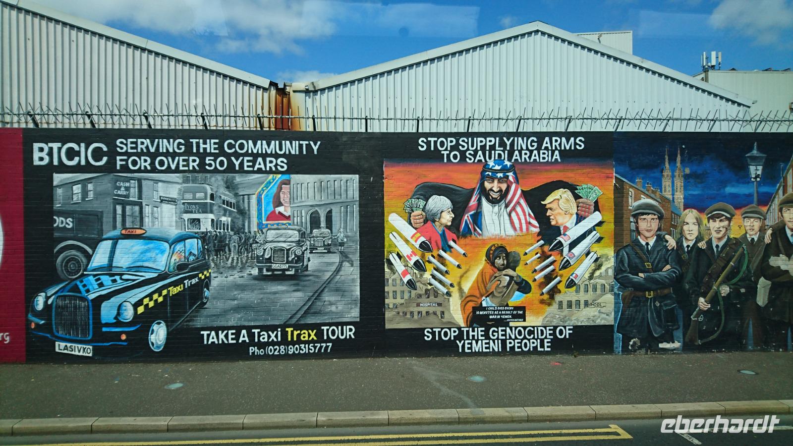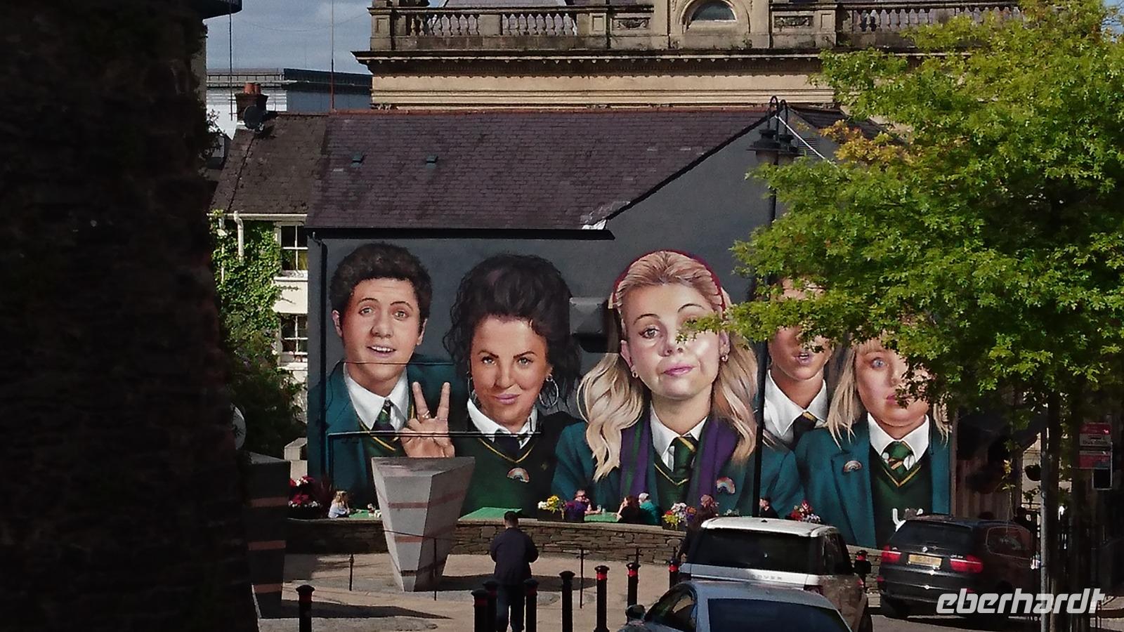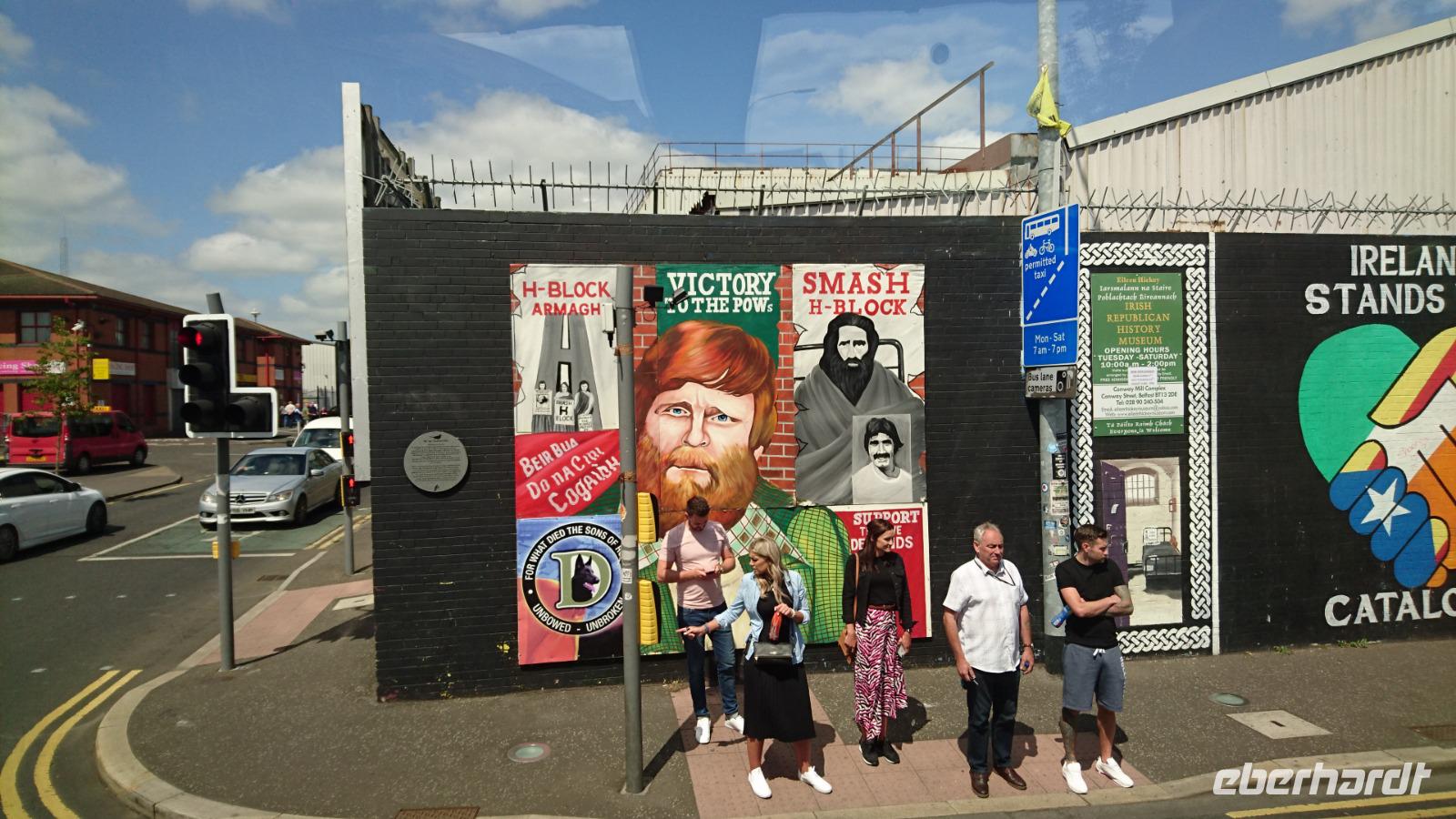 Heute hieß es am Morgen wieder, Koffer laden. Dann fuhren wir ab und freuten uns auf Natur pur. Das Wetter spielte wieder hervorragend mit. Bald schon stoppten wir im kleinen Ort Carrickfergus, dort am imposanten Normannen-Castle, welches samt des Titels eines Baron von Carrickfergus Queen Elisabeth II ihrem Engel William zur Hochzeit schenkte, was wiederum die Nordiren sehr erfreute, denn sie vermissten lange Zeit die Fürsorge der Krone etwas, obwohl doch ein großer Prozentsatz der Nordiren treu zur Krone in London steht. Mit schönen Fotos im Gepäck ging es weiter, immer die Causeway Coastal Route entlang der Antrim Küste nach Norden. In Carnlough war ein kleiner Zwischenstopp. Hier konnten wir neben etwas Entspannung auch den Drehort einer wichtigen Schlüsselszene der Serie Game of Thrones besichtigen, ehe wir weiter die Küste hinauf zur Carrick-a-Rede Rope Bridge mit Blick nach Rathlin Island und Schottland fuhren. Unterwegs überraschte und Stefan mit einem schottischen Keksgruß und dem Video der Wings Mull of Kintyre, denn nichts anderes von Schottland sahen wir eben hinter der Bumerang-Insel Rathlin Island im Nebel liegen. Nach der Weiterfahrt erreichten wir bald den Damm der Riesen und sein Besucherzentrum. Giants Causeway hat eine erdgeschichtliche und eine mystische Geschichte, letztere hing wieder mit Finn McCool aus dem Glen Coe in Schottland zu tun, erstere natürlich mit Vulkanen und dem Triften der Landmassen in grauer Vorzeit. Wir bekamen jeder einen Audioguide und genügend Zeit für eine kleine Spazierwanderung vom Besucherzentrum zum Damm und wer wollte auch zurück über die Steilküste. Für die weniger guten Läufer gab es einen preiswerten Shuttlebus hinter dem Besucherzentrum. Nach einem Imbiss, vielleicht gar mit Irish Stew, dem Nationaleintopf der Iren, trafen wir uns am Nachmittag wieder am Bus und weiter ging die Fahrt mit tollen Erlebnissen, gleich zu einem weiteren Fotostopp, dem Dunluce Castle oder eher der Ruine dessen, einer Burg, die aus Irland herüber gekommene Wikinger der Familie der McDonalds einst errichteten. Ein tolles Motiv auf der Steilküste. Die Fahrt, auf der wir nun entschieden, welche fakultativen Besuche wir ein paar Tage später in Dublin wahrnehmen wollten, ging nun immer weiter gen Westen, unterhalb der Küste entlang und vorbei an Golfplätzen, unberührter Natur, kleinen Ortschaften in eine Stadt, über deren wirklichen und offiziellen Namen man sich in verschiedensten Kreisen nicht wirklich sicher ist. Daher benennt man diese Stadt in Nordirland unweit der Grenze zur Republik Irland gern als die Stadt mit dem Schrägstrich, Derry/Londonderry. Dass dies nicht nur ein Spaß ist, mussten wir wenig später in dieser Stadt erkennen. Stefan führte uns über die alte und vollständig erhaltene Stadtmauer und erläuterte uns die noch weitaus rigorosere Teilung der Stadt in Londonderry und den Stadtteil Bogside, also Derry. In Erstem leben die Royalisten und Protestanten, in Letztem die Republikaner und Katholiken und sie arbeiten nicht gemeinsam, leben nicht gemeinsam, haben sogar eine geteilte Stadtregierung, die sich im Monat nur einige Male trifft, um zu versuchen, übergreifende Fragen zu klären. Nachdem uns Stefan auch noch den Checkpoint Charlie in Derry/Londonderry zeigte, wussten wir Bescheid. Hier die Teilung zu beenden, würde noch viel Kraft fordern. Wie jedoch all dies nach einer eventuell zu errichtenden EU-Außengrenze zwischen dem zum Vereinigten Königreich gehörenden Nordirland und der eigenständigen EU-Republik Irland weitergehen würde, wenn das Vereinigte Königreich wirklich den Brexit zulässt, weiß wohl derzeit niemand auf der ganzen Welt. Schlimme Idee kommen bei vielen Iren herauf, Erinnerungen an IRA und Kämpfe. Hoffen wir, dass man zwischen London und Brüssel noch einen Weg findet, Schlimmstes abzuwenden. Wir jedenfalls verließen nun Nordirland für einige Stunden und machten Hotel-Station in der ersten größeren Stadt im Distrikt Donegal, in Letterkenny. Nach dem Abendessen besuchten einige noch das geschäftige Pub-Viertel und dann ruhten wir für den nächsten Tag aus.