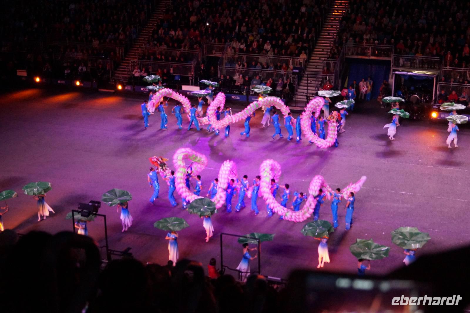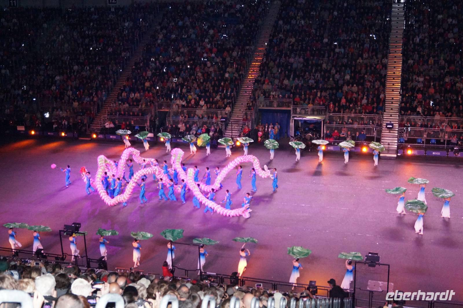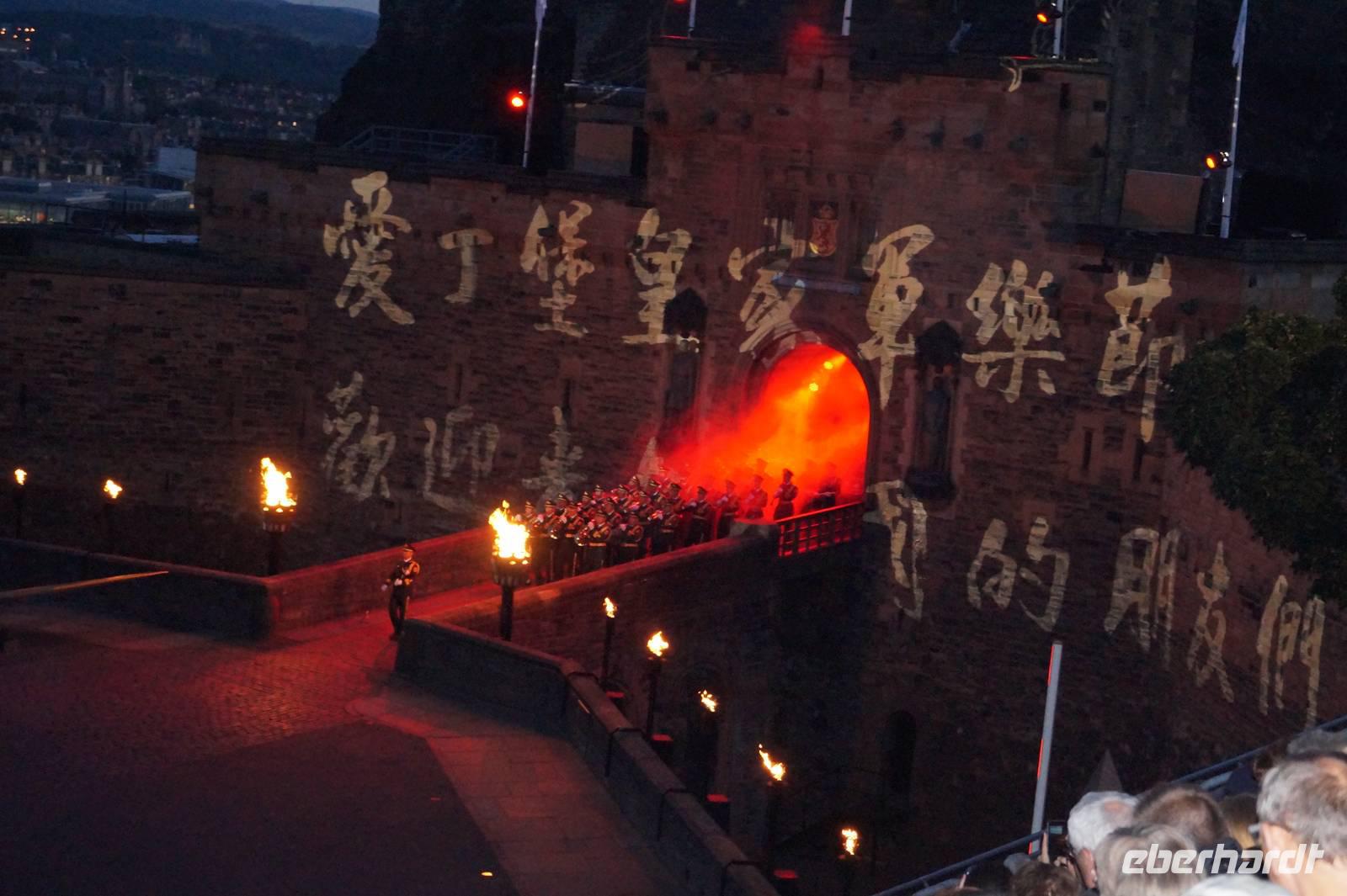 Abends stiegen wir dann gemeinsam erneut auf zum Edinburgh Castle; diesmal aber, um auf der Esplanade zu bleiben, wo die Tribüne für das Royal Military Tattoo aufgebaut ist. Neben verschiedenen Highland-Regimentern traten die Gurkha Rifles auf, eine britische Militäreinheit, die sich aus Nepalesen rekrutiert, obwohl Nepal niemals zum Empire gehörte, die Ehrenwache der US-Airforce, eine chinesische Militärkapelle sowie eine chinesische und ein indische Tanzgruppe etc.