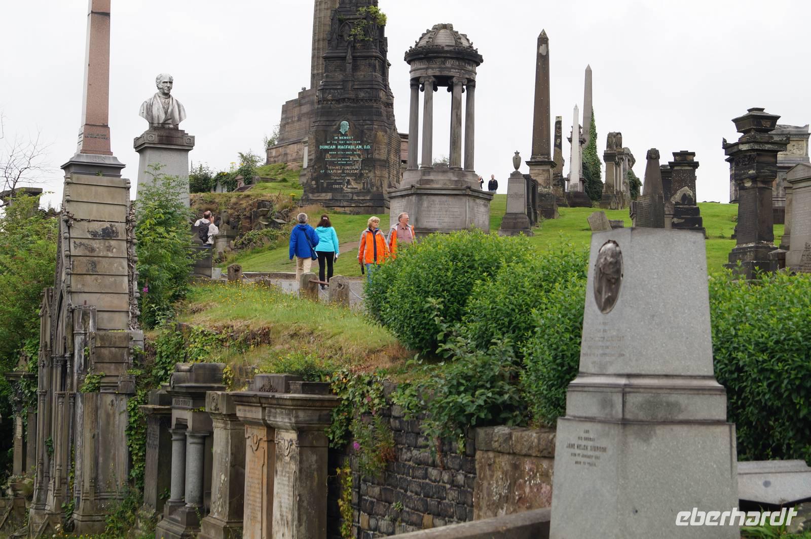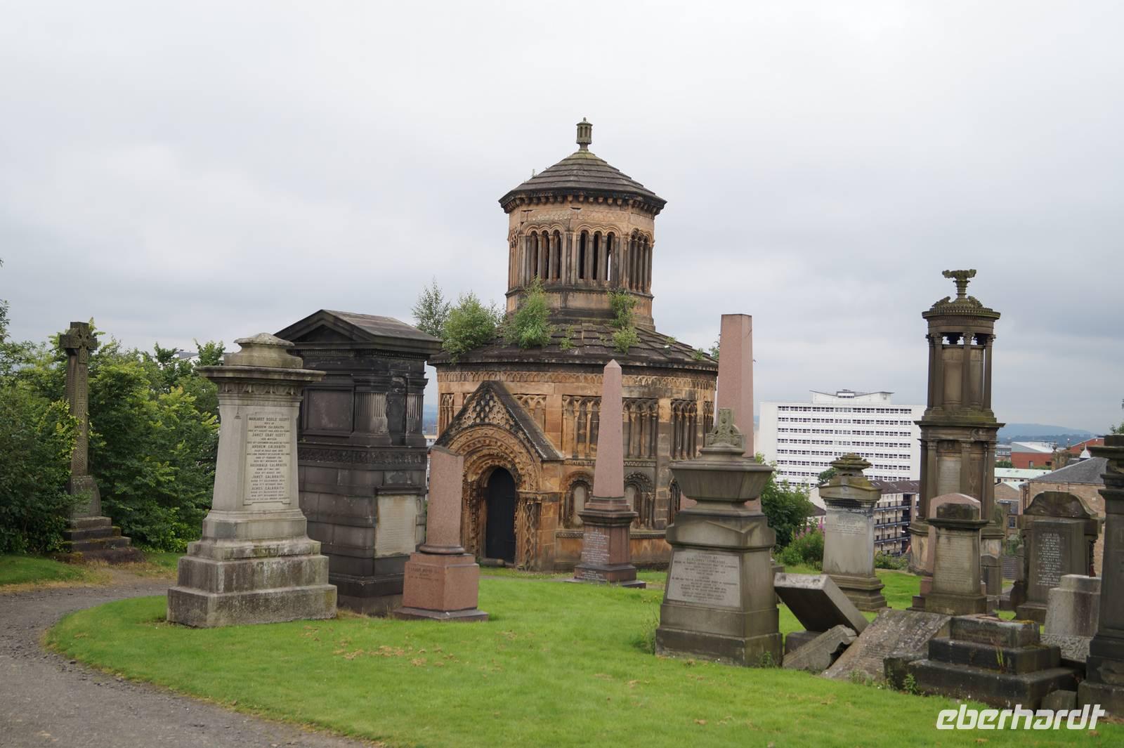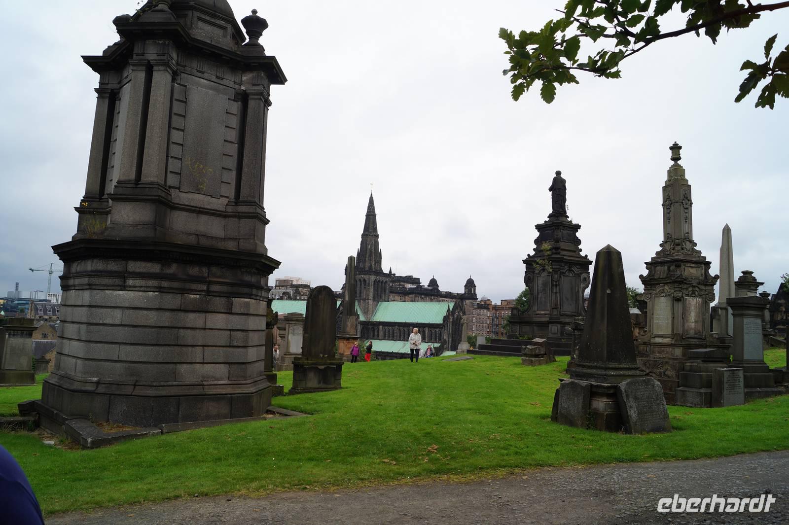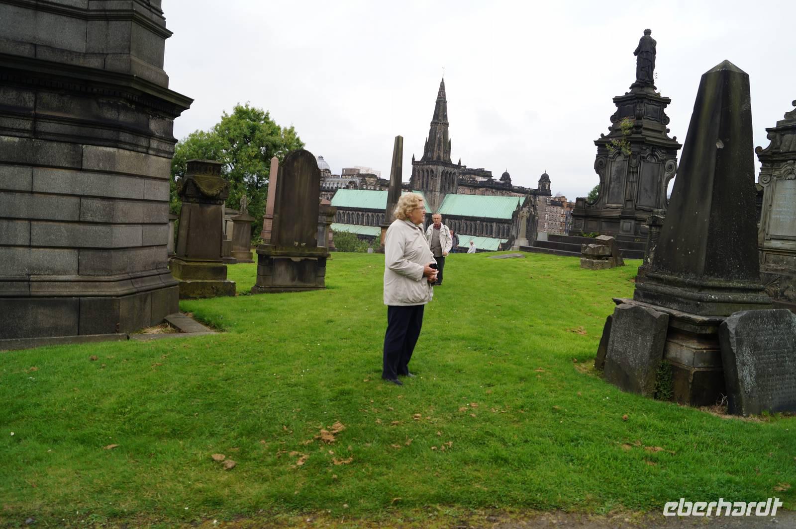 Von Edinburgh bis nach Glasgow ist es nicht sehr weit, beide Städte liegen am Belt, also der dichtbesiedelten Engstelle Schottlands zwischen dem Firth of Forth im Osten und dem Firth of Clyde im Westen. Und so war unser erstes Ziel heute die St. Kentigern's oder auch St. Mungo's Cathedral, die wir - Glück gehabt! - auch betreten konnten. Im Anschluss daran besuchten wir die Nekropolis, jenen Friedhof, den sich die Glasgower Gesellschaft auf einem Hügel gegenüber der Kathedrale unter dem wachsamen Blick ihres in Stein gearbeiteten Reformators John Knox 1834 eingerichtet hatte, um sich von den Arbeitern in den Hafenanlagen und Fabriken zu separieren.