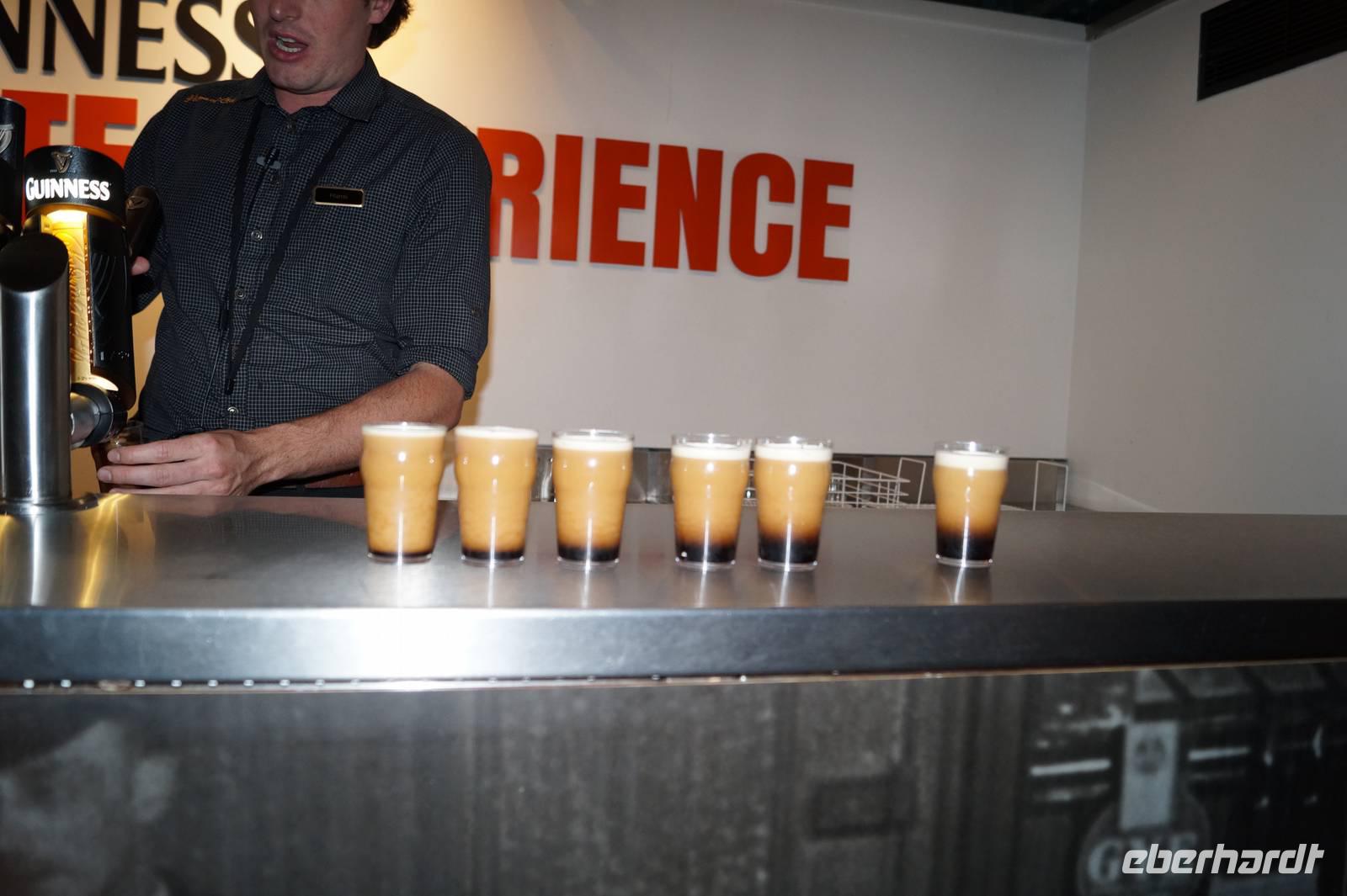 Das besondere an Guinness, zumindest am Draught Guinness, als dem Fassbier, ist, dass es keine Kohlsäure hat, die Bläschen also nicht aufsteigen, sondern dass es mit Stickstoff versetzt ist und die Blasen daher absteigen. Daher muss man erst einmal ca. eine Minute warten, bevor man ein frisch gezapftes Guinnes bei der Idealtemperatur von 6° trinkt.