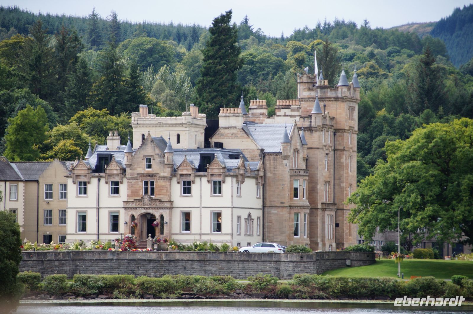 Den Firth of Forth überquerten wir über die Firth of Forth-Roadbridge von 1964, in Privileg, dass nur Busse haben, PKWs müssen die neuere Brücke Queensferry Crossing benutzen. Am Aussichtspunkt bewunderten wir die Eisenbahnbrücke aus dem 19. Jhdt. und die beiden Autobrücken von 1964 und 2017. Dann gings in unsere heutiges Hotel, das Melville Castle Hotel.