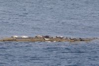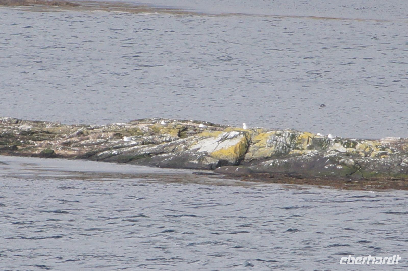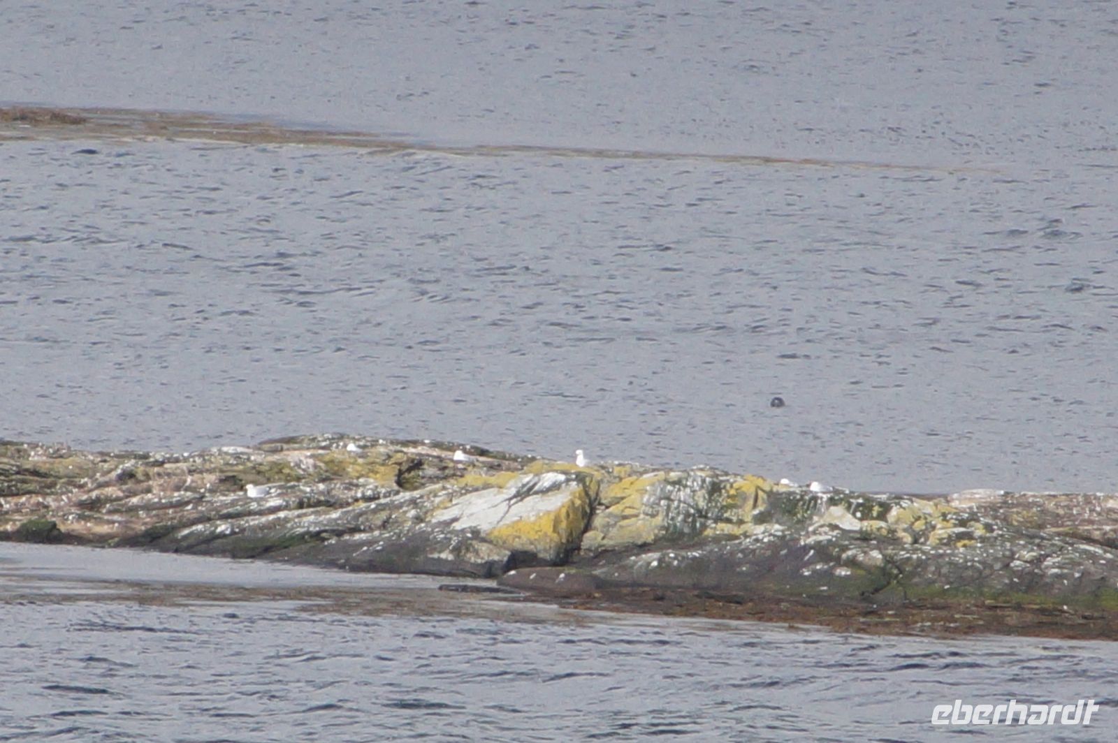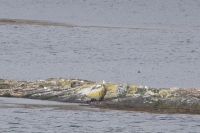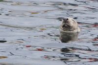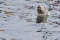 Da drehte sich die Boje uns zu und blinzelte uns aus Kegelrobbenaugen an. Eine zweite, dunkel gefärbte tauchte auf, verschwand aber bald wieder und tauchte wieder auf. Aber die helle Kegelrobbe ließ sich von uns gar nicht stören und streckte ihren Kopf fast regungslos in die Sonne.