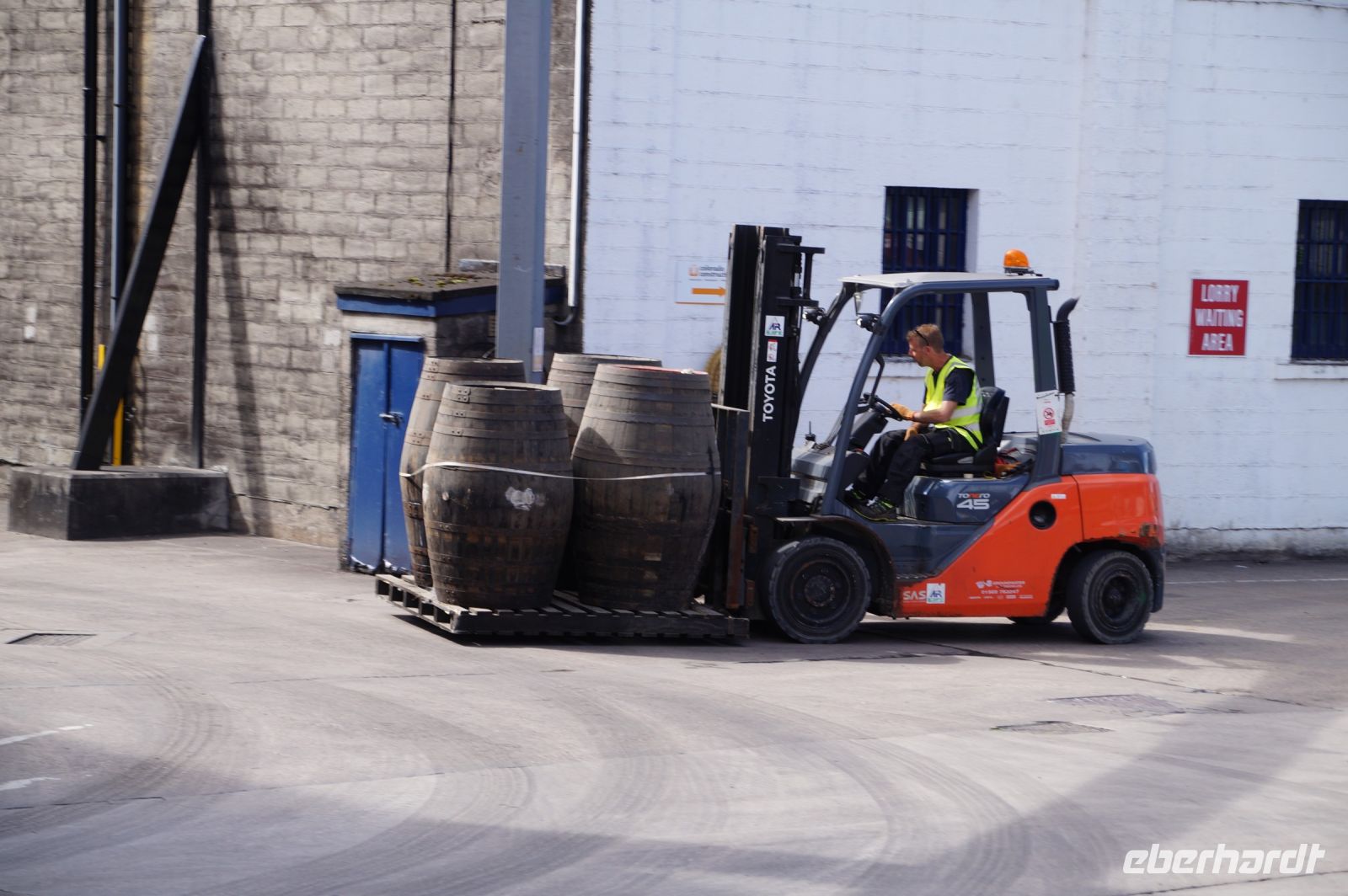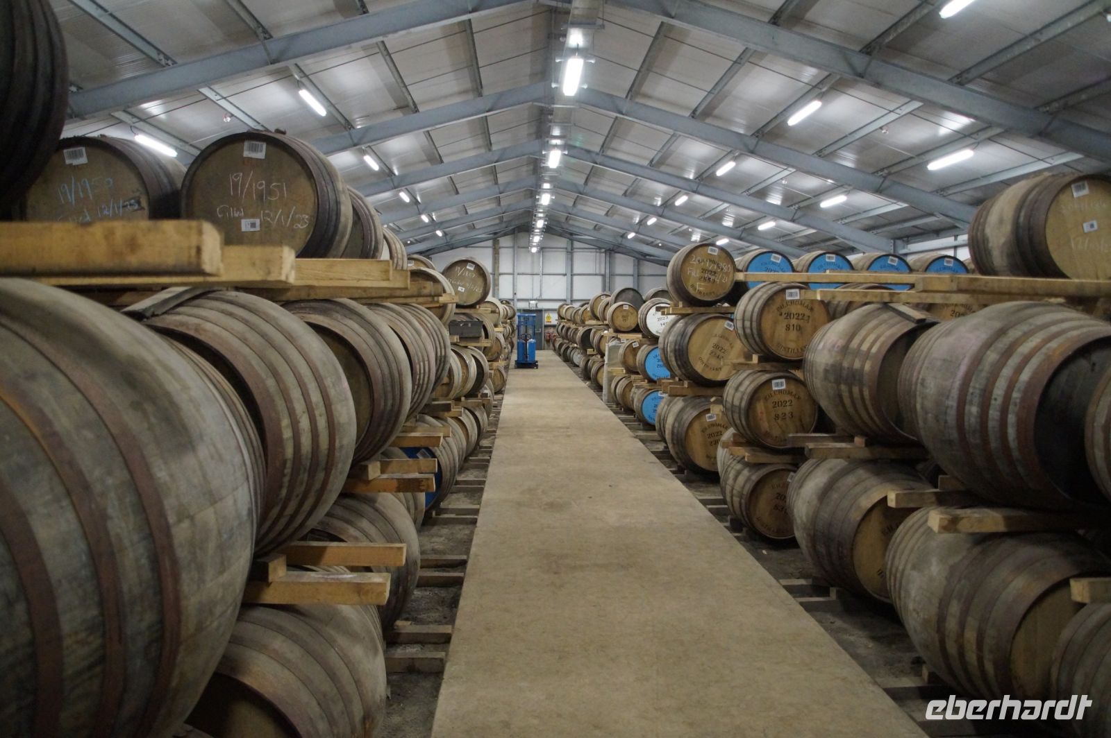 Patrick fuhr uns zu einer noch recht neuen und daher auch recht unbekannten Destille, die noch nicht viele alte Whiskies hat herstellen können: Kilchoman Distillery. Diese wurde 2005 auf einem Ponyhof gegründet, also vor achtzehn Jahren. Später wurde das Ponygestüt dann ganz aufgegeben und die Distiller konnten es aufkaufen und ihre Produktion ausweiten. Dort bekamen wir zunächst ein Whiskyglas geschenkt, dass wir uns junggesellenabschiedsmäßig um den Hals hängen konnten.
