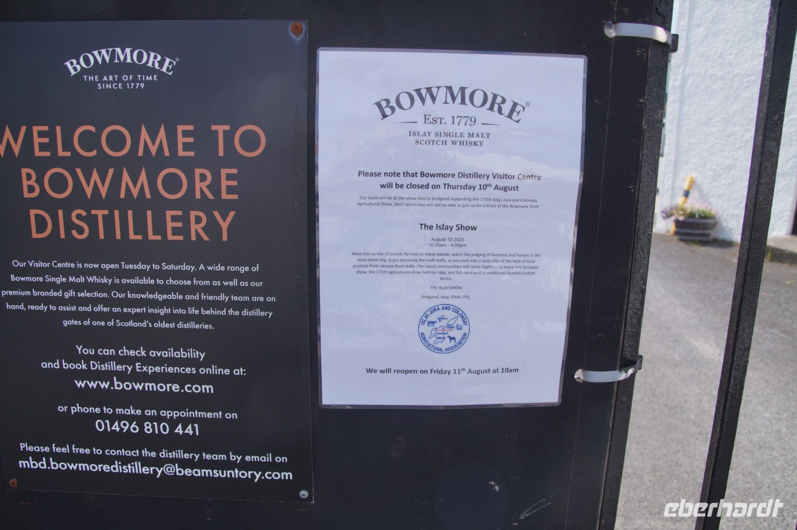 Nach unserem Besuch bei Kilchoman fuhren wir zunächst in die Inselhauptstadt Bowmore. Aber die gleichnamige Destillerie dort hatte geschlossen. Wegen einer Landwirtschaftsmesse auf der Insel. Patrick meinte: von 365 Tagen im Jahr nimmt die Dewstillerei an 360 Tagen Besucher entgegen. Er hätte noch nie erlebt, dass sie geschlossen sei.