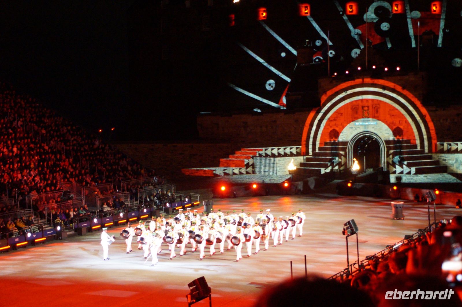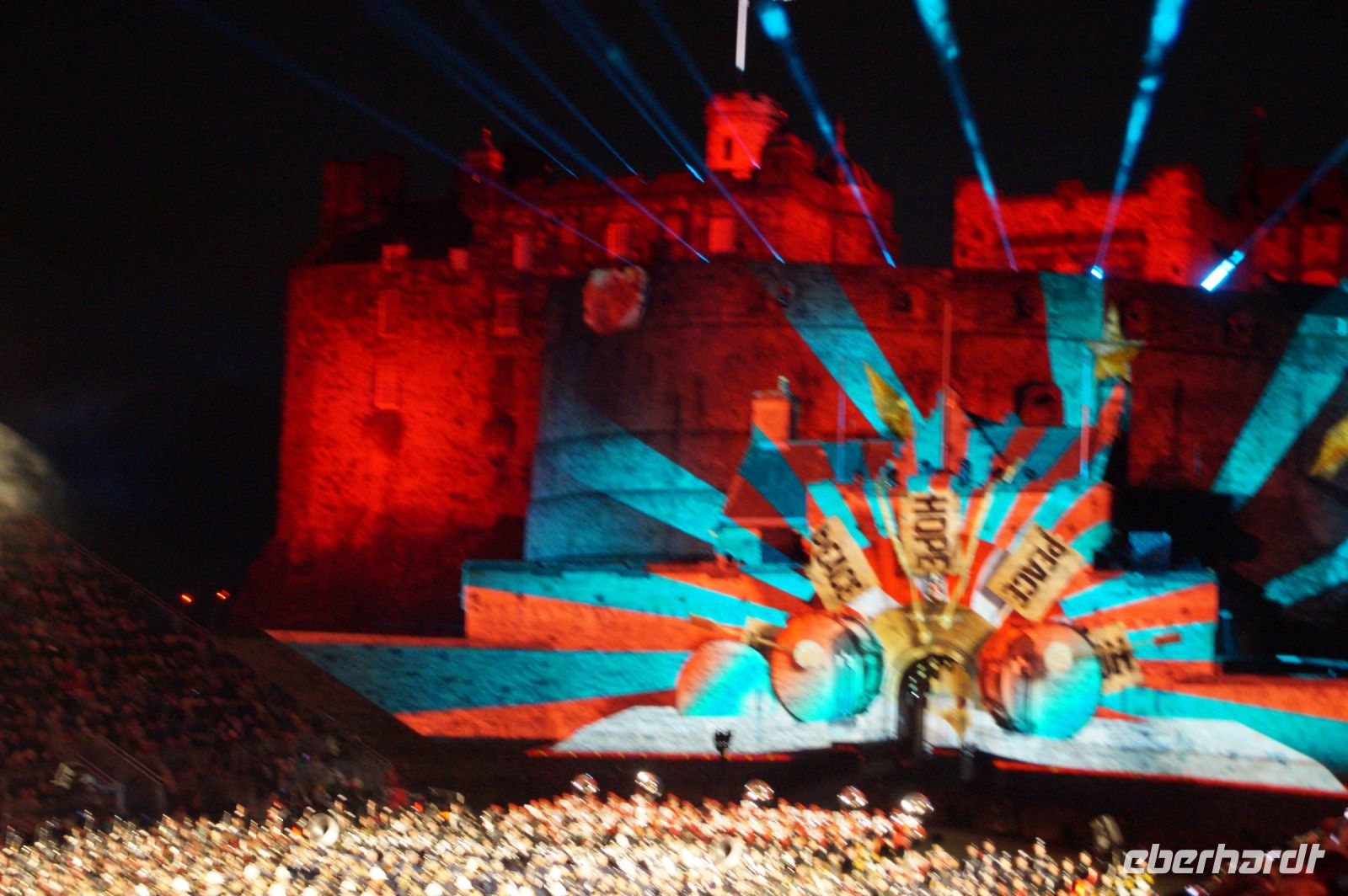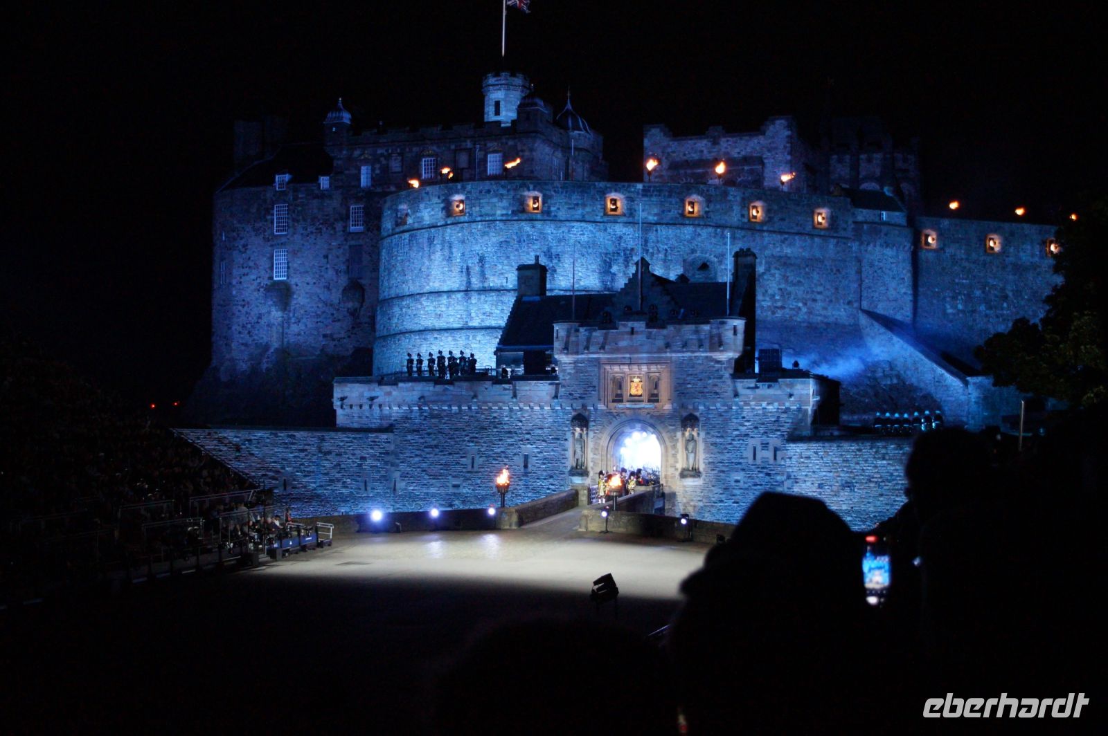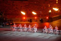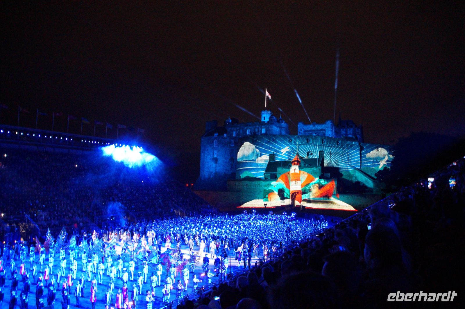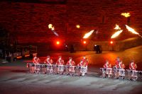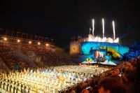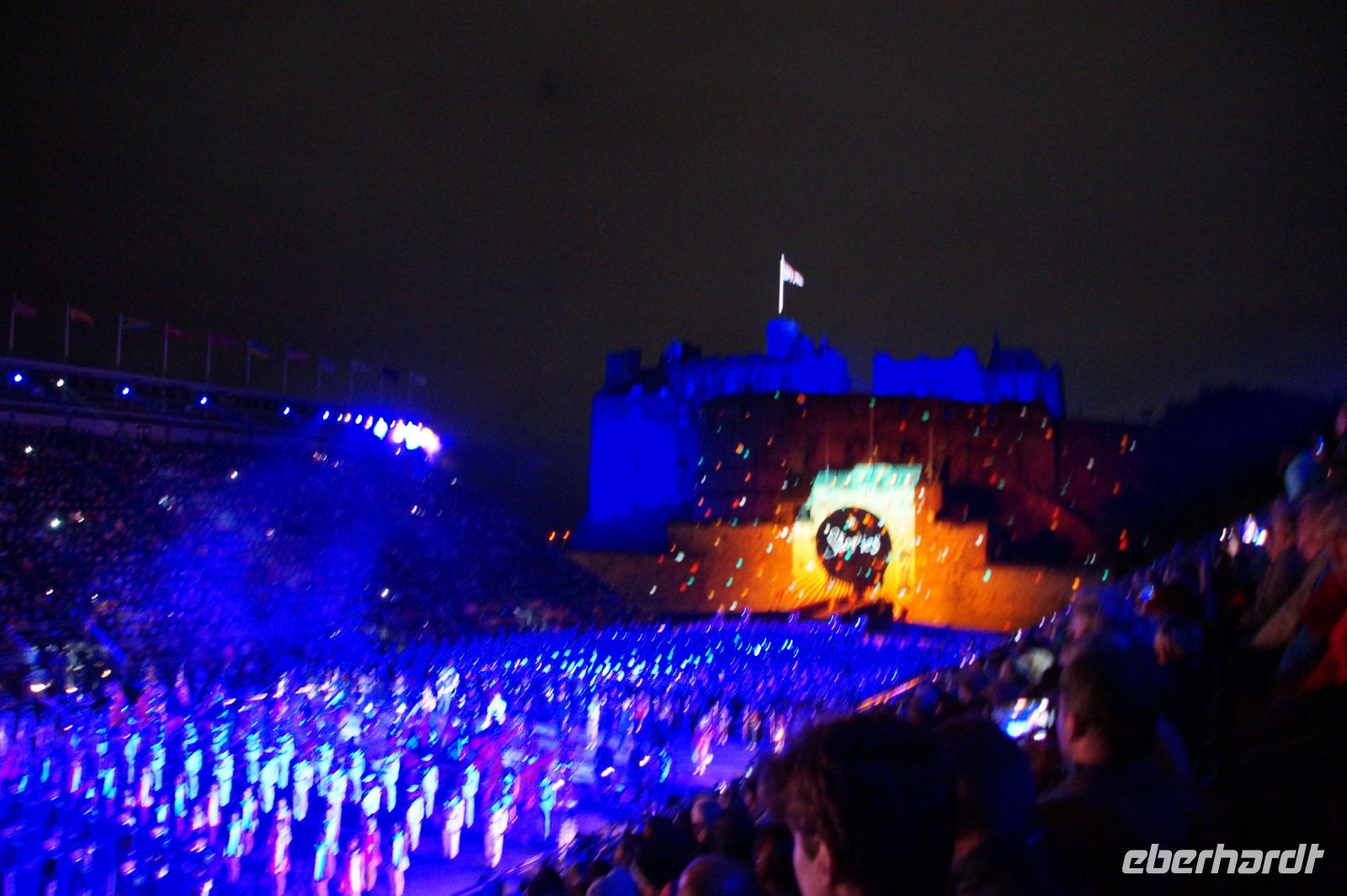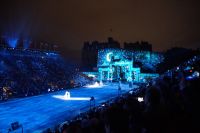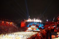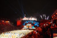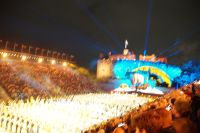 Natürlich waren wieder jede Menge Dudelsackspieler und Trommler dabei, wie sich das für das RMT gehört, aber das Line-Up schien mir dieses Jahr etwas dünner als sonst. Stammgäste wie Top Secret aus der Schweiz und die amerikanische Präsidentengarde fehlten (dafür war die United States Air Force Band dabei), die Norweger, die Schweizer und Trinidad und Tobago hatten Artisten geschickt. Die Burg diente wie immer als Kulisse und als Leinwand.