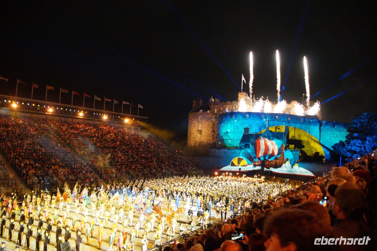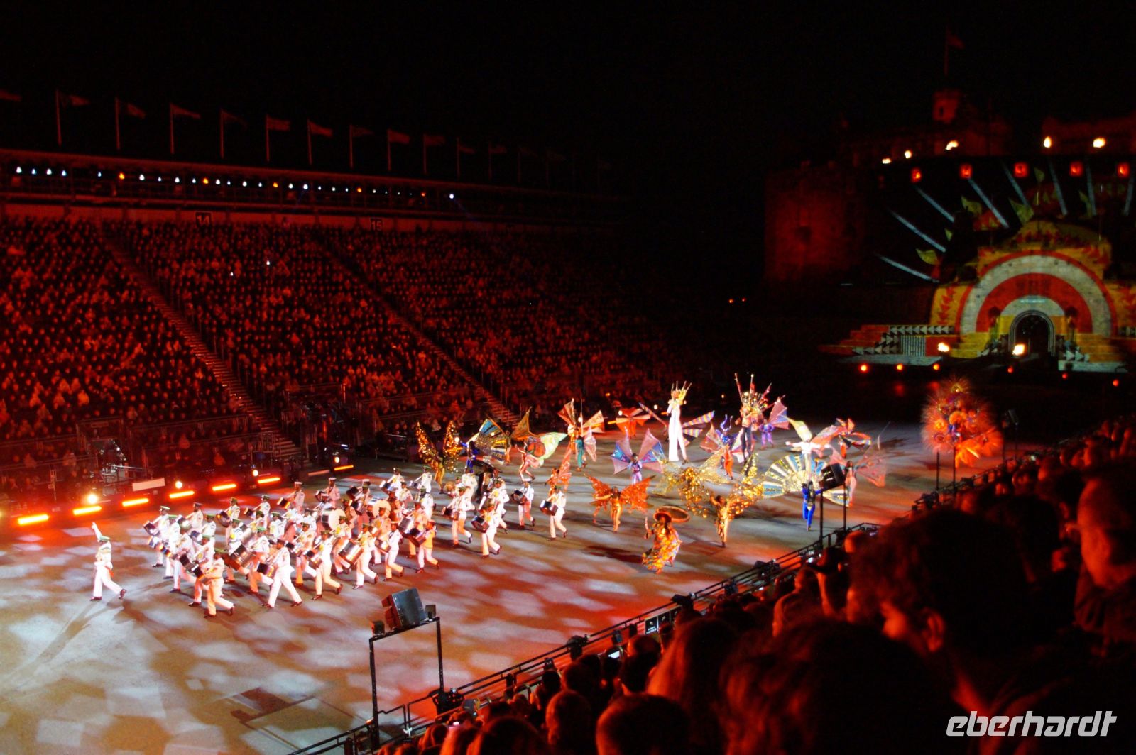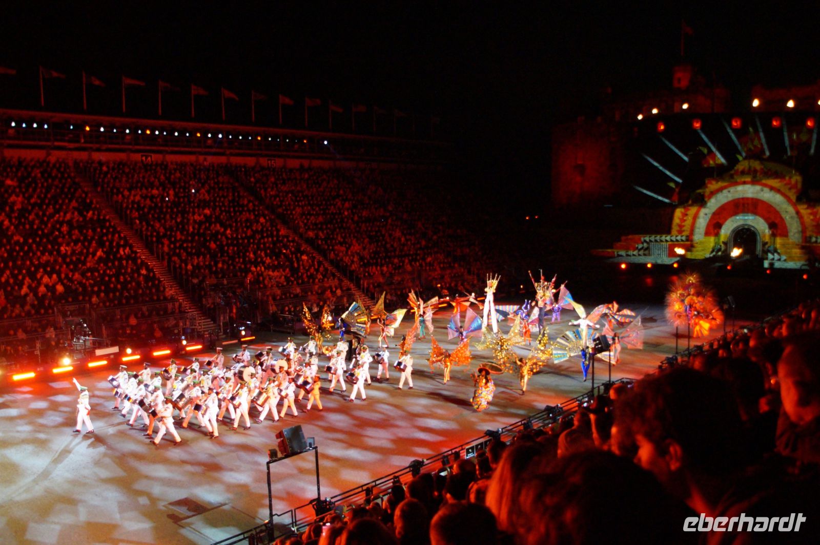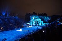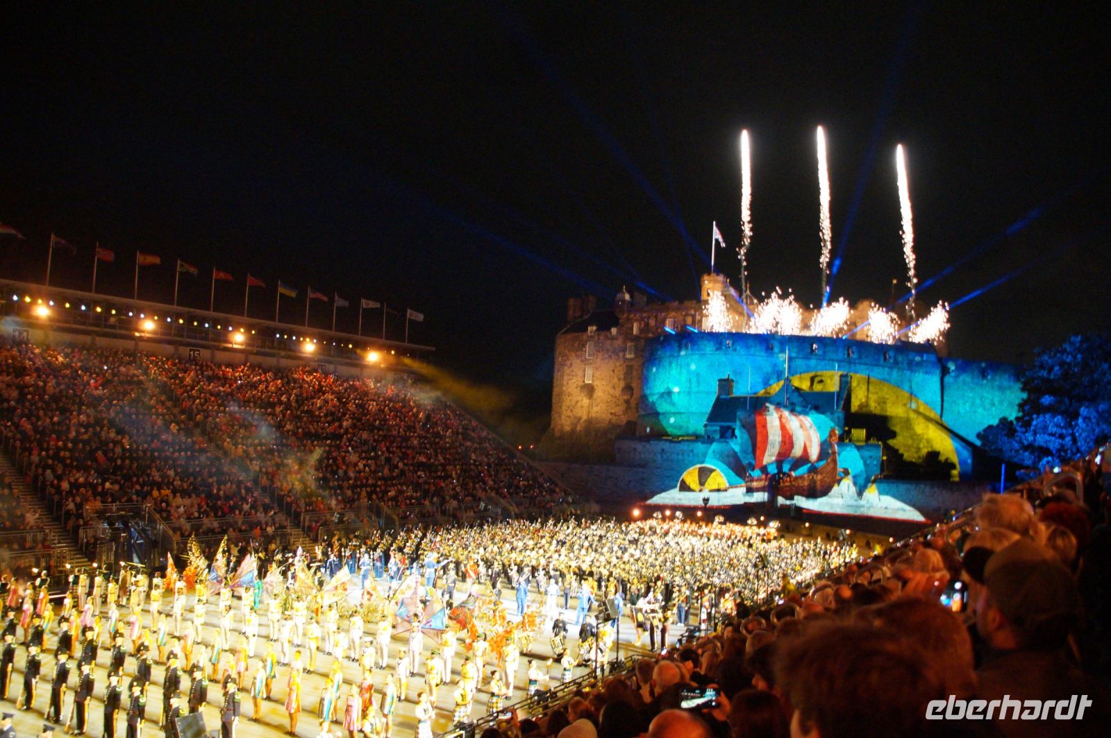 Natürlich waren wieder jede Menge Dudelsackspieler und Trommler dabei, wie sich das für das RMT gehört, aber das Line-Up schien mir dieses Jahr etwas dünner als sonst. Stammgäste wie Top Secret aus der Schweiz und die amerikanische Präsidentengarde fehlten (dafür war die United States Air Force Band dabei), die Norweger, die Schweizer und Trinidad und Tobago hatten Artisten geschickt. Die Burg diente wie immer als Kulisse und als Leinwand.