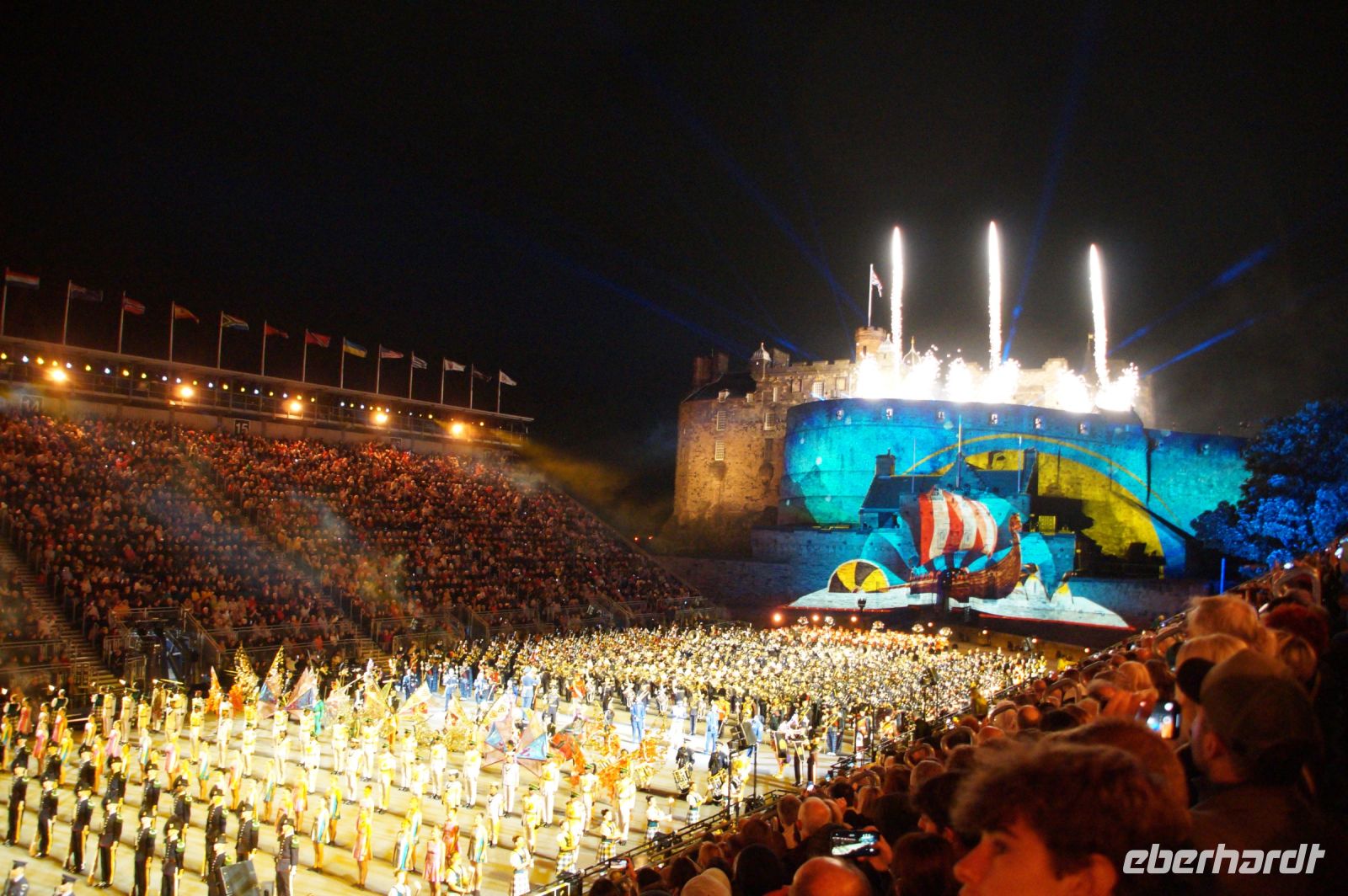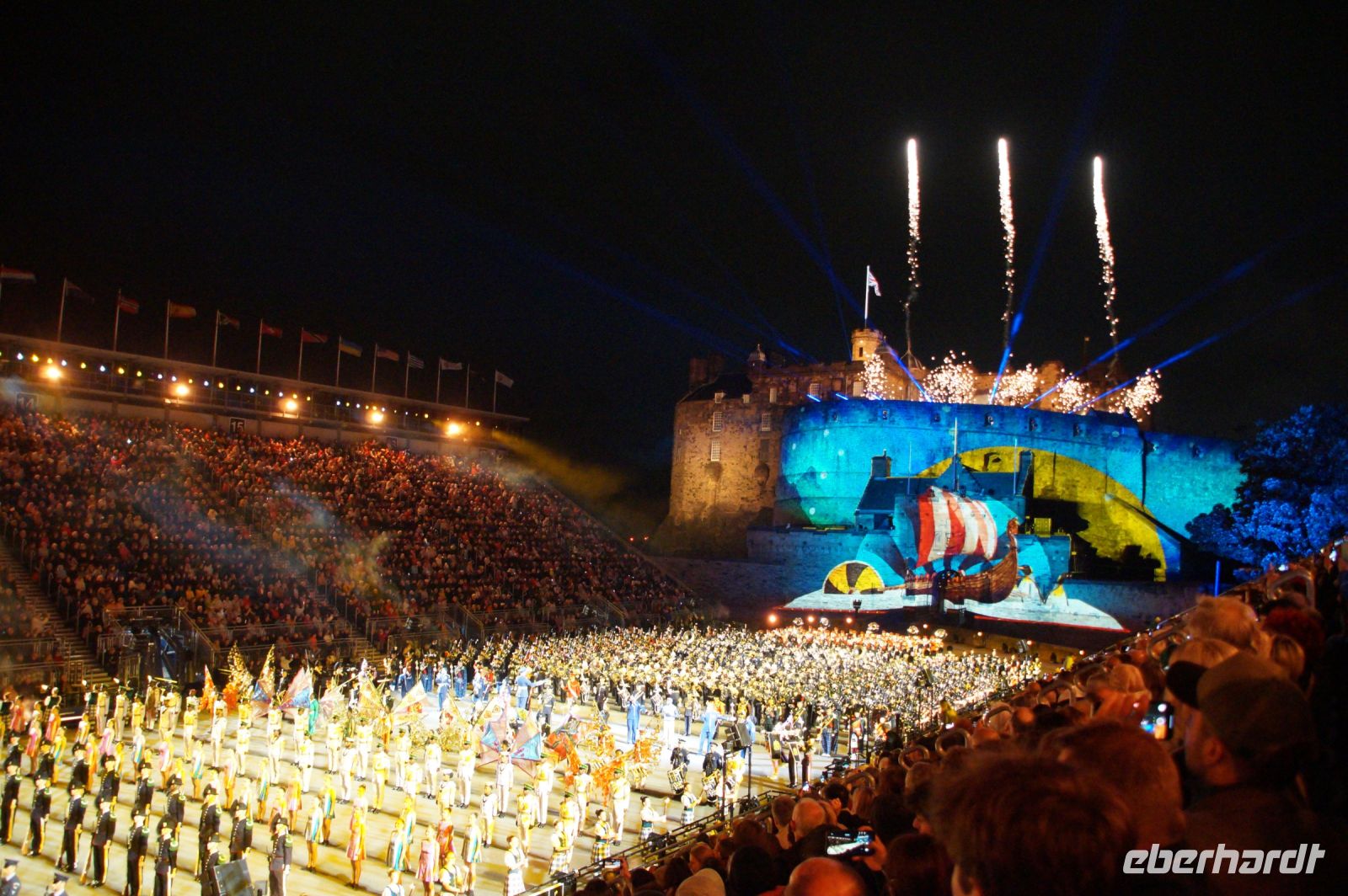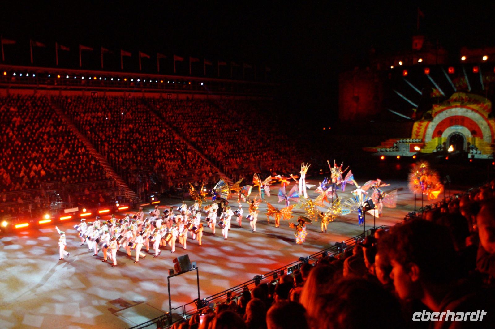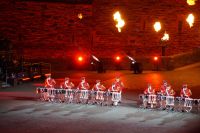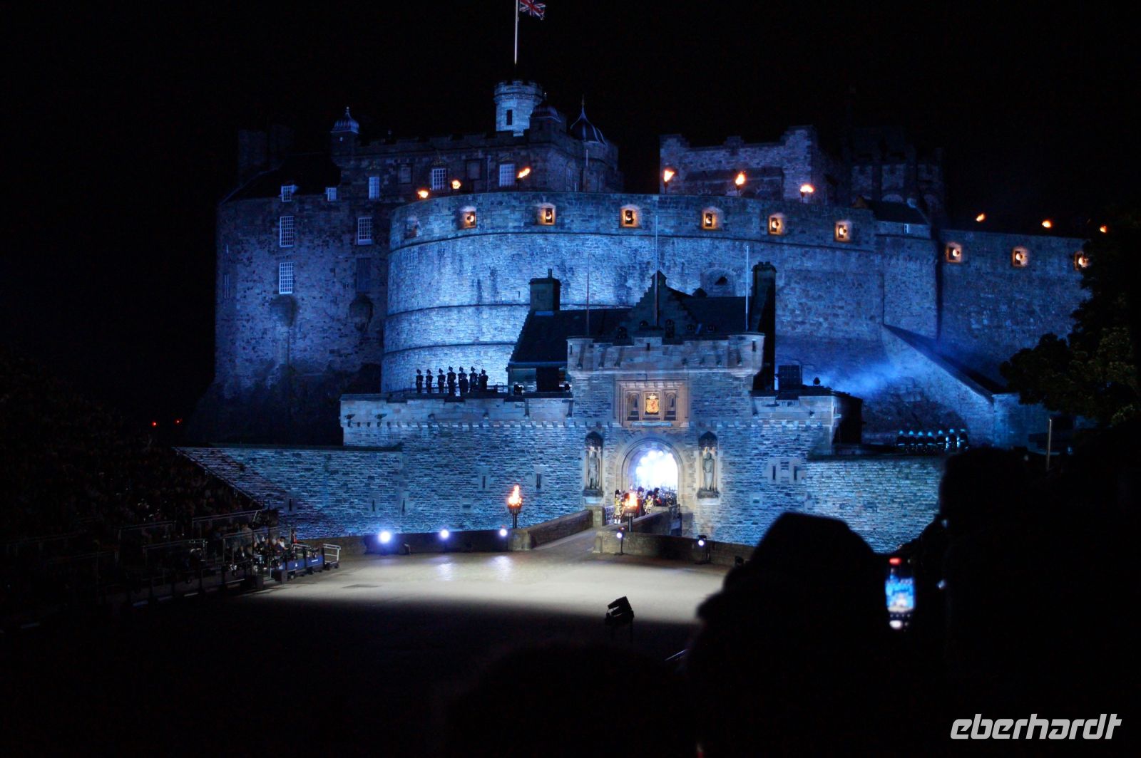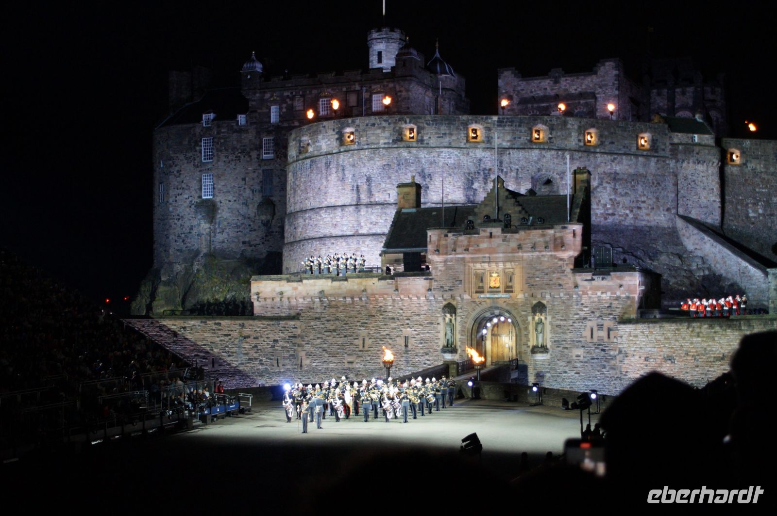 Natürlich waren wieder jede Menge Dudelsackspieler und Trommler dabei, wie sich das für das RMT gehört, aber das Line-Up schien mir dieses Jahr etwas dünner als sonst. Stammgäste wie Top Secret aus der Schweiz und die amerikanische Präsidentengarde fehlten (dafür war die United States Air Force Band dabei), die Norweger, die Schweizer und Trinidad und Tobago hatten Artisten geschickt. Die Burg diente wie immer als Kulisse und als Leinwand.