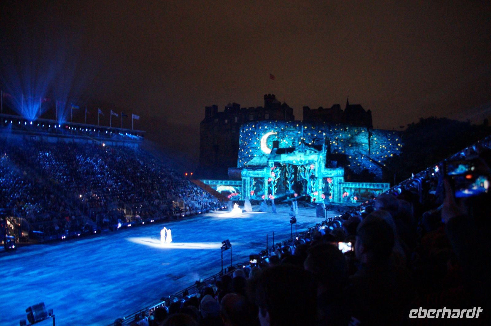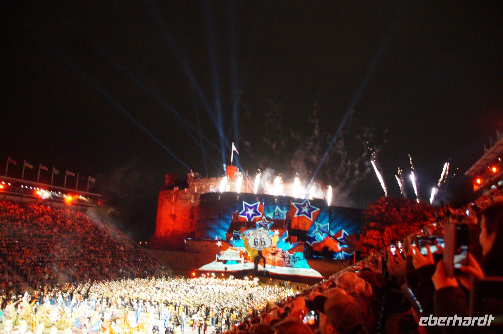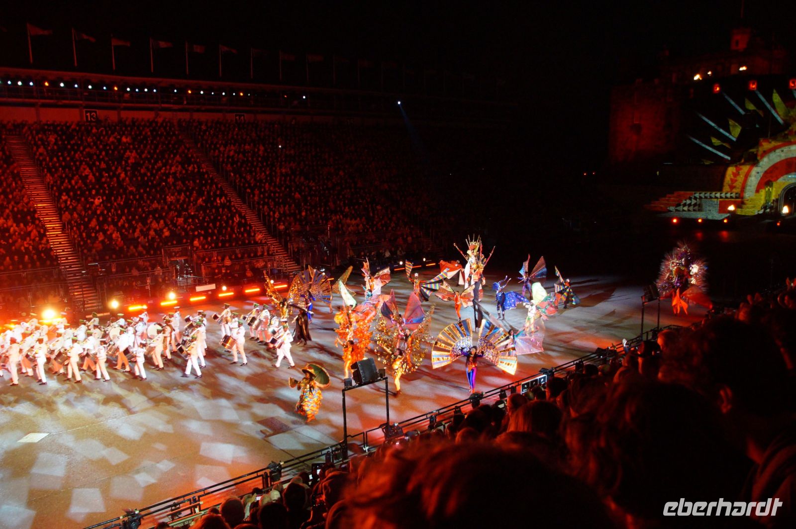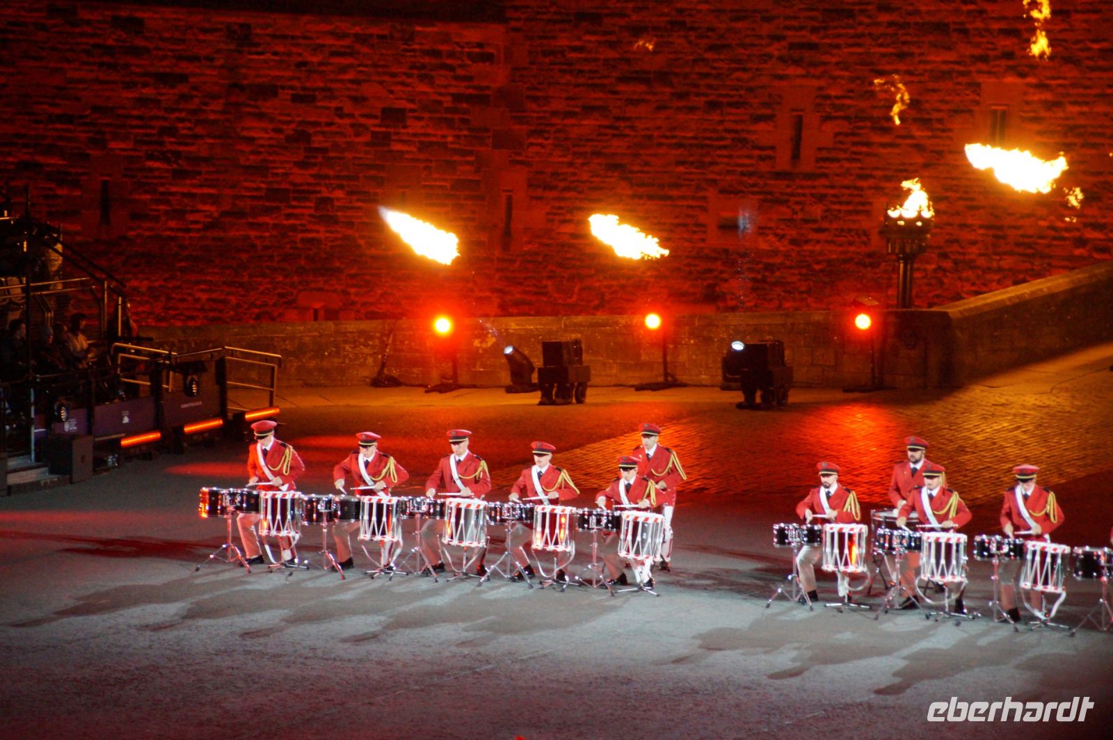Natürlich waren wieder jede Menge Dudelsackspieler und Trommler dabei, wie sich das für das RMT gehört, aber das Line-Up schien mir dieses Jahr etwas dünner als sonst. Stammgäste wie Top Secret aus der Schweiz und die amerikanische Präsidentengarde fehlten (dafür war die United States Air Force Band dabei), die Norweger, die Schweizer und Trinidad und Tobago hatten Artisten geschickt. Die Burg diente wie immer als Kulisse und als Leinwand.