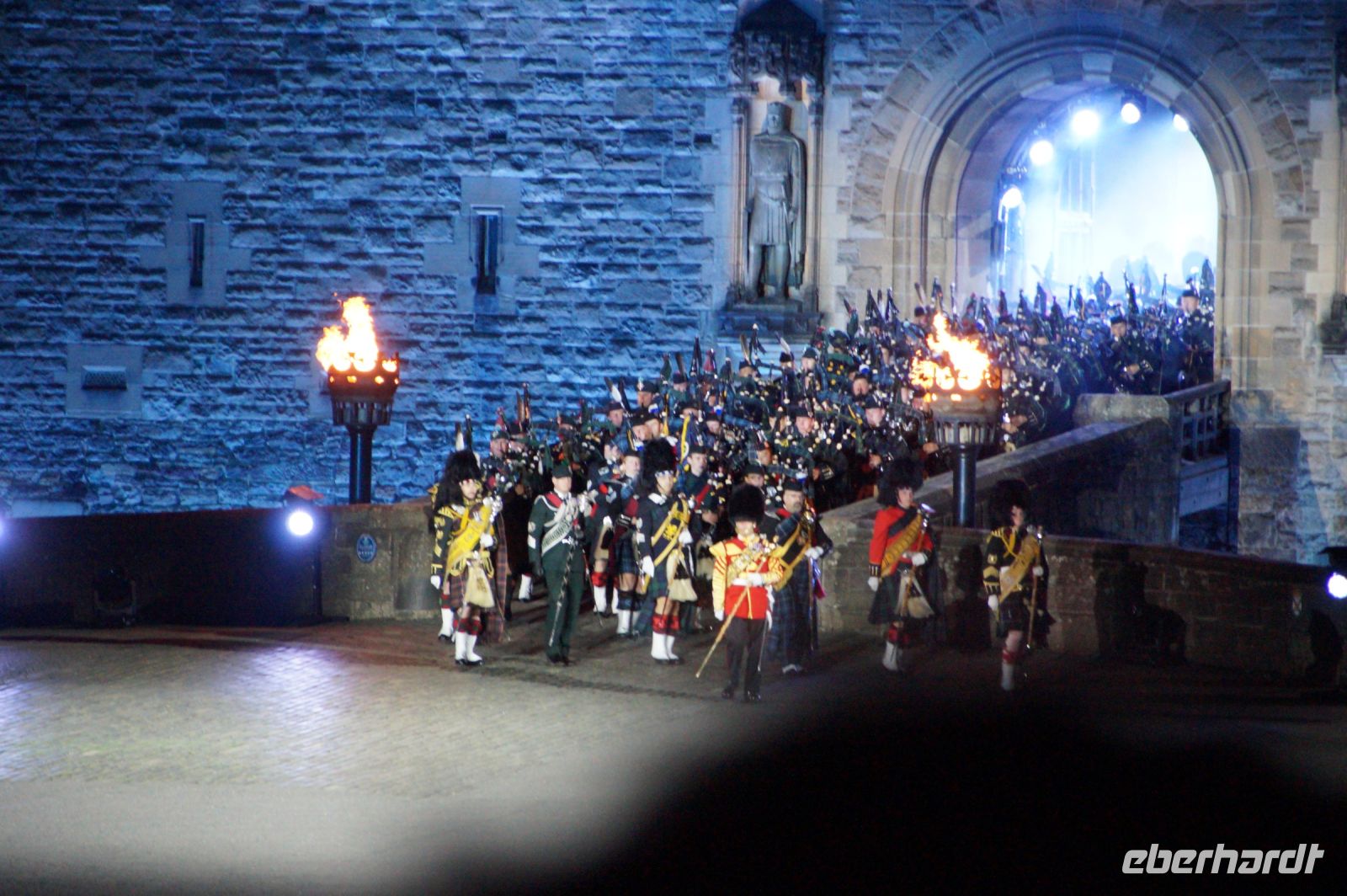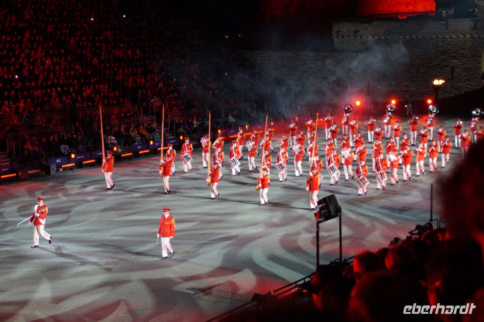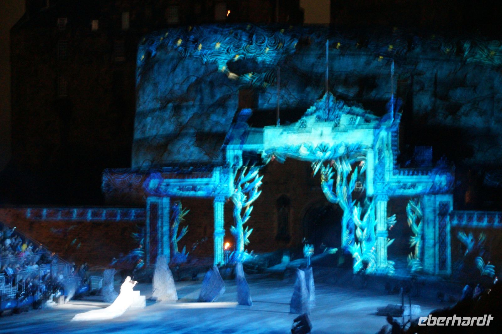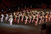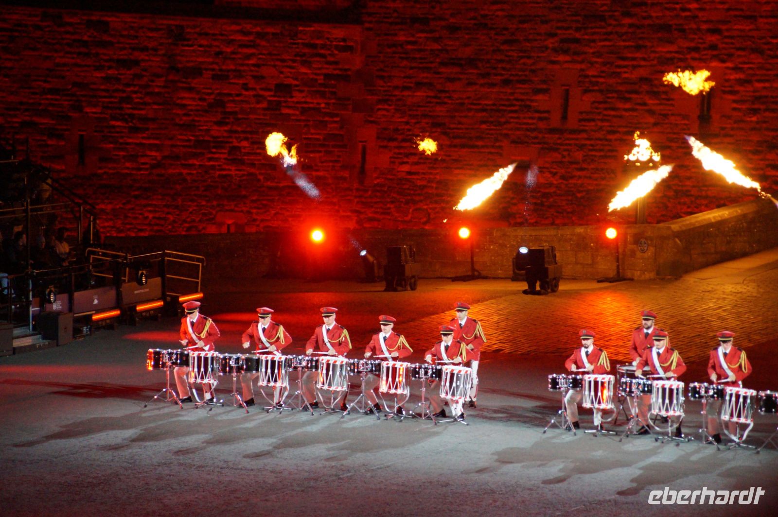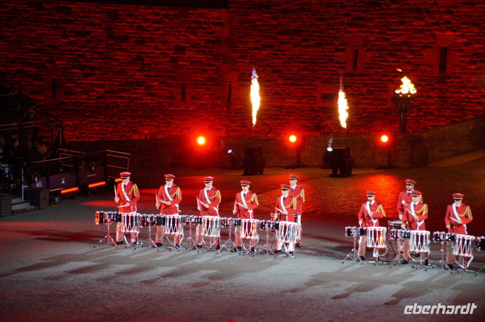 Natürlich waren wieder jede Menge Dudelsackspieler und Trommler dabei, wie sich das für das RMT gehört, aber das Line-Up schien mir dieses Jahr etwas dünner als sonst. Stammgäste wie Top Secret aus der Schweiz und die amerikanische Präsidentengarde fehlten (dafür war die United States Air Force Band dabei), die Norweger, die Schweizer und Trinidad und Tobago hatten Artisten geschickt. Die Burg diente wie immer als Kulisse und als Leinwand.