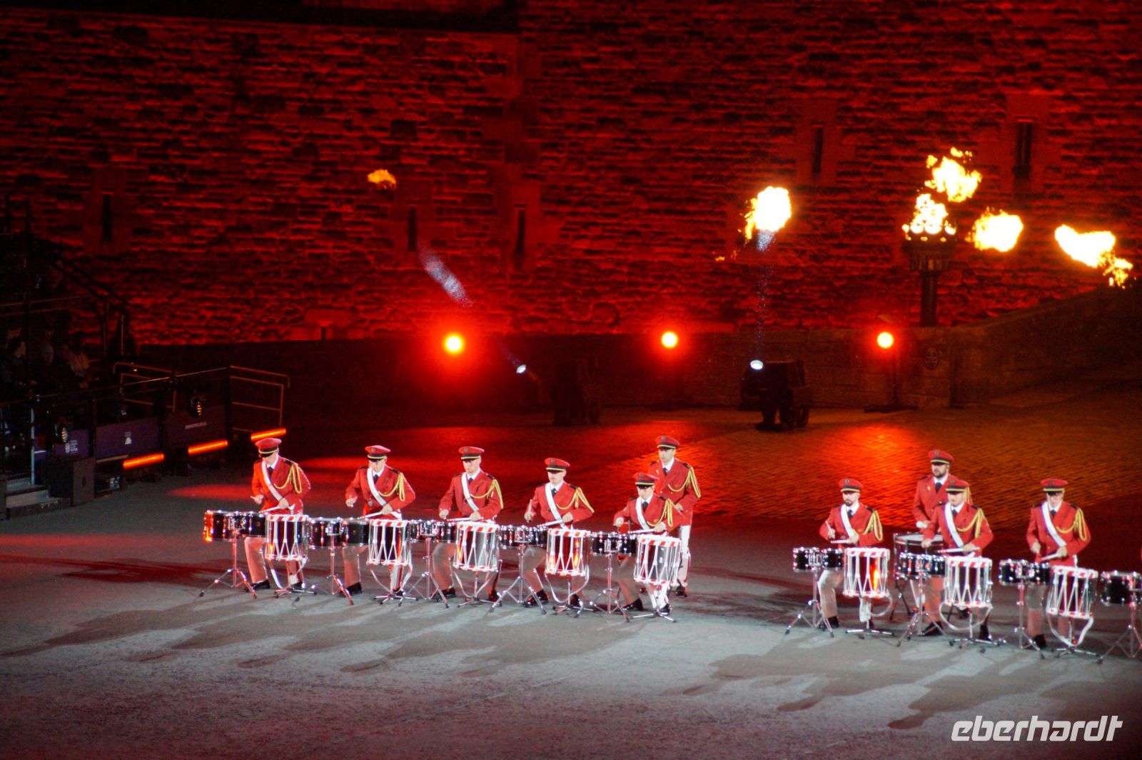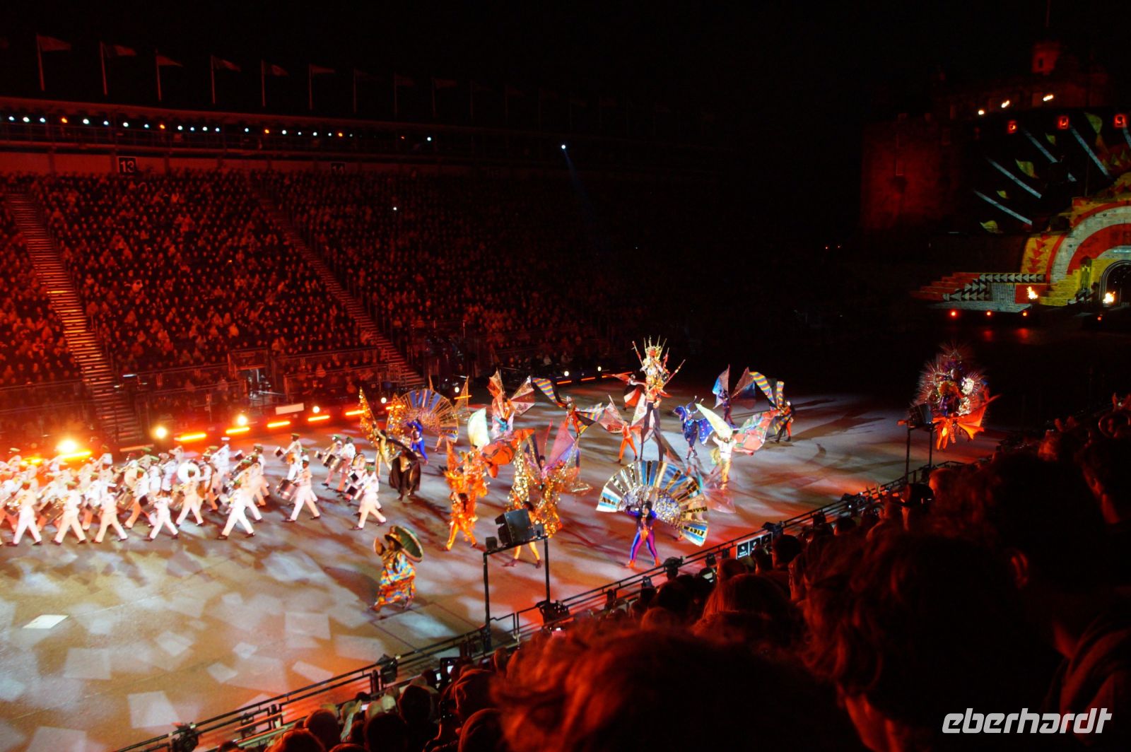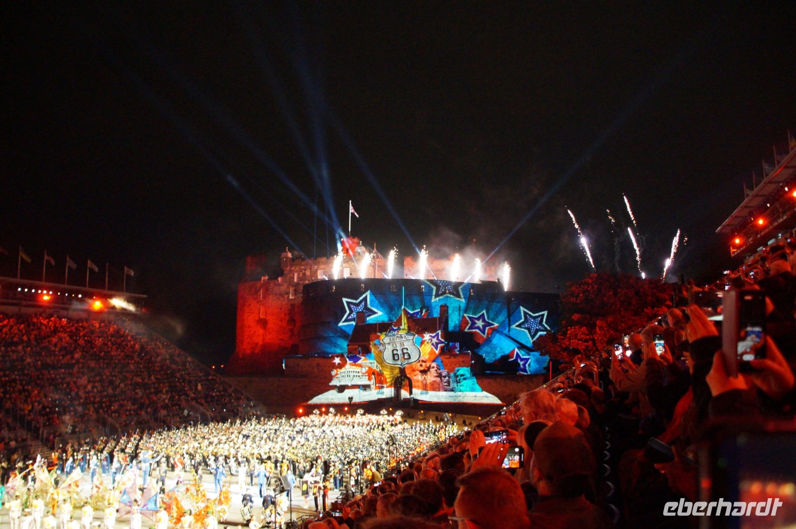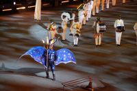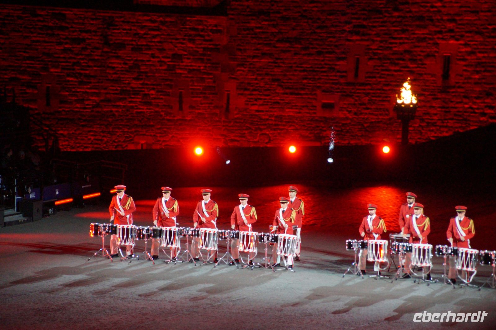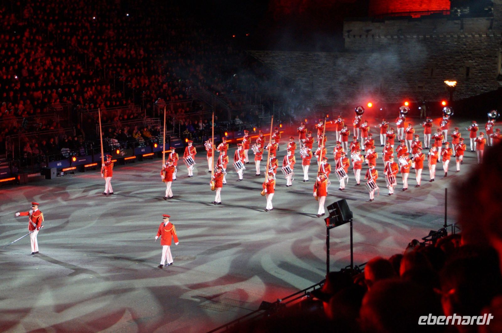 Natürlich waren wieder jede Menge Dudelsackspieler und Trommler dabei, wie sich das für das RMT gehört, aber das Line-Up schien mir dieses Jahr etwas dünner als sonst. Stammgäste wie Top Secret aus der Schweiz und die amerikanische Präsidentengarde fehlten (dafür war die United States Air Force Band dabei), die Norweger, die Schweizer und Trinidad und Tobago hatten Artisten geschickt. Die Burg diente wie immer als Kulisse und als Leinwand.